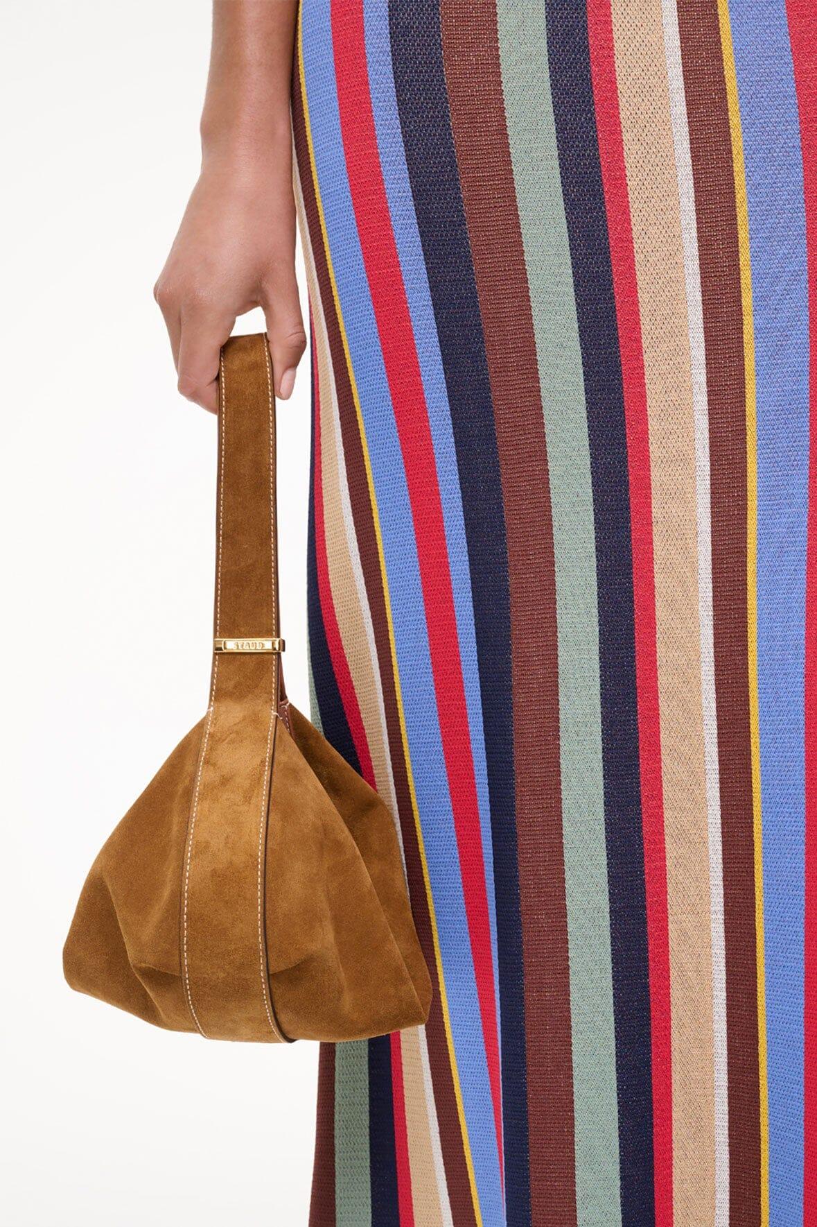 The Demy Shoulder Bag is a chic convertible bag that can be worn over the shoulder or hand held. It features signature hardware clasp on the strap to convert the shape to a handheld pouch. This style features a suede leather body, a top zipper, and signature hardware.