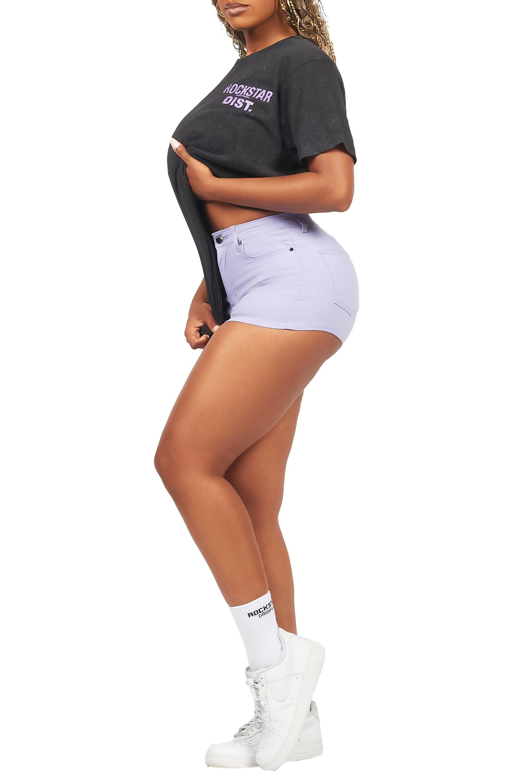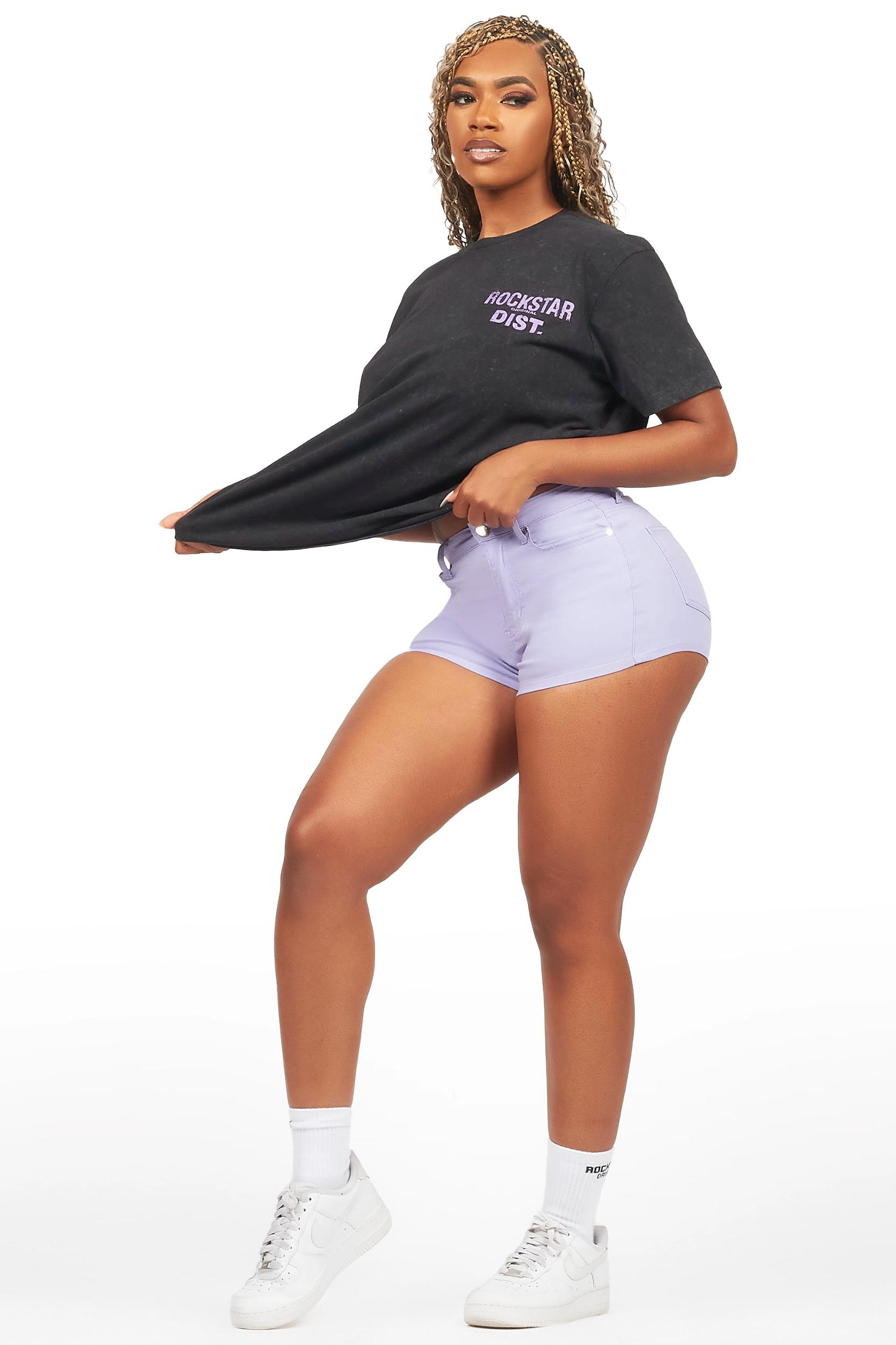 An urban two-piece graphic tee and denim short set for women. Designed with organic cotton and custom detailing for the perfect streetwear set. Rounded neckline Short sleeves Pullover style Regular-fit Zip fly with button closure 5-pocket build Form-fitting silhouette Stretch fabric Printed RSO logo