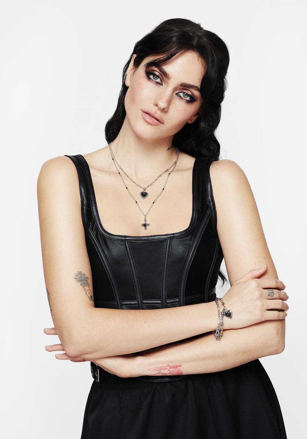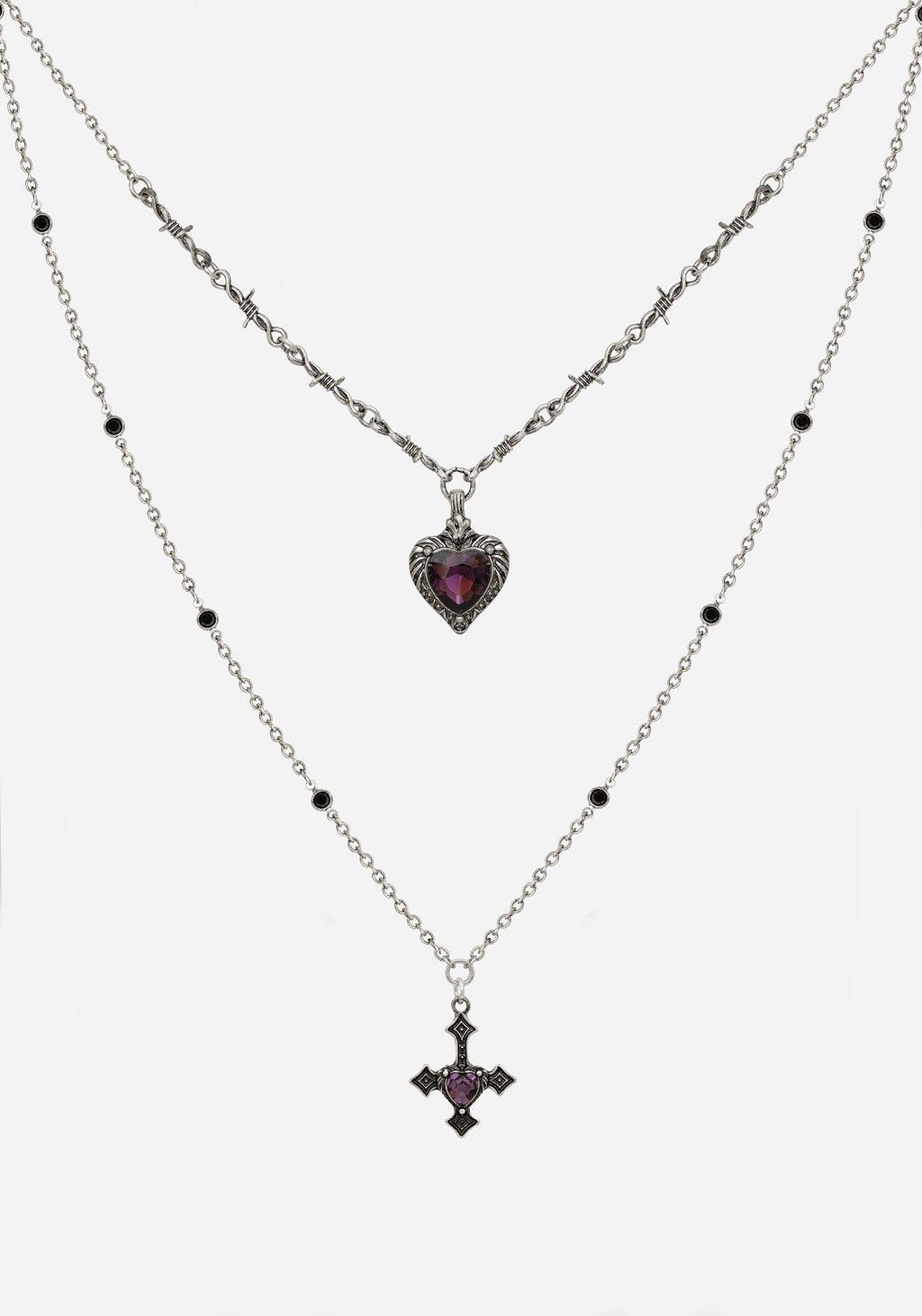 Silver Layered Necklace Heart and Cross Pendants Barbed Wire Short Chain Black Gem Adorned Longer Chain Faux Purple Stone 41cm, 51cm + 8cm 50% Zinc, 30% Glass ,20% Iron