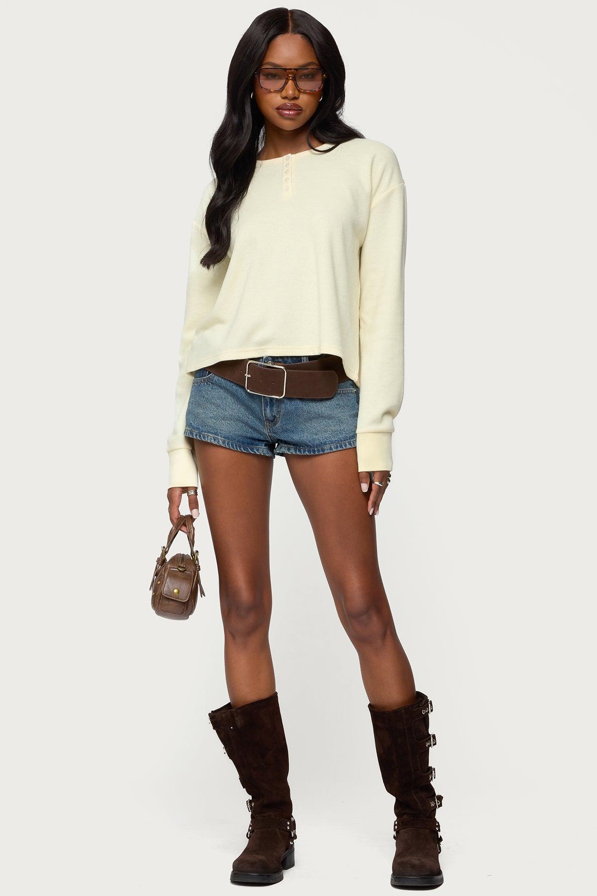 Top Long sleeves Henley design Waffle fabric Polyester, Cotton, Spandex Model wears size S Model height is 5'9 Item care: Machine wash at maximum 30ºC, wash with similar colors, do not bleach, do not tumble dry, iron at a maximum of 110ºC, do not dry clean