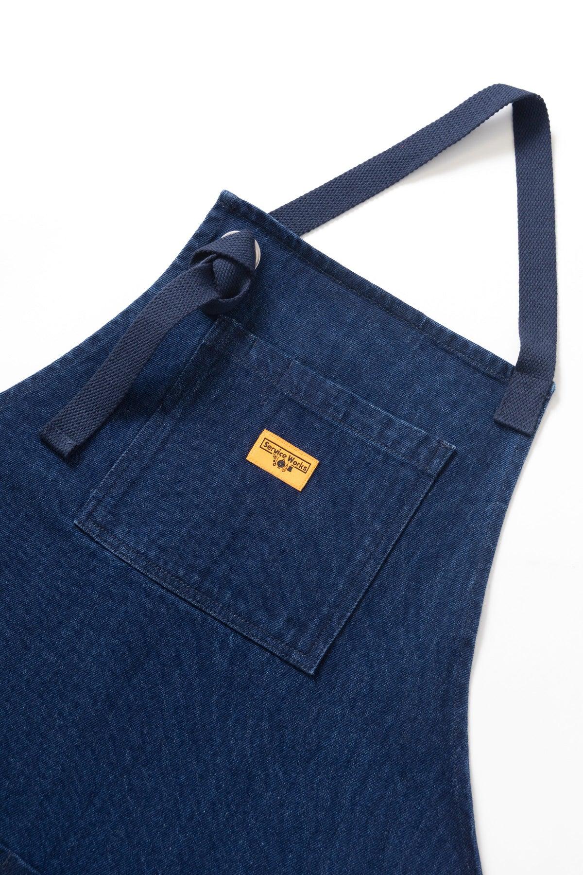 Denim Apron by Service Works Constructed from 12oz GOTS Organic denim Classic cooks apron Adjustable neck strap Central chest pocket with double pen pocket Deep lower waist pockets and towel strap