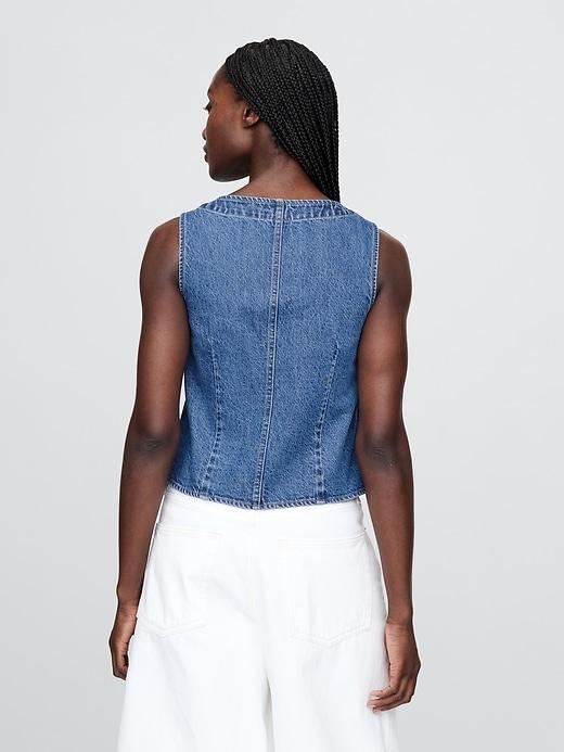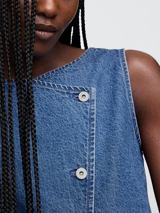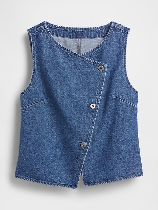 Authentic, non-stretch denim vest. Round neck. Sleeveless. Asymmetrical button front. Back seam and princess darts. Medium wash. Responsibly Made: This denim vest is made with 5% recycled cotton and is part of our Washwell program, which uses at least 20% less water as compared with conventional wash methods. We’ve saved over a billion liters of water through Washwell since 2016. This product was made in a factory that invests in gender equality and women’s empowerment. Through RISE (Reimagining Industry to Support Equality) and Gap Inc.’s program P.A.C.E. (Personal Advancement & Career Enhancement), we support people who make our clothes to build the skills, knowledge, confidence, and resilience needed to advance in work and life. Learn more here. #799677