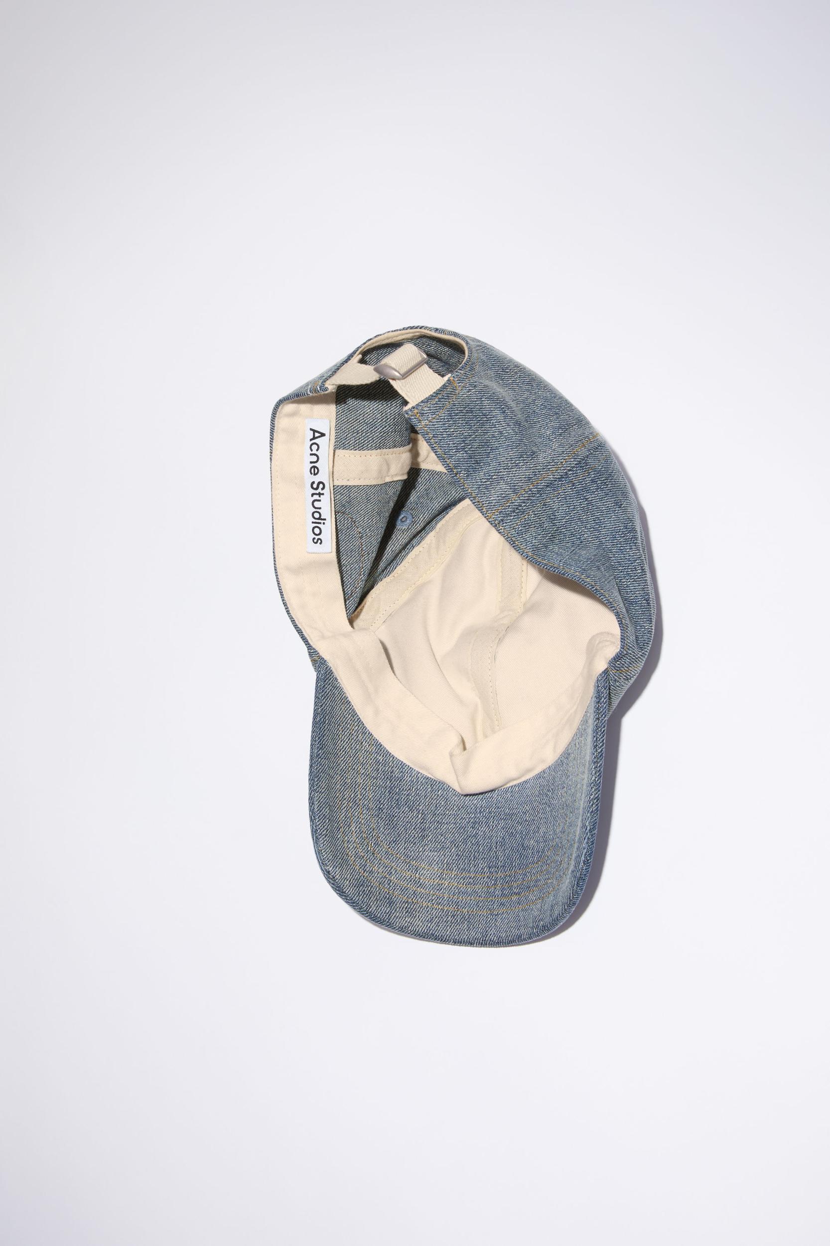 Acne Studios mid blue six-panel baseball cap is crafted from denim with a washed finish made of cotton, detailed with an Acne Studios logo patch. Complete with an adjustable contrast buckle closure at the back. FN-UX-HATS000203