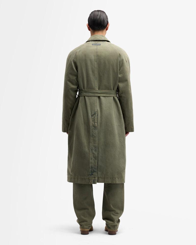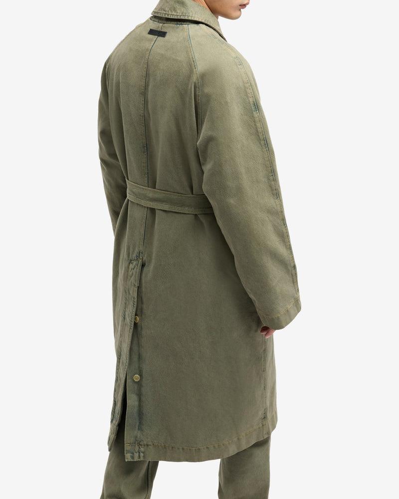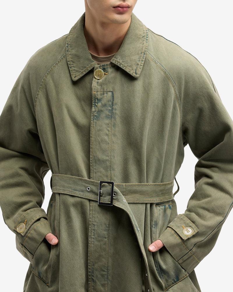 Fits like: Designed for layering, with generous room through the sleeve and body. Feels like: Rigid denim that holds its shape while evolving into a softer, more lived-in fit over time. The Details: Olive wash with a soft, lived-in look Detachable self-belt with tonal metal hardware Raglan sleeves and relaxed drape for