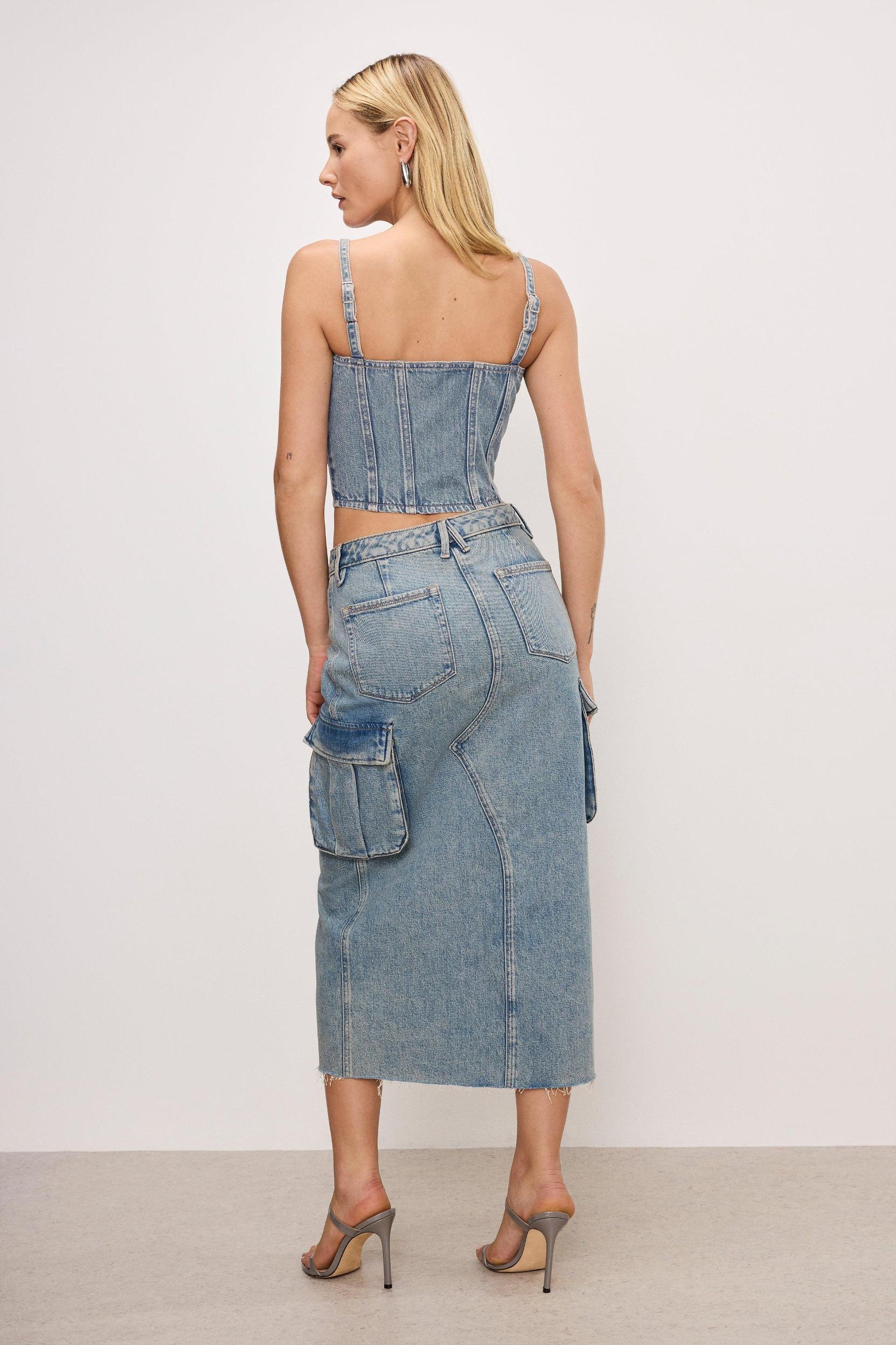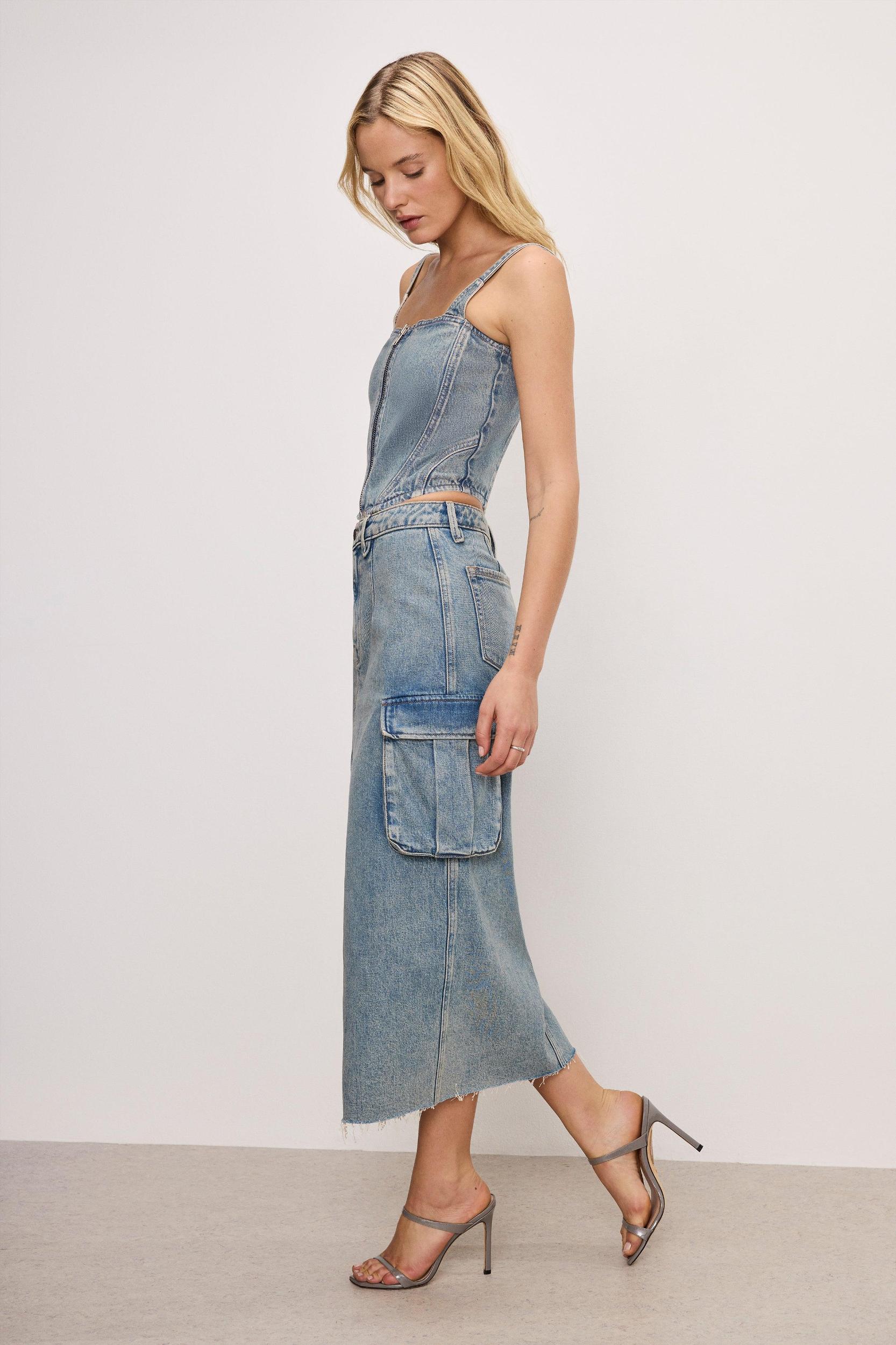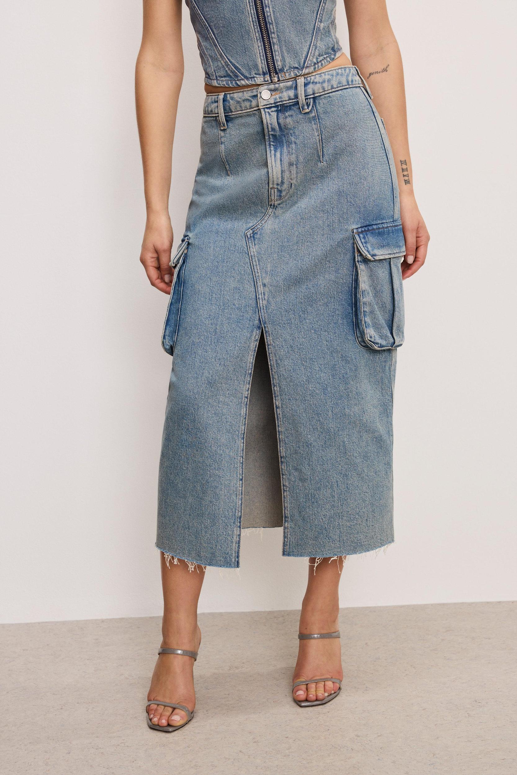 Our Denim Cargo Skirt is edgy yet effortless. Side pockets create a ladiback, utlity vibe while the front slit brings a touch of attitude. It strikes the perfect balance between cool and confident. Don't overthink it, throw it on to make a statement. High-rise Front zip-fly closure Back and cargo pockets Reinforced belt loops Maxi length Fabric: 79% Cotton, 20% Re-Cycled Cotton, 1% Elastane
