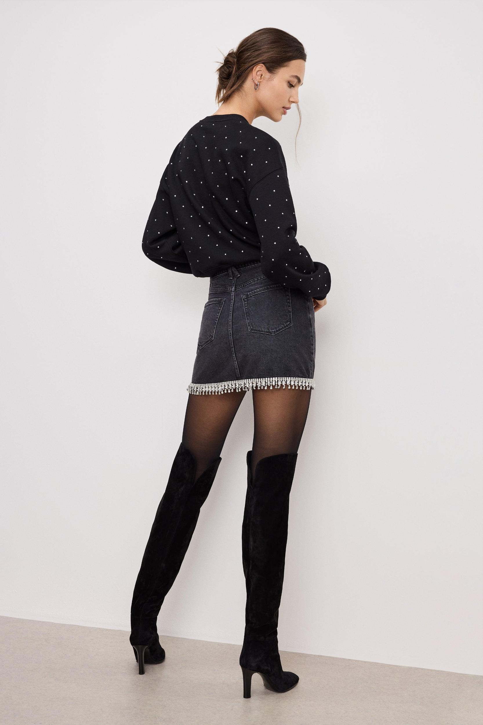 Elevate your everyday style with the Denim Crystal Trim Skirt. Featuring a high-rise, this mini skirt effortlessly transitions from day to night with eye-catching crystal trim at the hem. Crafted from our comfort denim with a hint of stretch, it offers a timeless and comfortable fit that holds its shape over time. High-rise Front zip-fly closure Classic 5-pockets Crystal trim Fabric: 79% Cotton, 20% Recycled Cotton, 1% LYCRA® Care: Machine wash cold, inside out. Dry flat or hang dry. For more info, please see our denim care guide. Model size 0 is 5'7 and wearing size 0