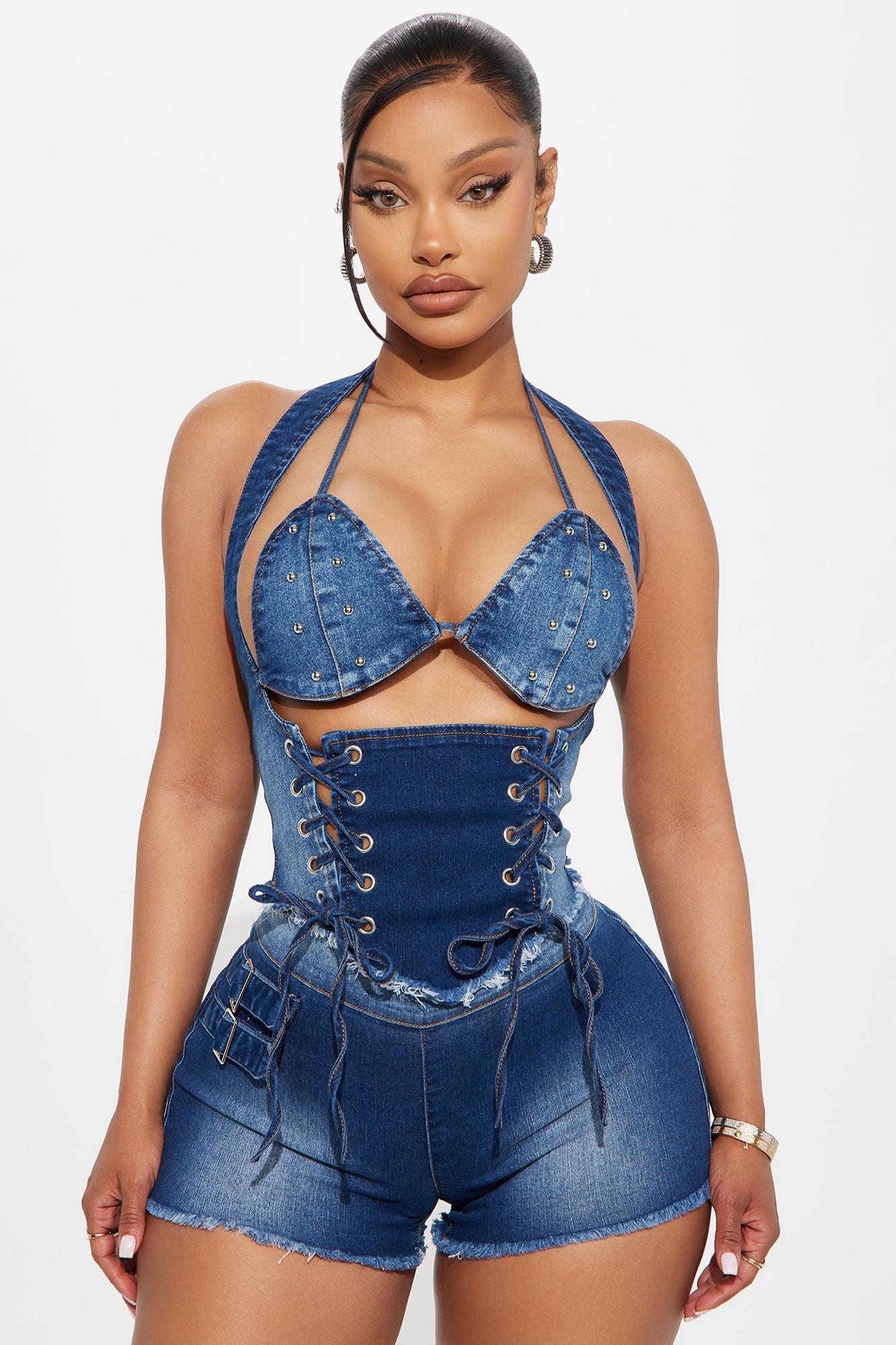 Available In Medium Wash. Halter Top And Short Set Stretch Disclaimer: Due To The Specialized Wash & Distressing Process, Each Garment Is Unique. Self: 74% Cotton 23% Polyester 2% Viscose 1% Spandex Imported California Proposition 65WARNING: Cancer and Reproductive Harm - www.P65Warnings.ca.gov.