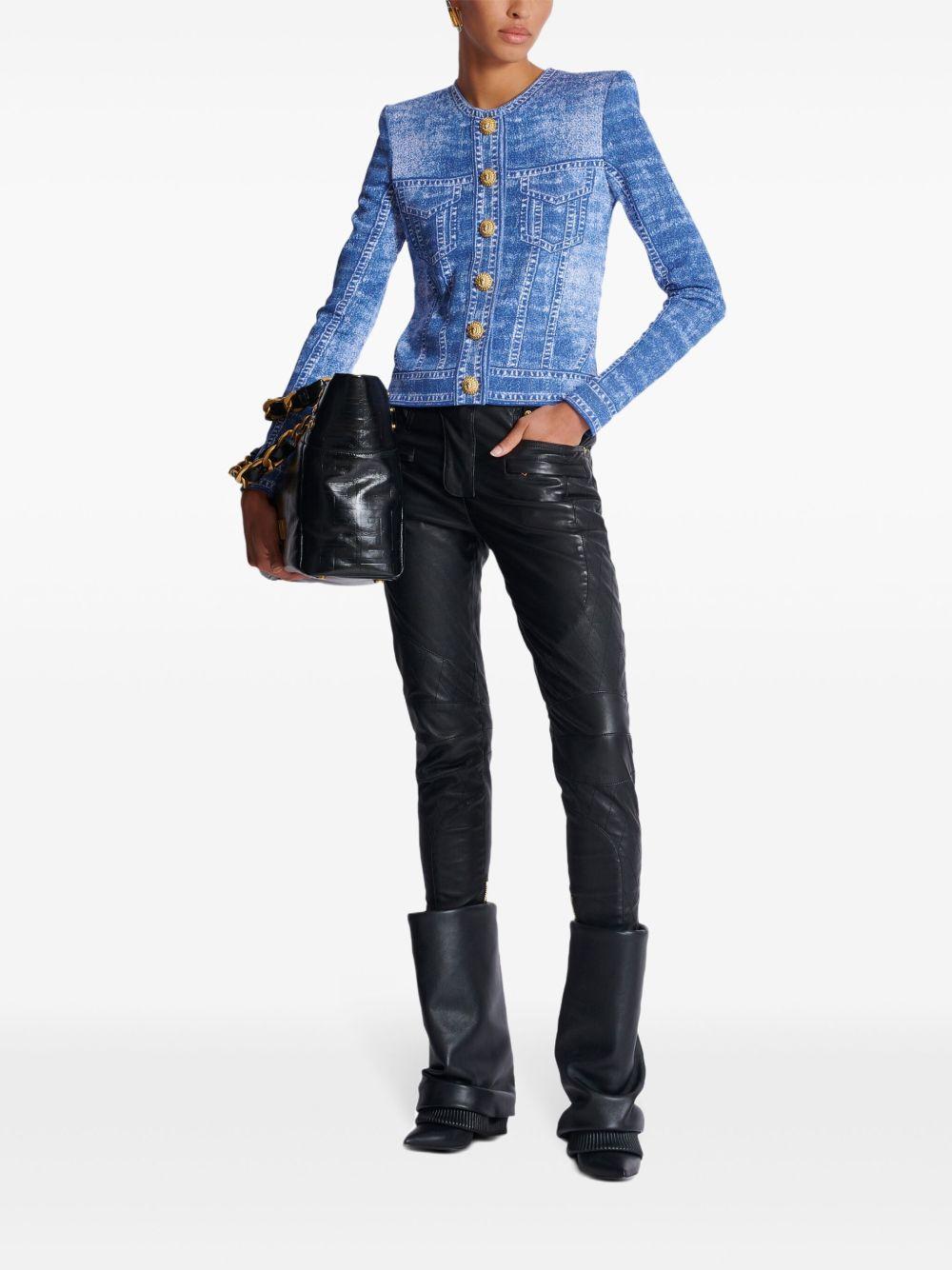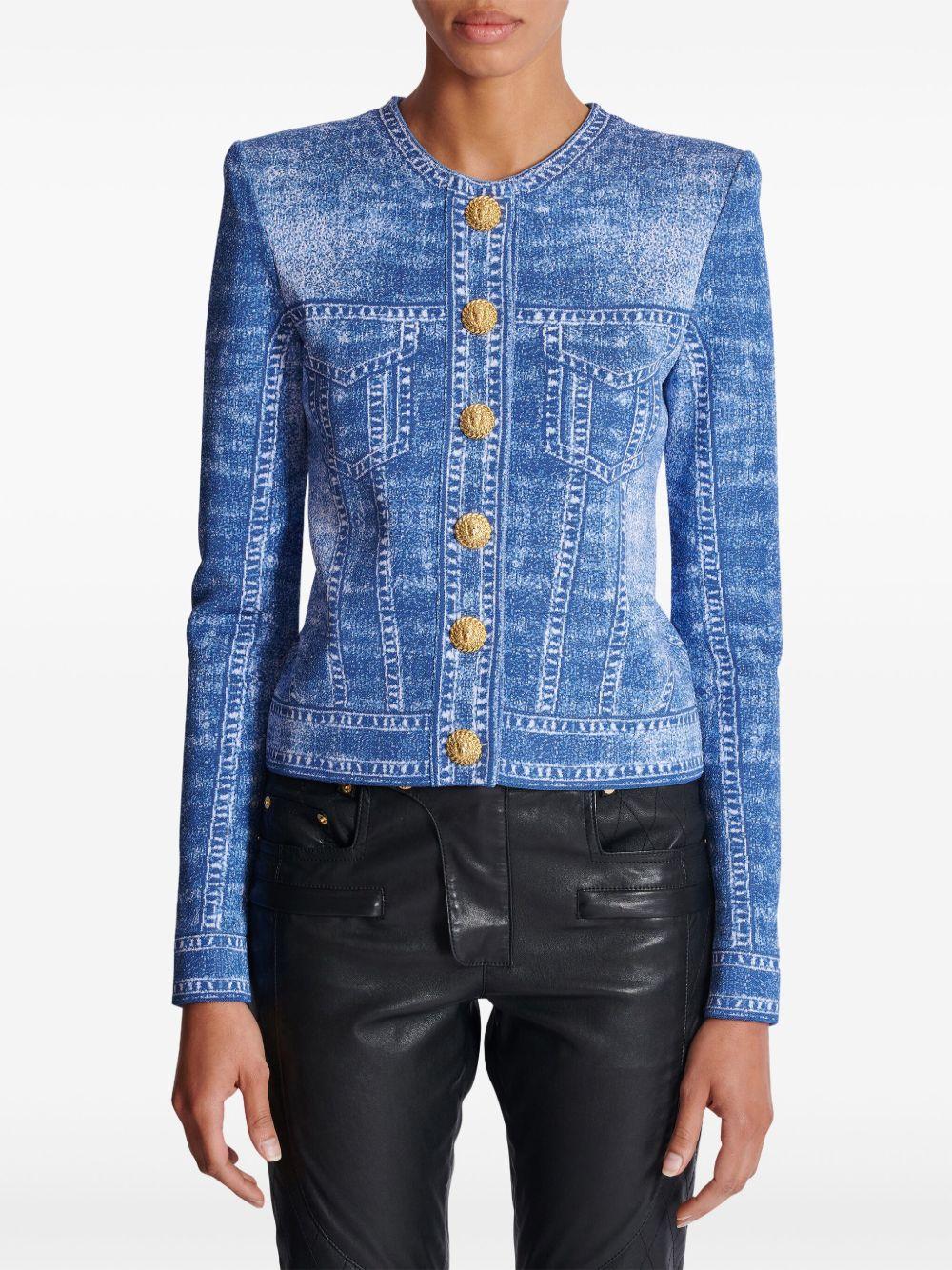 Balmain denim-effect cardigan | Blue | light blue | knitted construction | logo-engraved buttons | crew neck | shoulder pads | long sleeves | Viscose/Nylon/Polyester | Cardigans | Knits | Clothing | Women