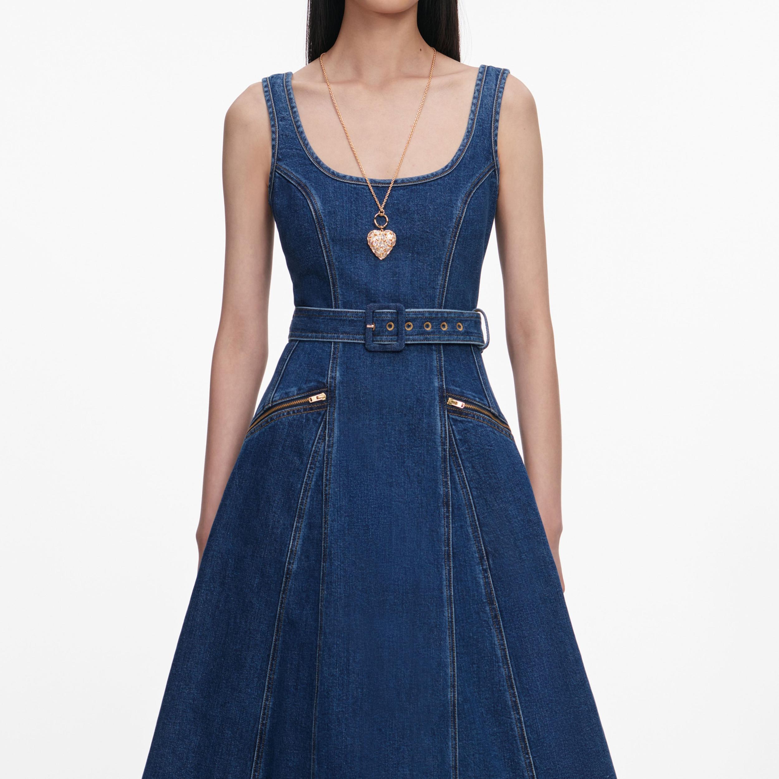 Denim has never looked quite so elegant as this strappy midi dress with its suits-all scoop neckline. A statement belt cinches in the waist – style with heels to show off its full, flared skirt.True to sizeFabric has stretchExposed zip closure at backRemovable beltFunctional pocketsModel is 5ft10/178cm and wears a size UK 6