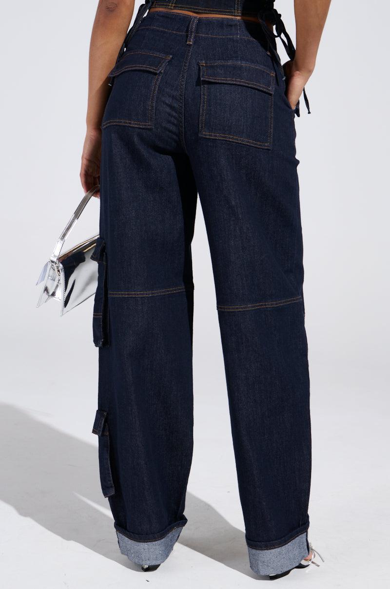 Stay seamlessly styled in The AKIRA Label Denim For Days Denim Pant. Crafted from durable, dark-wash denim, these relaxed-fit pants feature a high-rise fit, functional belt loops, waist flap pockets, additional cargo-style pockets on the lower left leg, and contrast seam paneling for a structured, modern edge. They also boast dual rear pockets, rolled cuffs, and standard button-zip front closure. Complete with a relaxed, straight-leg silhouette. Style with anything from sneakers and a cropped top or boots and a statement jacket for a versatile, every day finish. - 65% Cotton 30% Polyester 3% Viscose 2% Spandex- Slight Stretch- Imported (all measurements approximate from size small)- 11” Rise- 33” Inseam- Model is 5’8” and is wearing size smallProduct ID: 1033546 (all measurements approximate from size 1X)- 12” Rise- 33.5” InseamProduct ID: 1033550