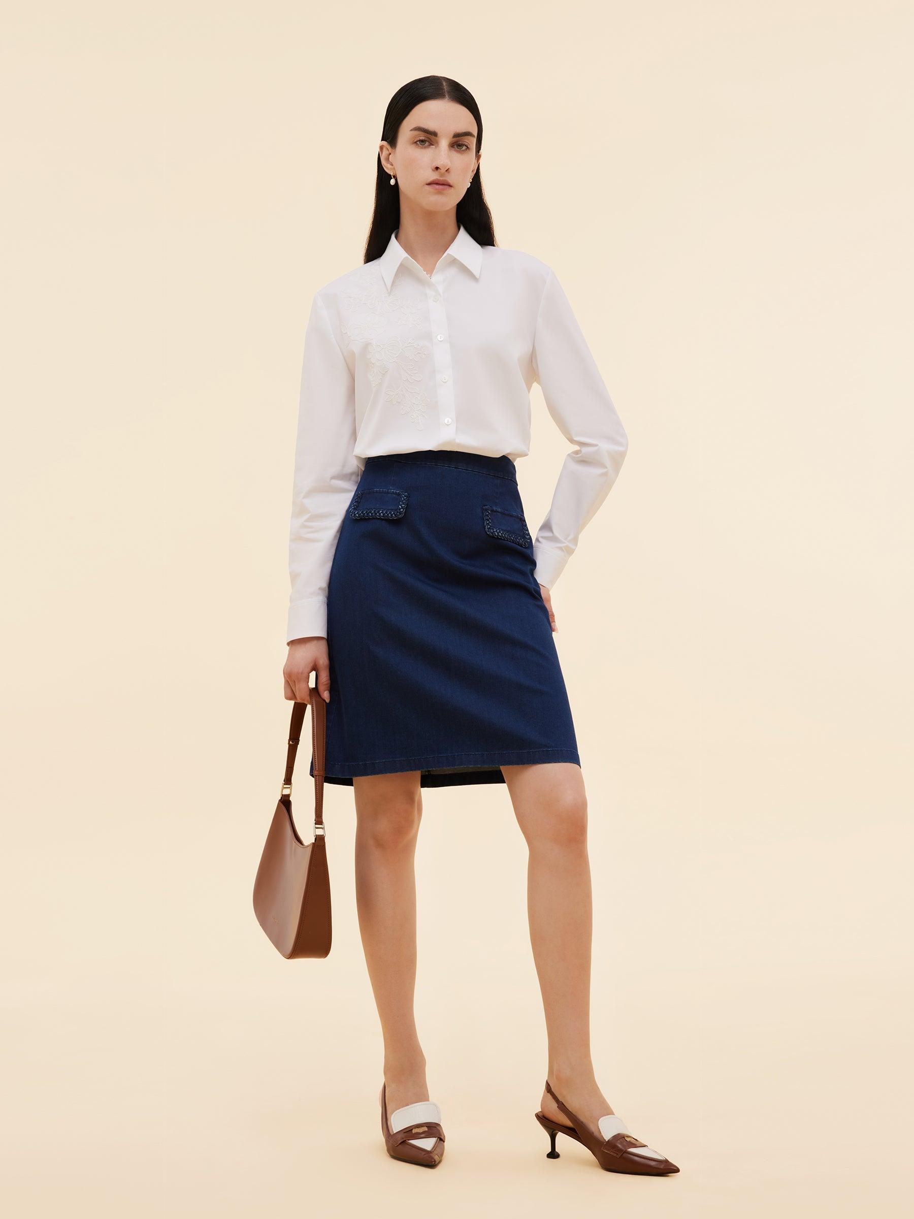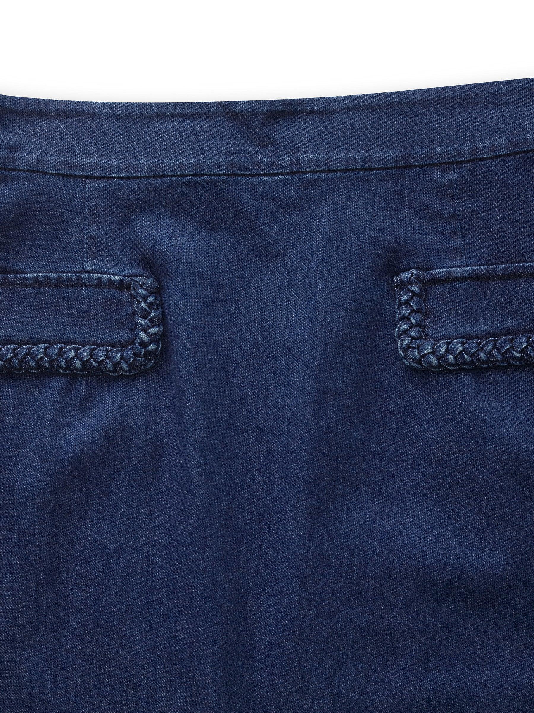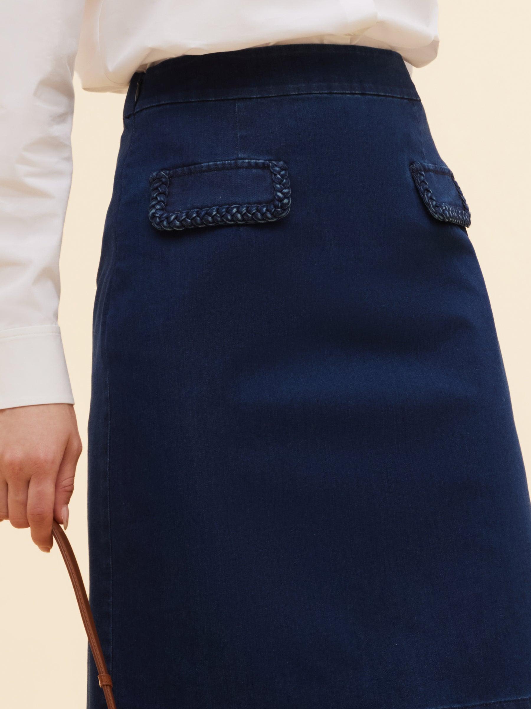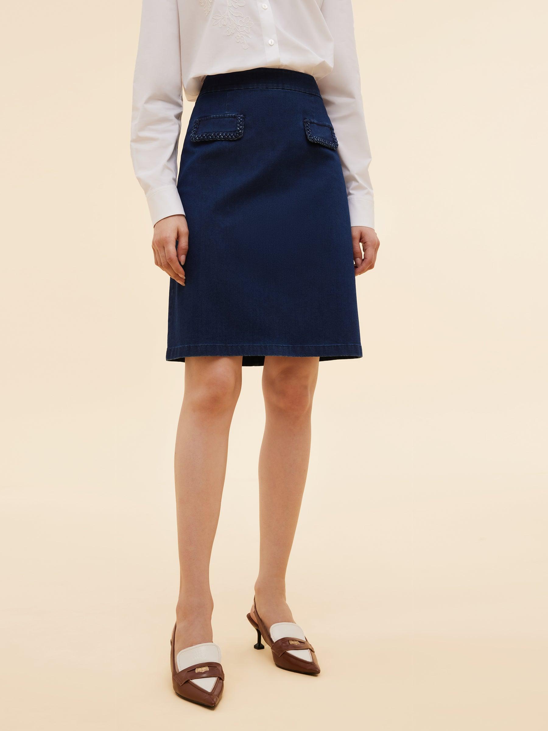-Cotton blend stretchy denim -With side zipper -With elastic waistband at the back This denim skirt offers all-day comfort with its soft, stretchy cotton-blend fabric and relaxed straight cut. The above-knee length flatters the silhouette, while a light eco-wash preserves the rich indigo tone for easy styling. Tweed po
