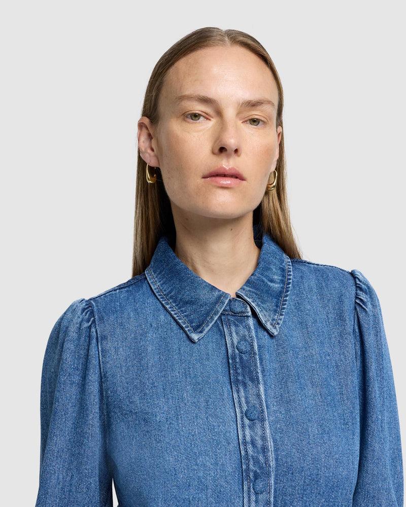 Fits like: A collared shirt with exaggerated puff sleeves and a relaxed fit through the body. Feels like: Silky-soft with a beautiful drape to it. Denim Lustre is a lightweight and rigid fabric with a soft, cooling hand feel. The Details: Medium blue wash Pointed collar Tonal covered buttons Puffed sleeves