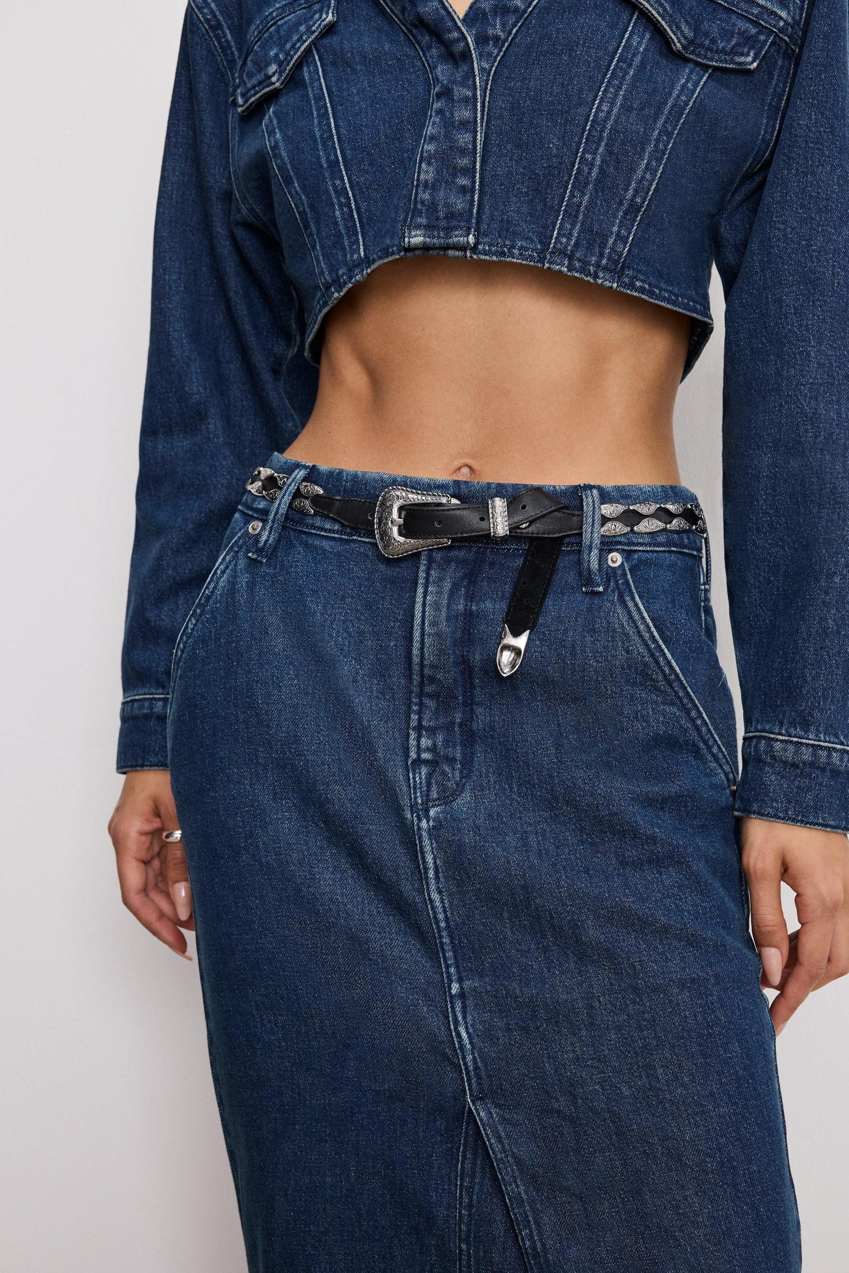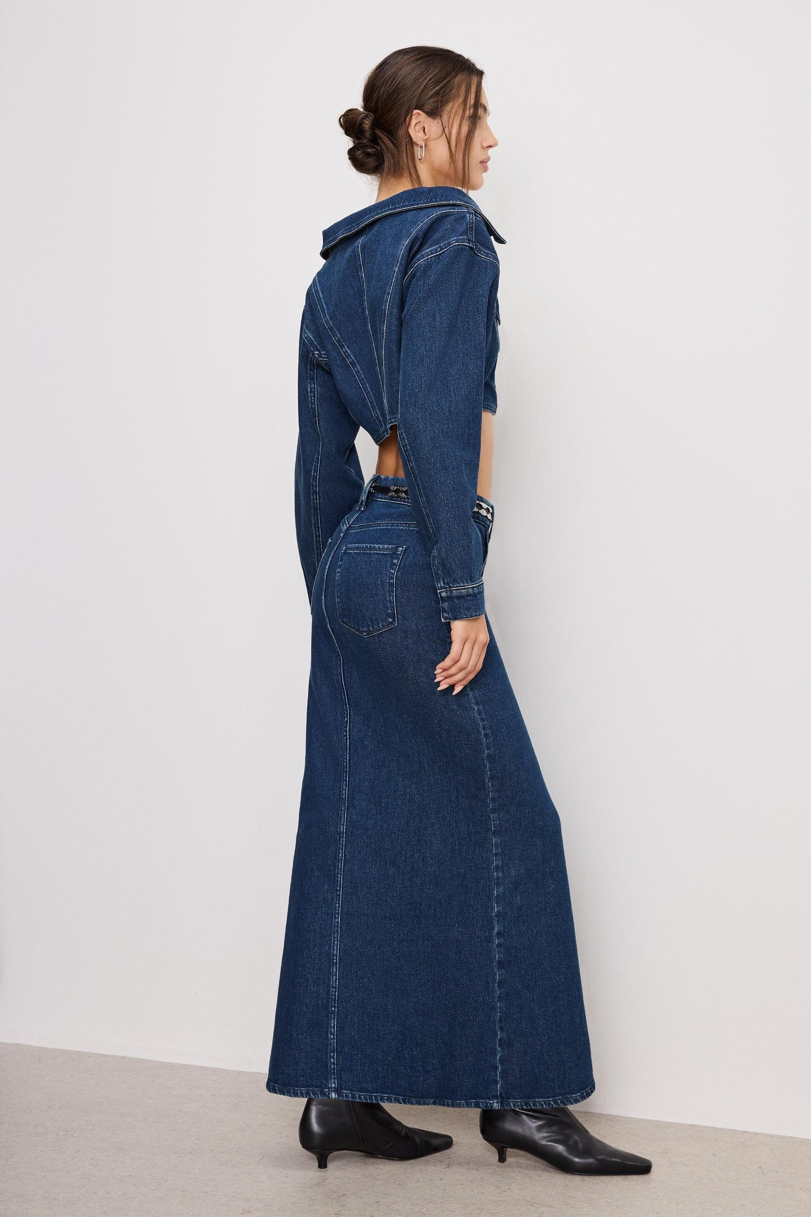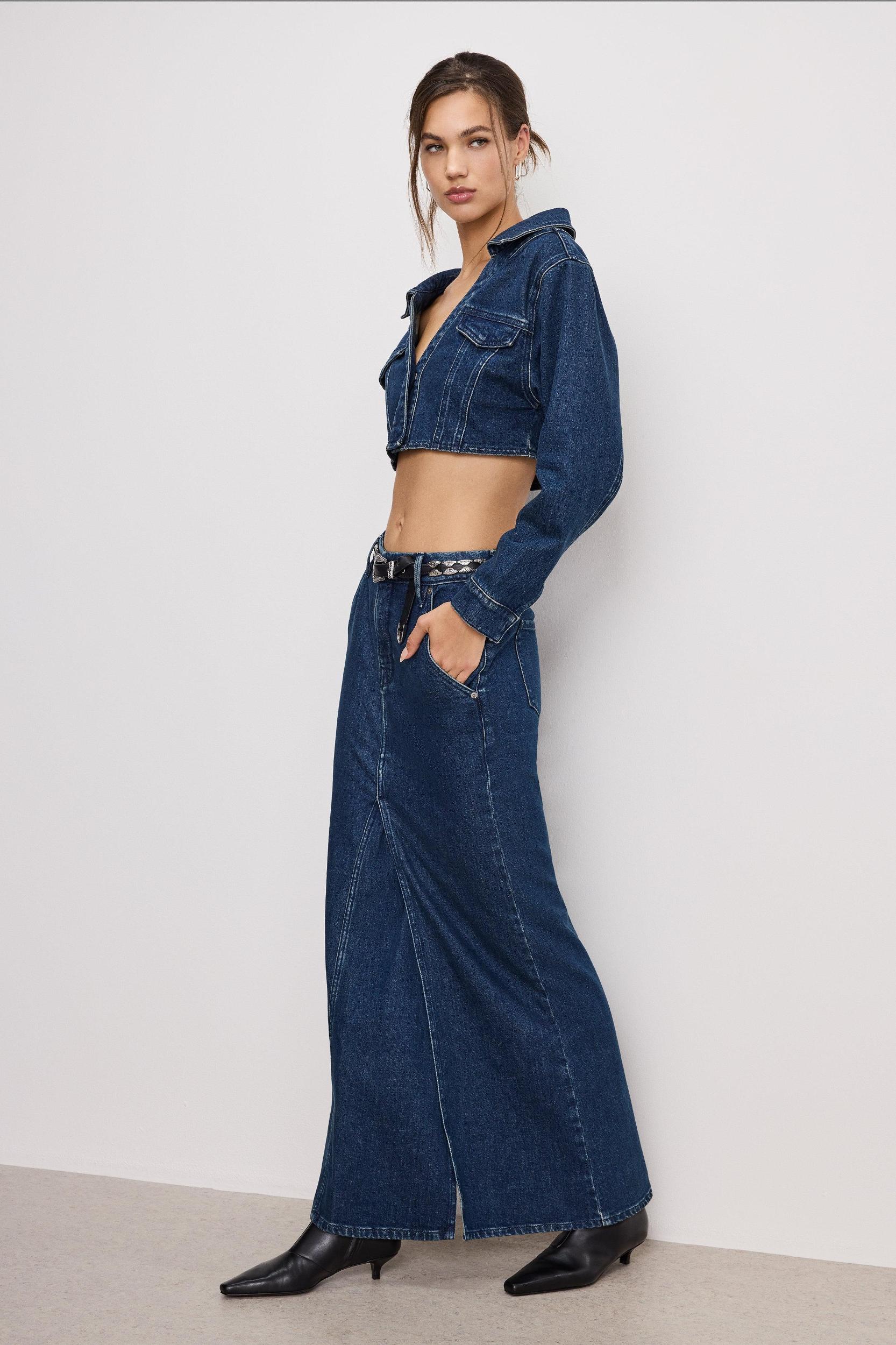 Follow your shape and work your curves with the Denim Maxi Skirt. From the boardroom to the bar, the Denim Maxi Skirt is for those who do it all, and then some. This denim skirt has a classic look and feel, with a little added stretch for comfort. Mid-rise Front zip-fly closure Classic 5-pockets Reinforced belt loops Clean hem with front slit Maxi length Medium blue wash Fabric: 79% Cotton, 20% Recycled Cotton, 1% Lycra