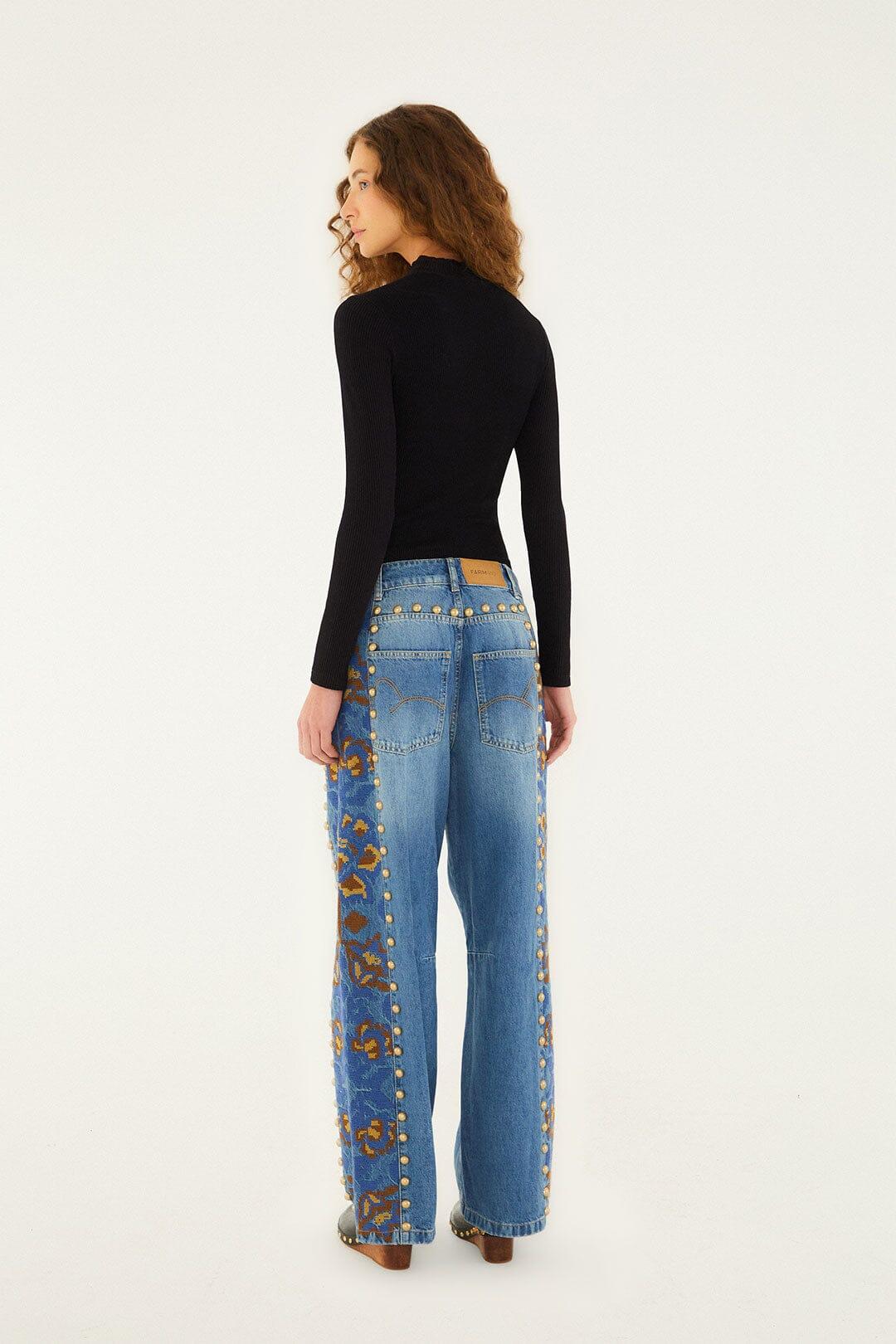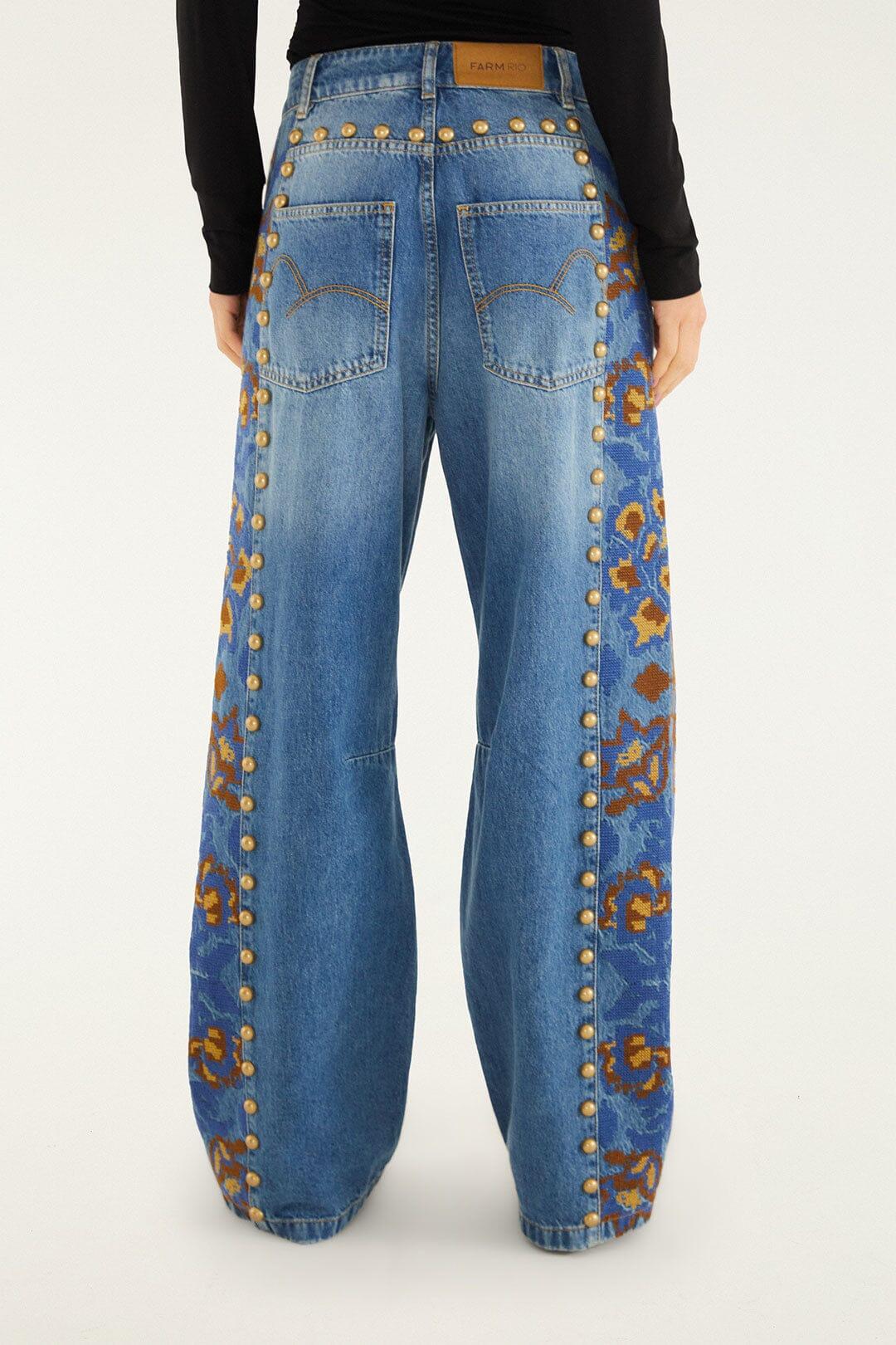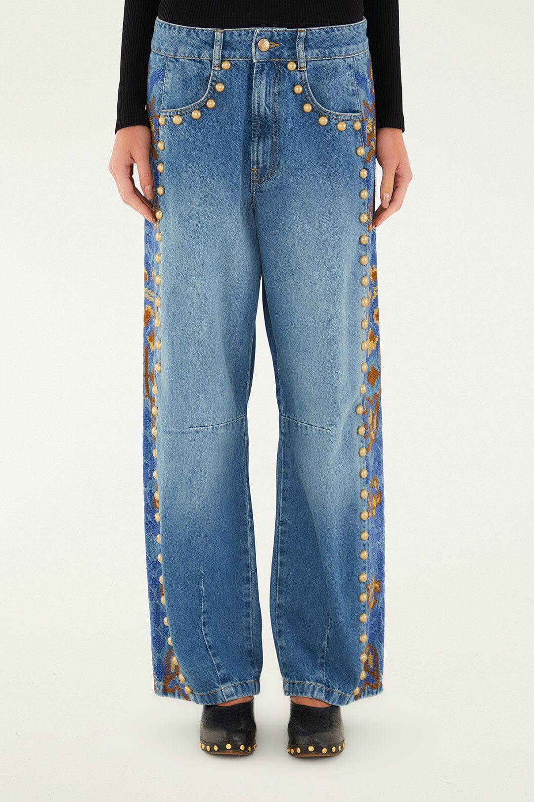 Embrace effortless charm with these Denim Metal Details Embroidered High Waist Pants. Crafted from soft blue denim, they feature a relaxed straight-leg silhouette with striking metal stud accents tracing the front pockets and side seams. The standout embroidered floral motifs in rich blues and warm browns add a playful, artisan touch along the sides, blending nature-inspired beauty with bold modernity. A perfect harmony of comfort and statement-making style.