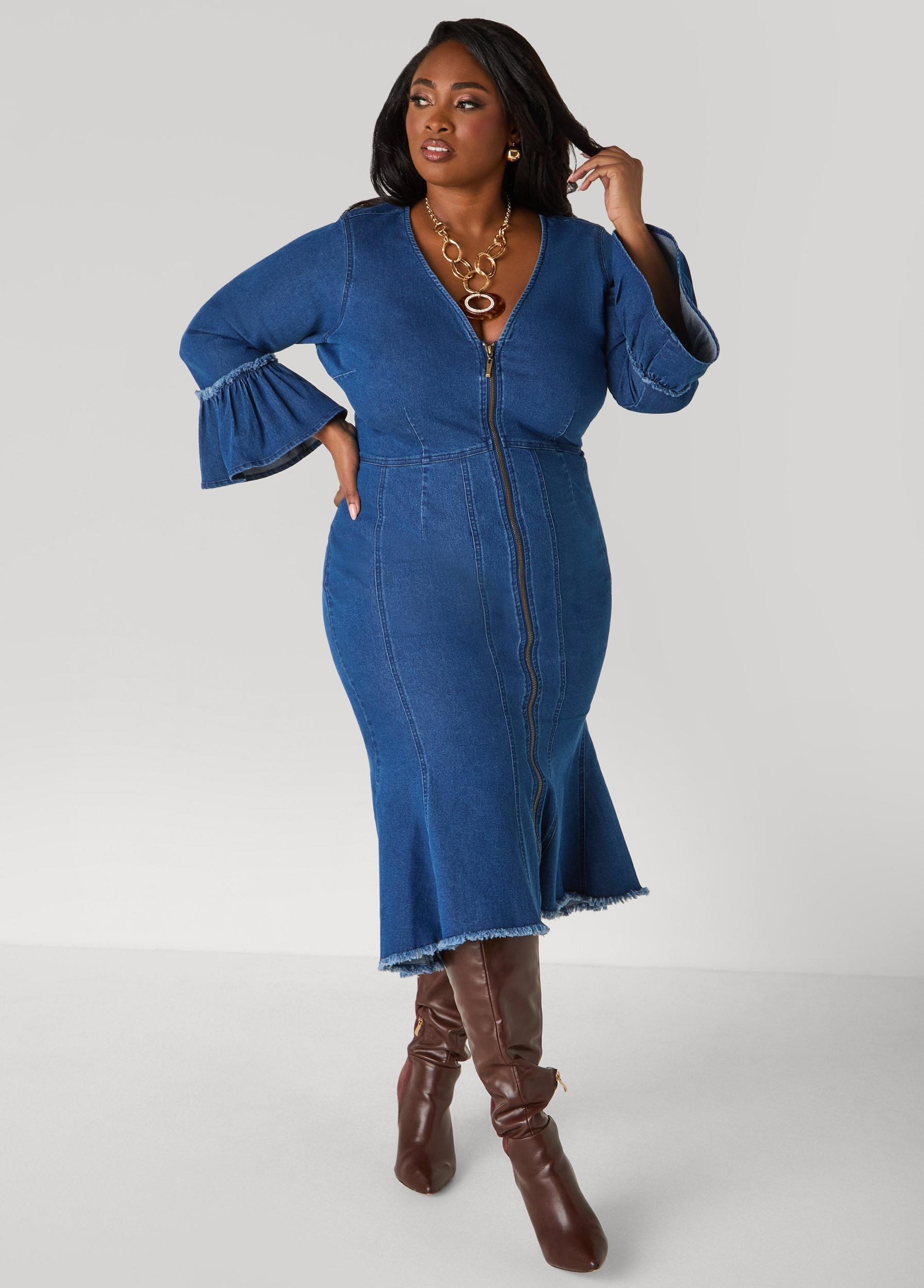 You'll cause whiplash (and break hearts) in this show-stopping denim bodycon dress! With a daring V-neck & fabulous bell cuffs, this dress is all about attitude. The frayed trims and dipped back hem along the midaxi length add a playful edge, ensuring you steal the spotlight wherever you go.