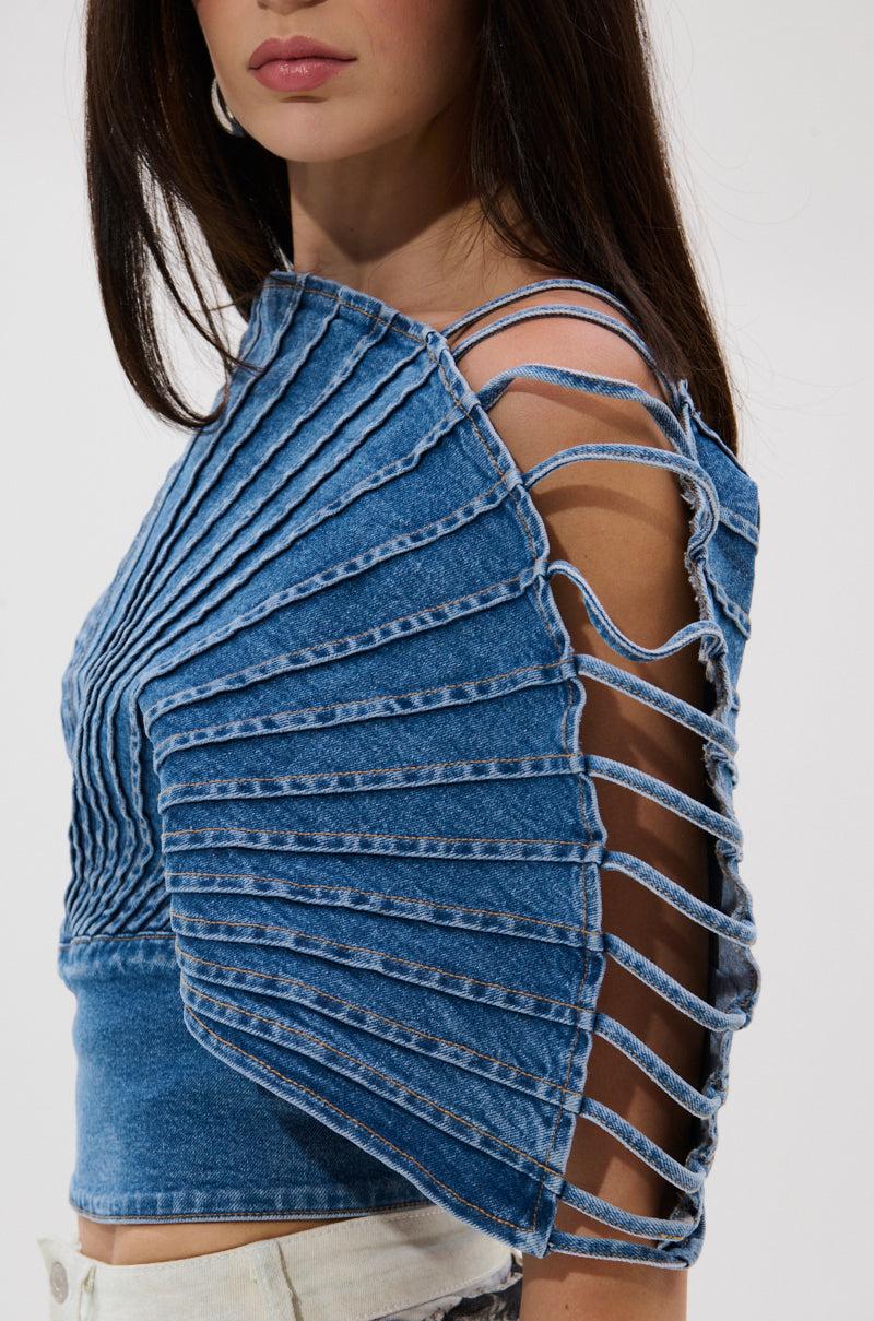Denim meets drama with The AKIRA Label Denim on Denim Blouse. This sculptural top is crafted from structured, medium-wash denim and features a dramatic fan-like pleated silhouette that extends from the bust to the shoulders. It has exposed shoulders, thin strappy details lining the top hem that doubles as tank straps, and a cinched bodice that contours the waist. Complete with a deep V-cut open back and a metallic back zipper closure. Pair it with high-waisted jeans or sleek trousers to complete the denim-forward look. - 99% Cotton 1% Spandex- Slight Stretch- Imported (all measurements approximate from size small)- 19” Shoulder to Hem- 17” Shoulder to Shoulder- 5.5” Strap LengthProduct ID: 1057469 (all measurements approximate from size 1X)- 23” Shoulder to Hem- 21” Shoulder to Shoulder- 7” Strap LengthProduct ID: 1057473