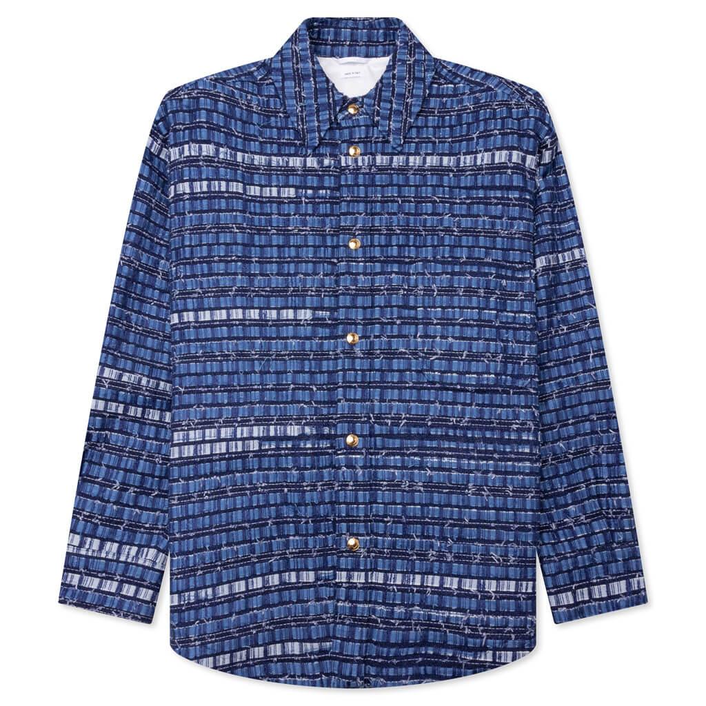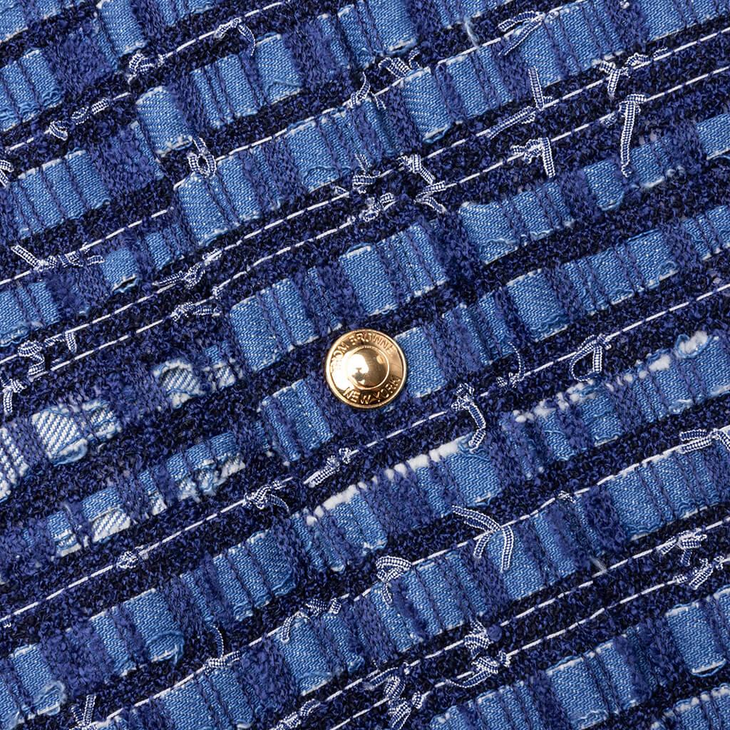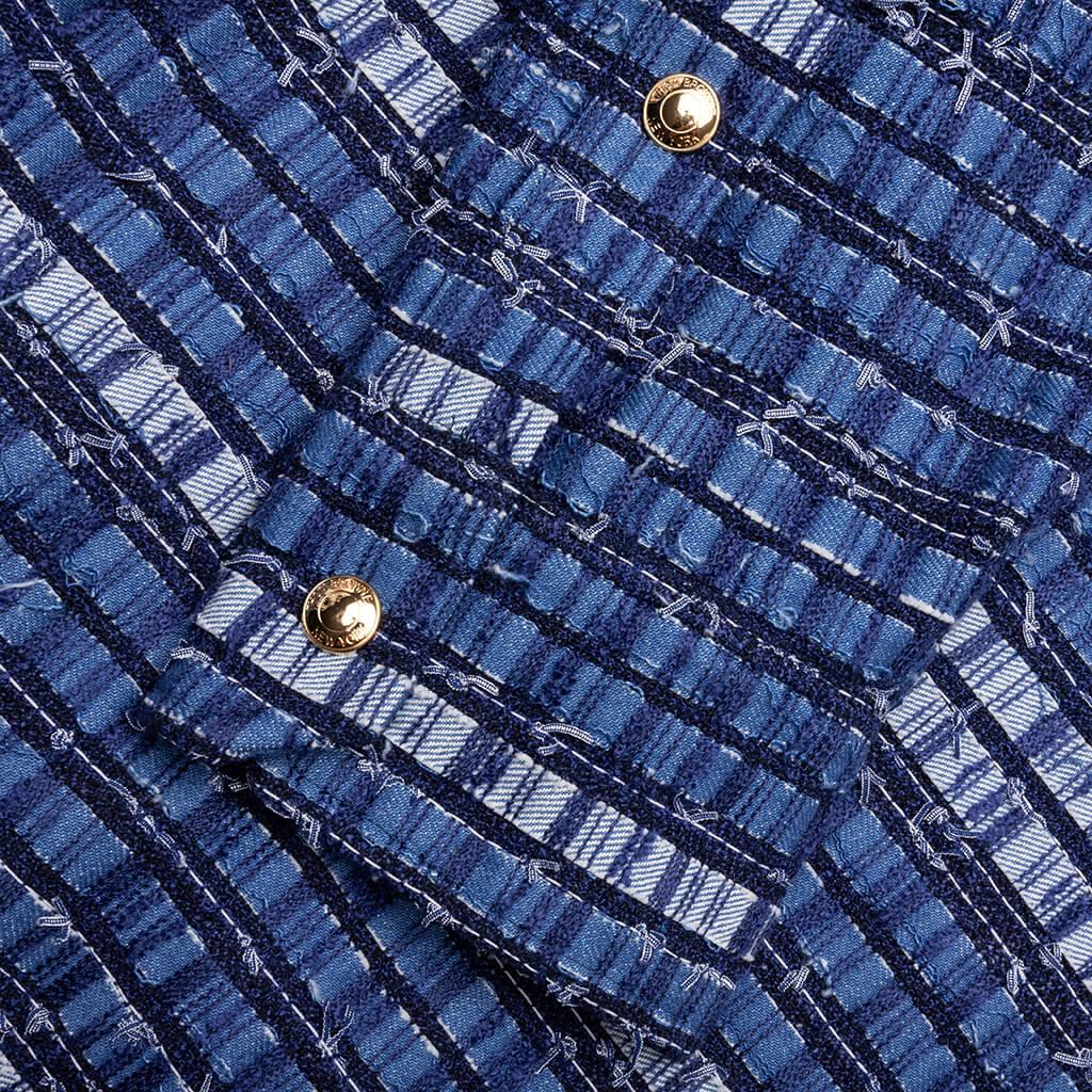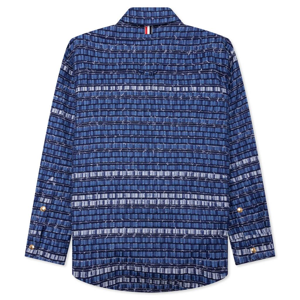 The Oversized Shirt Jacket from Thom Browne brings a bold statement with denim tweed materials. The distressed denim elevates the look and provides a layer of detail. The design features brass snap button front closure and pleated button cuffs. An interior pocket and branded nametag add to the attention to detail. The brand's signature striped grosgrain loop tab at the back of the neck rounds out the look. Made in Italy Denim ribbon tweed Brass button detailing Interior pocket Striped grosgrain loop tab Style No: MJO165A-F0294-460