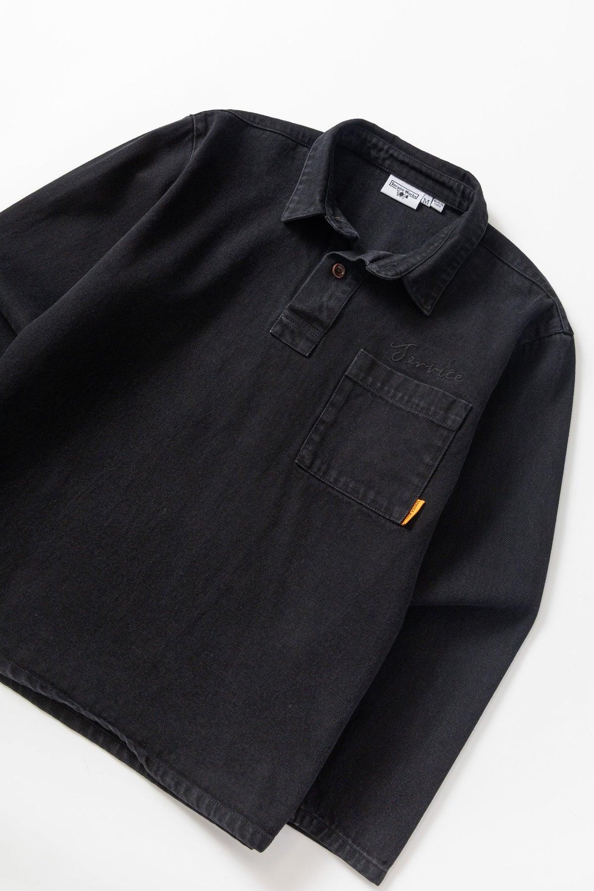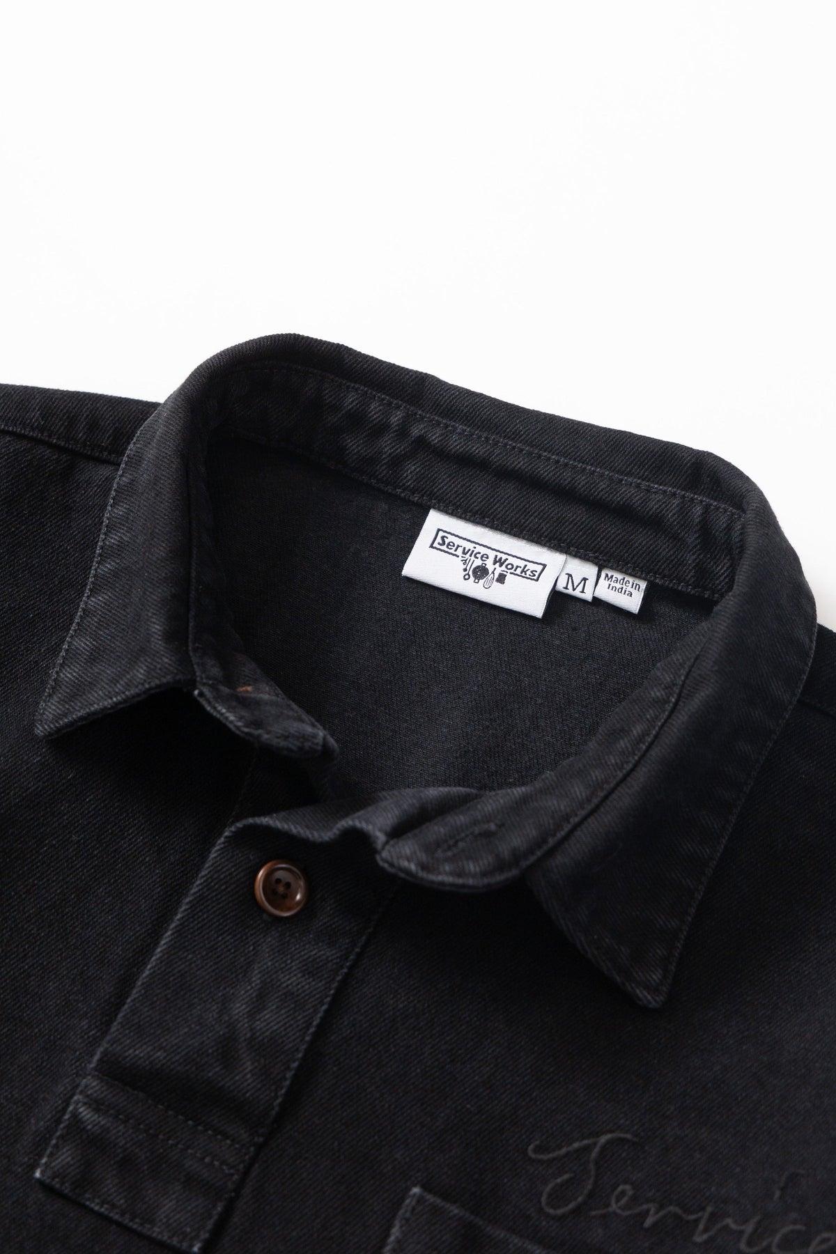 Denim Script Popover by Service Works Constructed with GOTS Organic 12oz cotton denim 3-Button placket Chest pocket Embroidered script logo Woven tab label