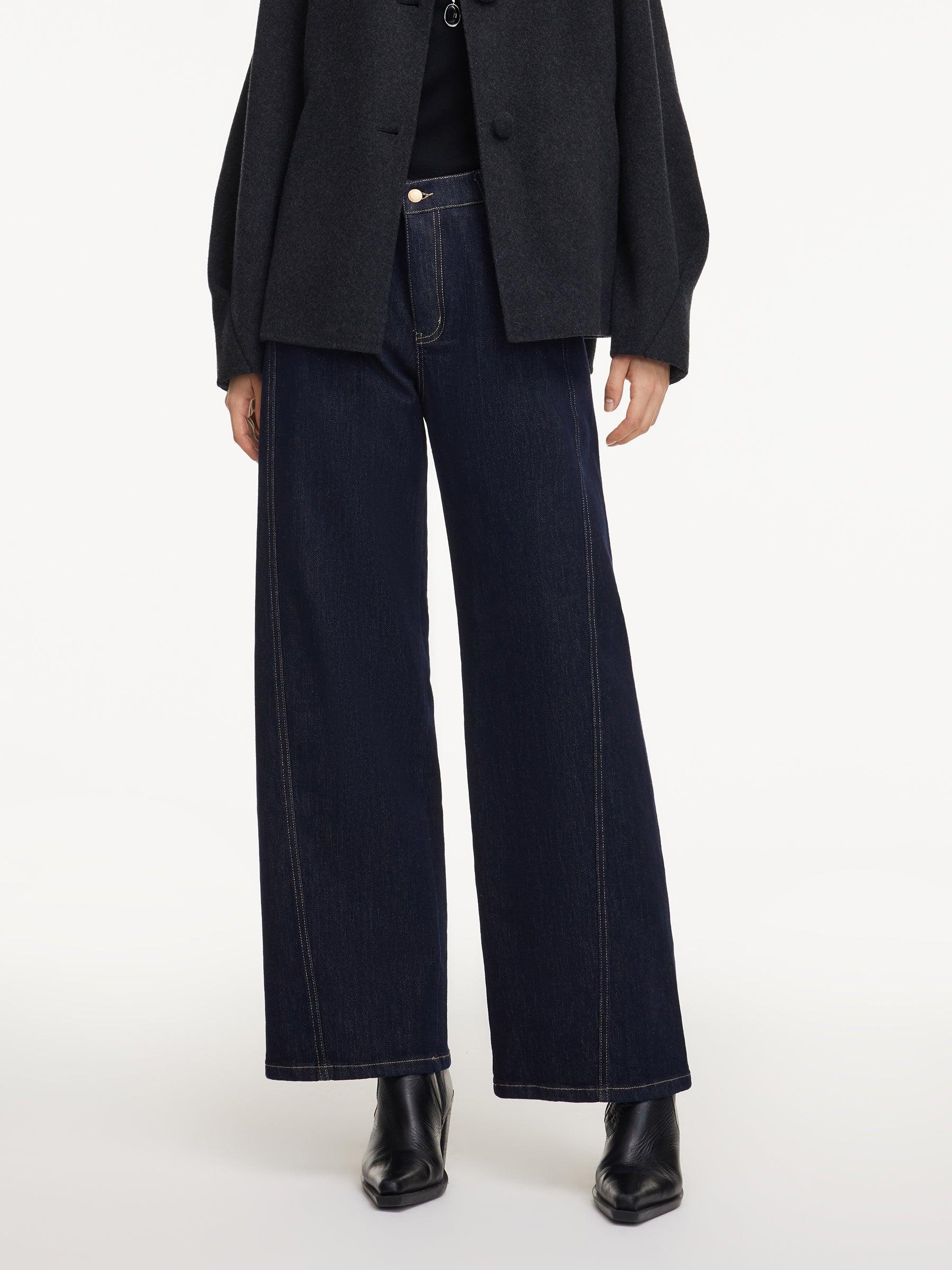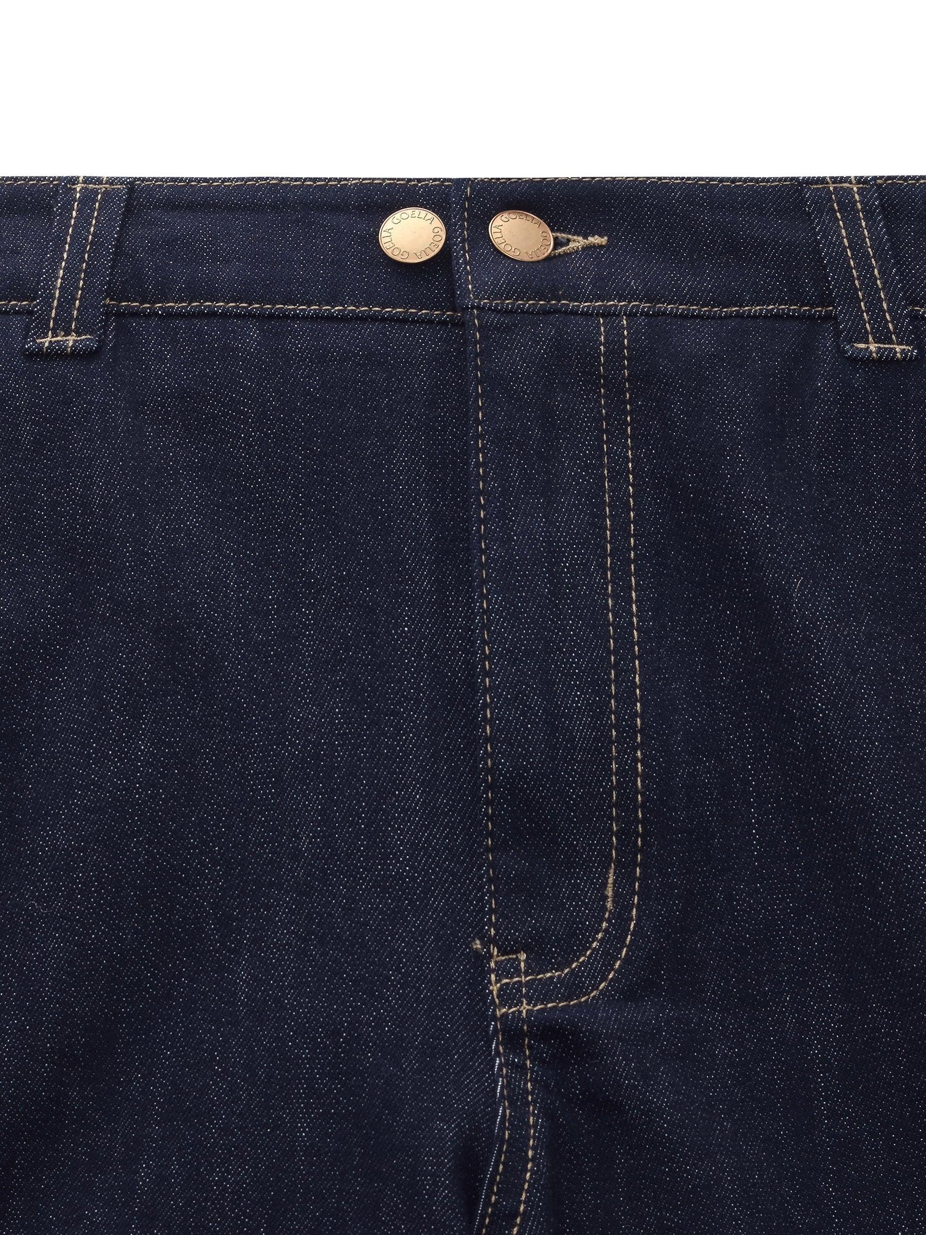 -With detachable down liner -Warm -With pockets These high-waist jeans feature a removable down lining, offering versatile warmth and year-round wear. The relaxed, tapered silhouette flatters all leg types without adding bulk, while sturdy denim provides structure and shape retention. Adjustable metal waist buttons ens