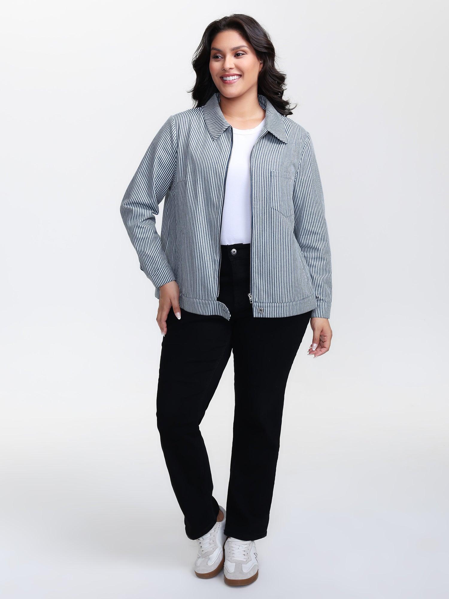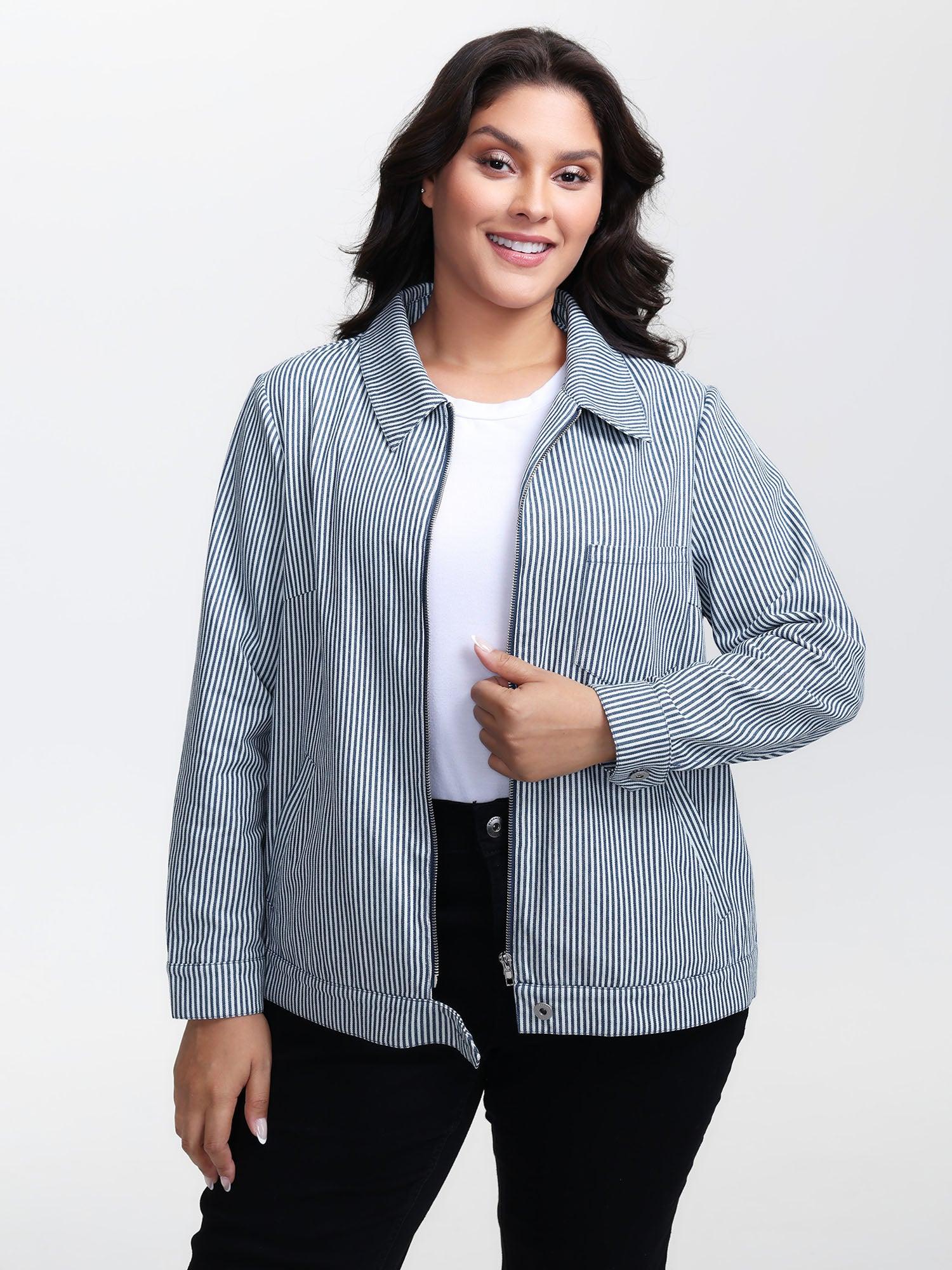 Shop Denim Stripe Zipper-Front Jacket now and redefine your style with confidence at BloomChic. Tailored for mid and plus-size women. This trendy Outerwear Women, sizes 10-30. Color:Mediumblue;Prints:Stripes;Pocket:Slanted pocket;Belt:No-belt;Closure Type:Zipper;Lining:No-lining