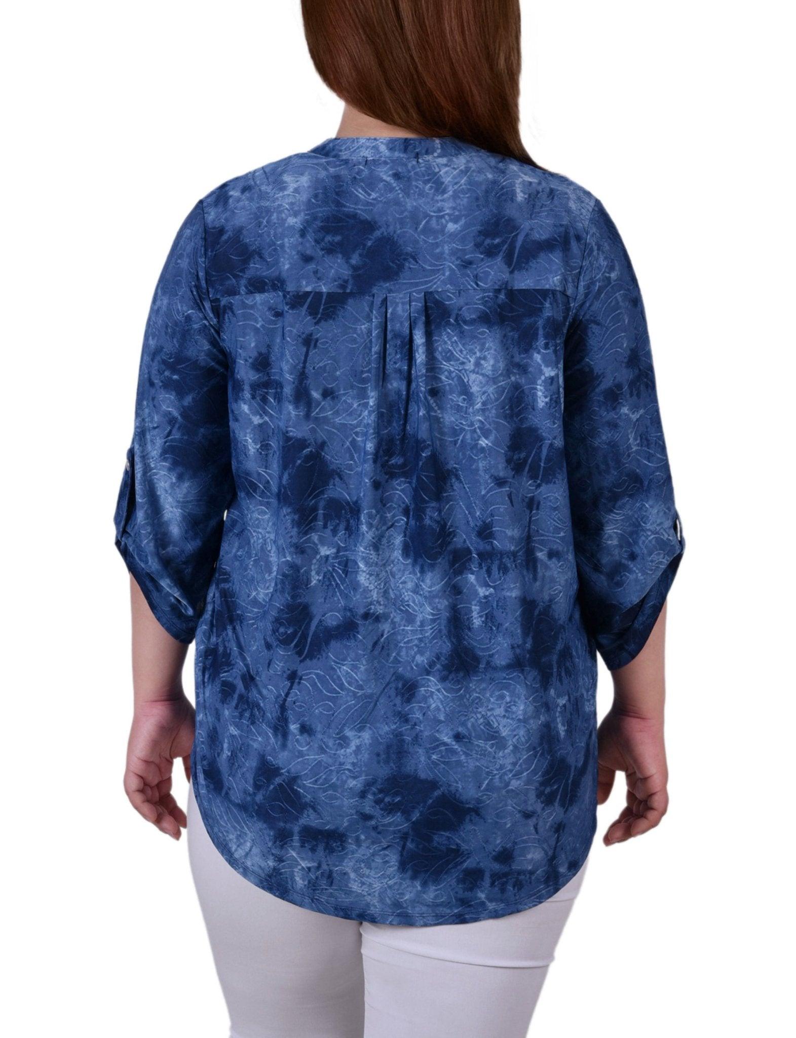 Denim Tie Dye 3/4 Sleeve Roll Tab Y Neck Top - Plus