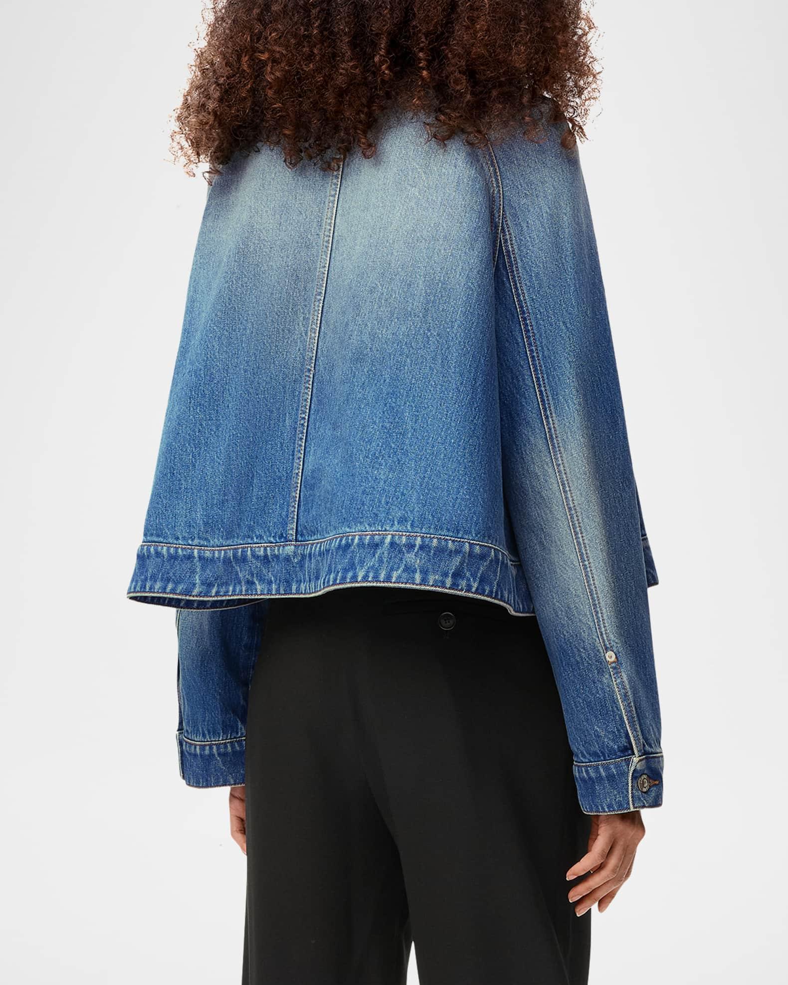 Loewe denim trapeze jacket featuring fading along the shoulders and elbows Point collar; single-breasted front Long sleeves; button cuffs Chest button-flap pockets Hip welt pockets A-line fit Hip length Cotton/polyester/leather Made in Italy