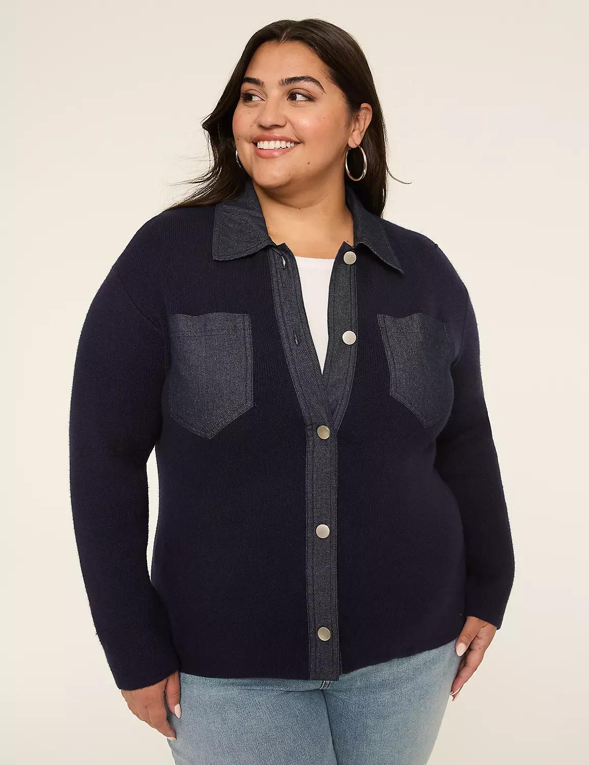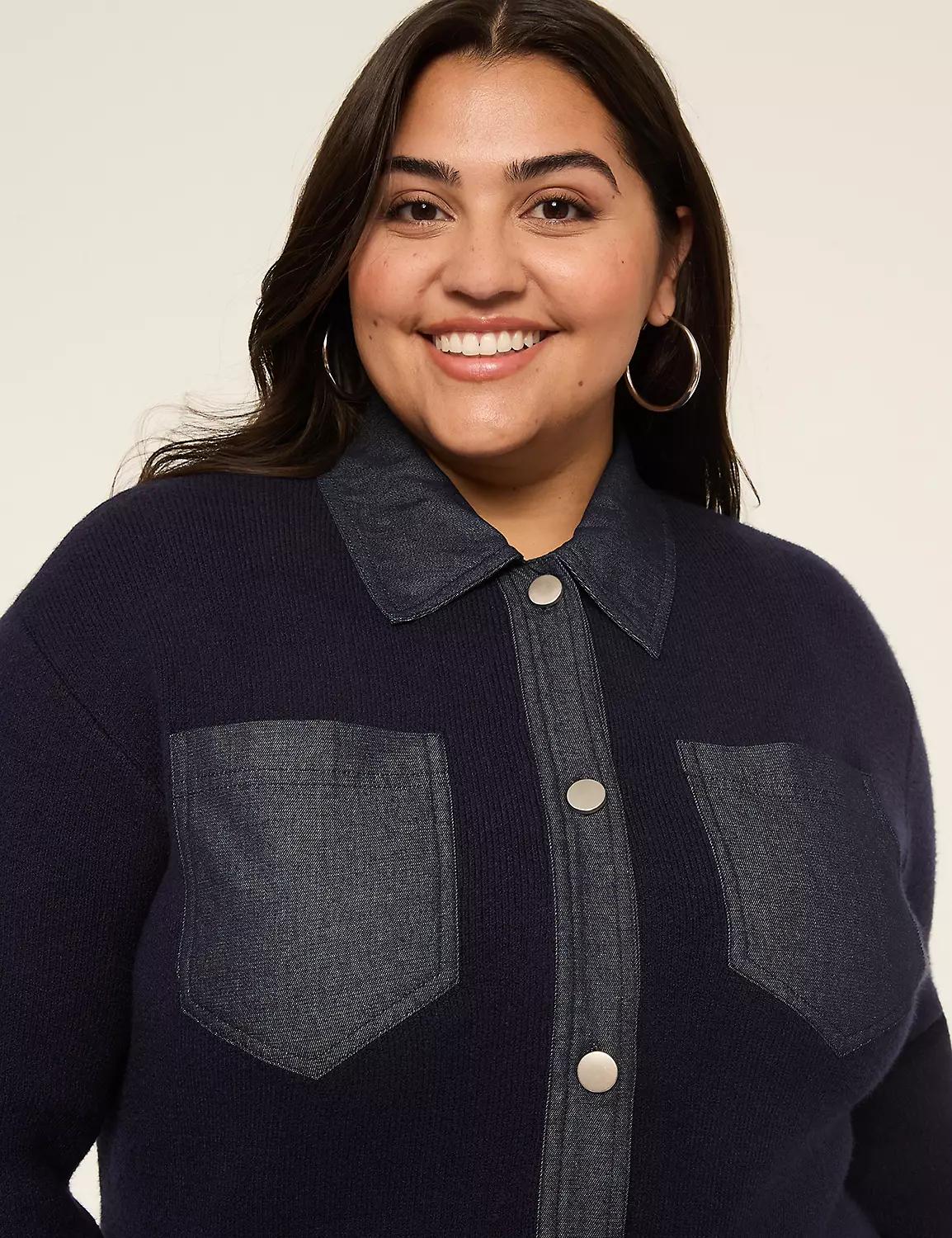 Denim-Trim Button-Front Cardigan