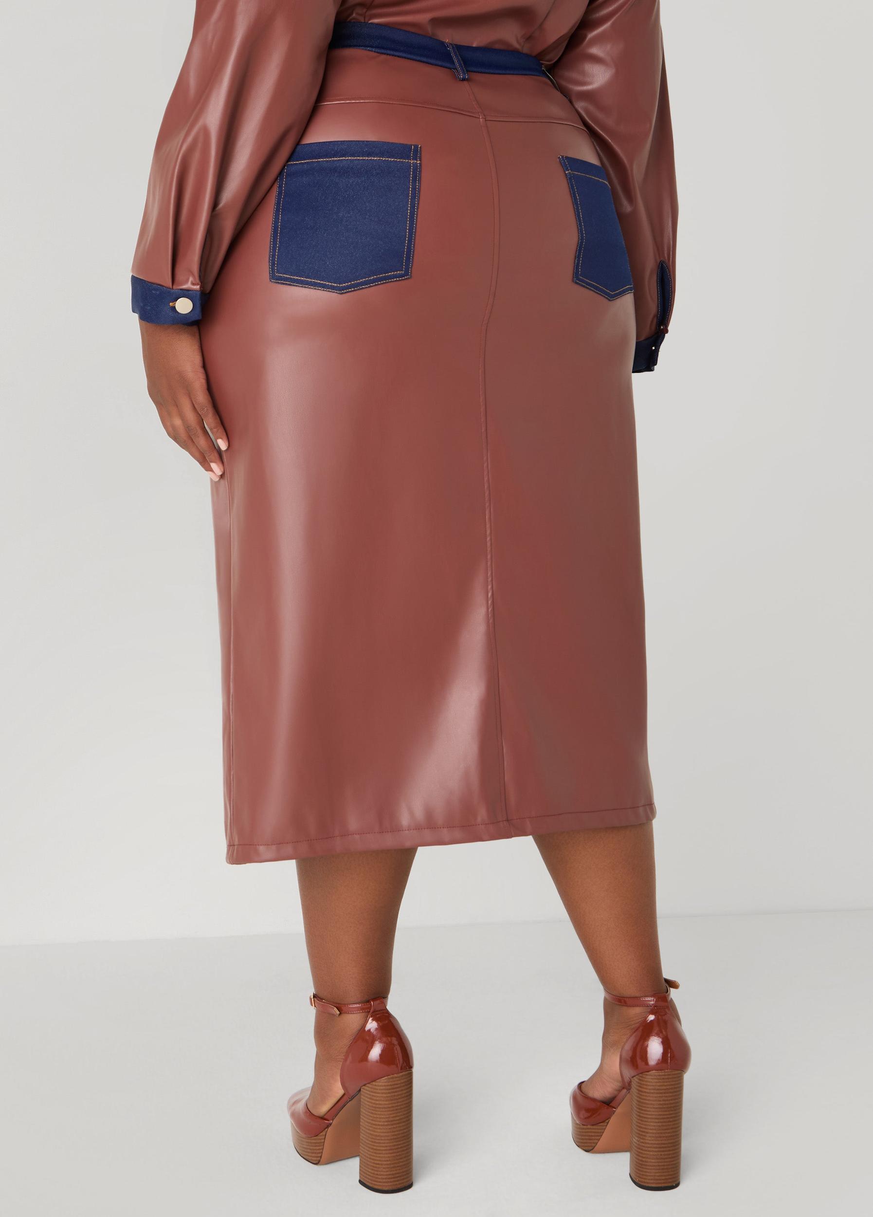 Own the streets in this faux leather midi skirt featuring denim trims & a front split that keeps things spicy. Pair with the matching shirt for a two-piece set that’s all about edgy, head-turning style.