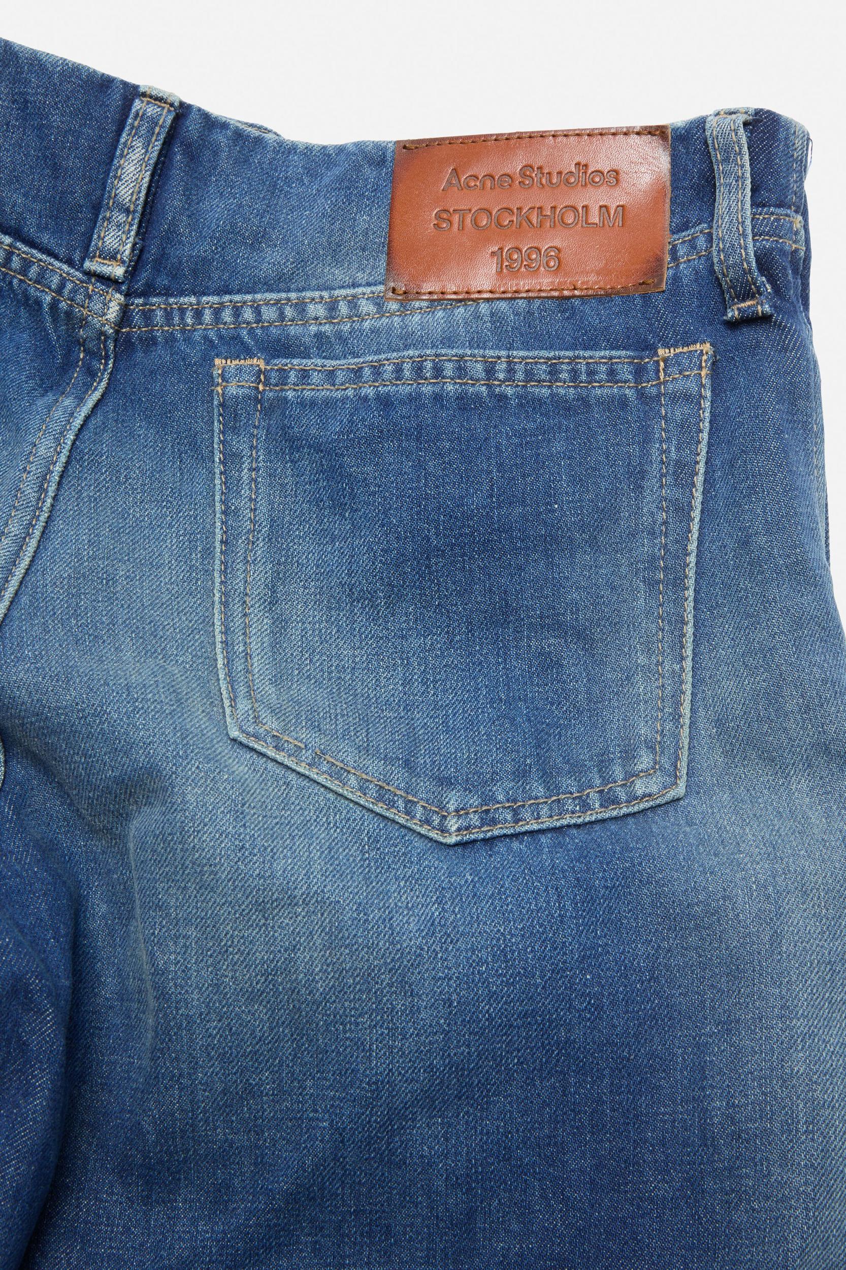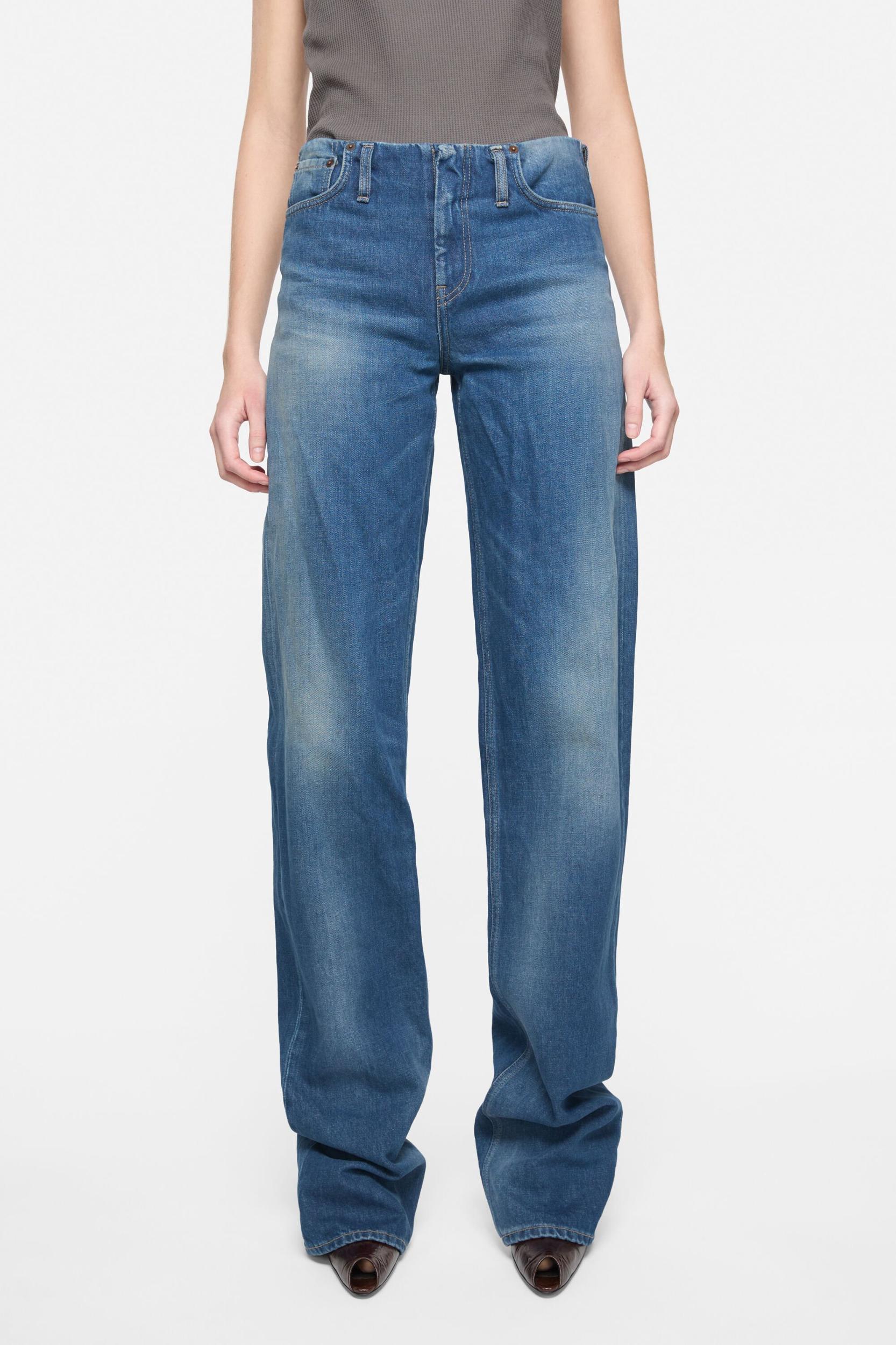Denim trousers featuring a soft bonded construction with a seamless, sculptural design. Reimagined with an elongated silhouette, a bandless waistband, and decorative fly topstitching. Complete with functional front and back pockets. Cut to a regular fit with a low to mid waist and a straight, wide leg. FN-WN-TROU001499