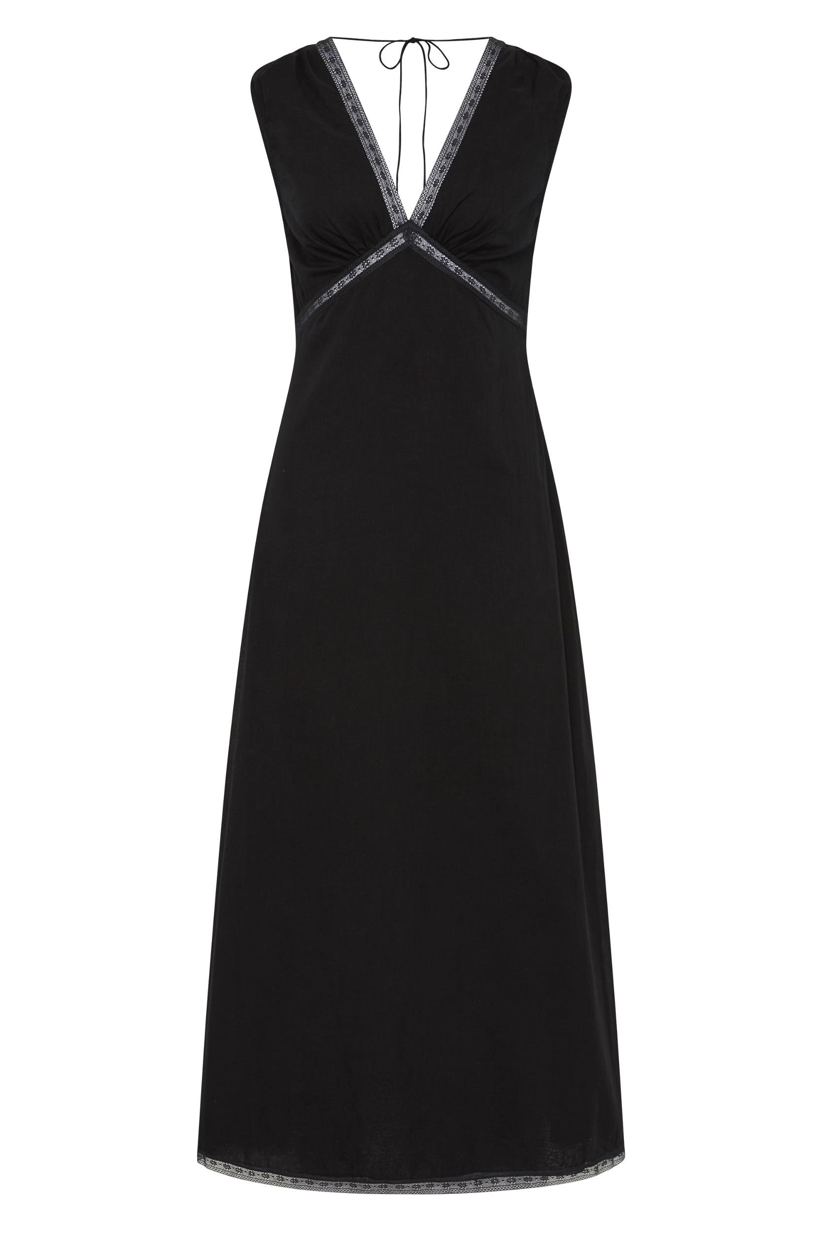 A midi dress with a deep V-neckline and wide straps that sit up on the shoulders. Designed from a delicate cotton voile in a classic black, it features vintage-inspired lace detailing around the neckline, under the bust and around the hem. There are back waist ties which allow for custom cinching and the skirt flares out in a soft A-line, cropping above the ankles. Style with a simple sandal for elevated everyday dressing. This style is true to size. The back ties are adjustable for custom fit through the bodice. Wear over neutral intimates.