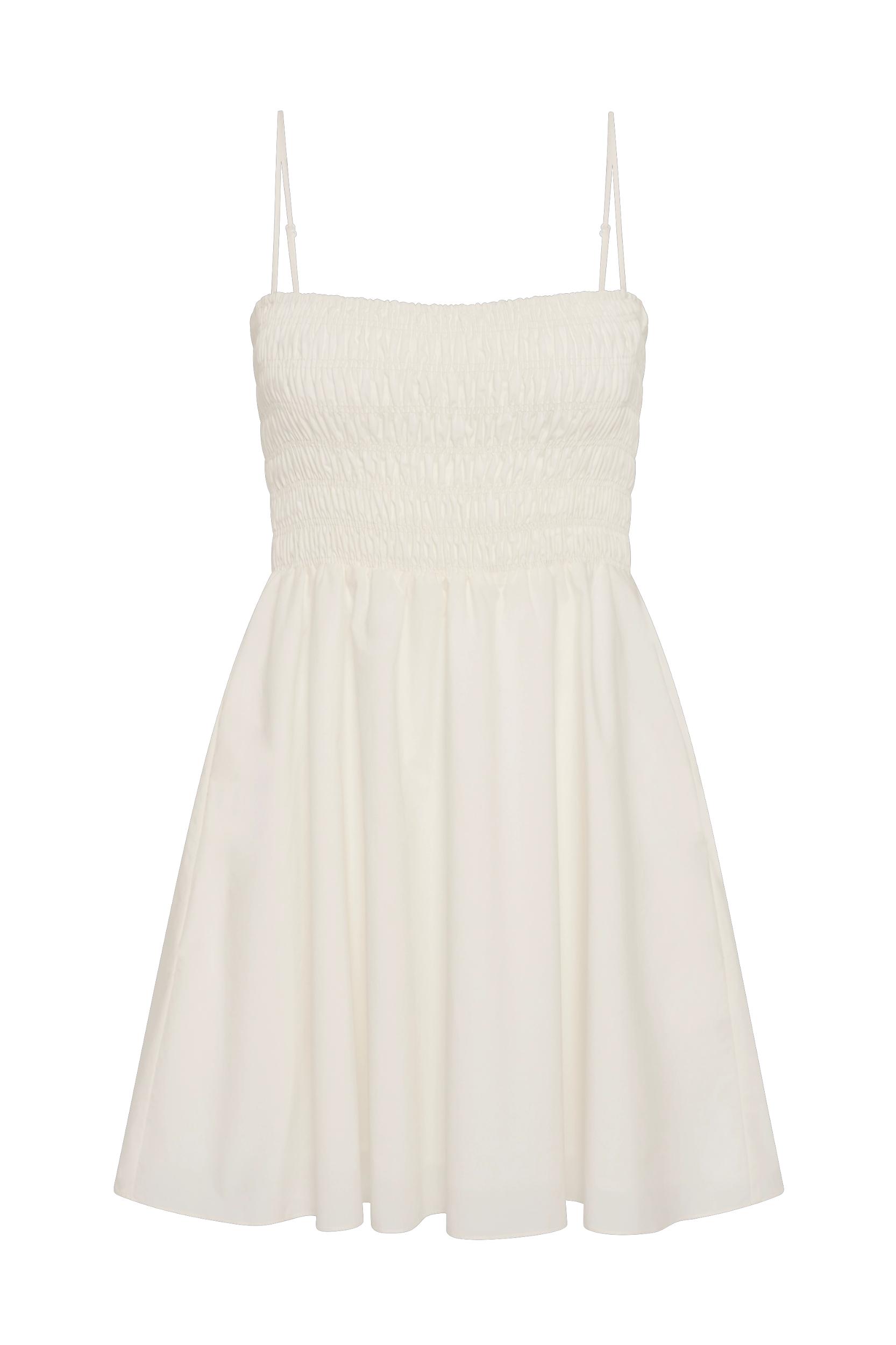 A signature FAITHFULL silhouette, reimagined with new elevated details and designed from 100% cotton in a crisp white. It is a sweet, feminine mini dress with a straight neckline and thin straps, adjustable in length. The bodice is shirred for additional stretch which leads to a gathered waist and A-line skirt. Style with a ballet flat for elevated everyday wear. This style is true to size. The shirred bodice does offer additional stretch.