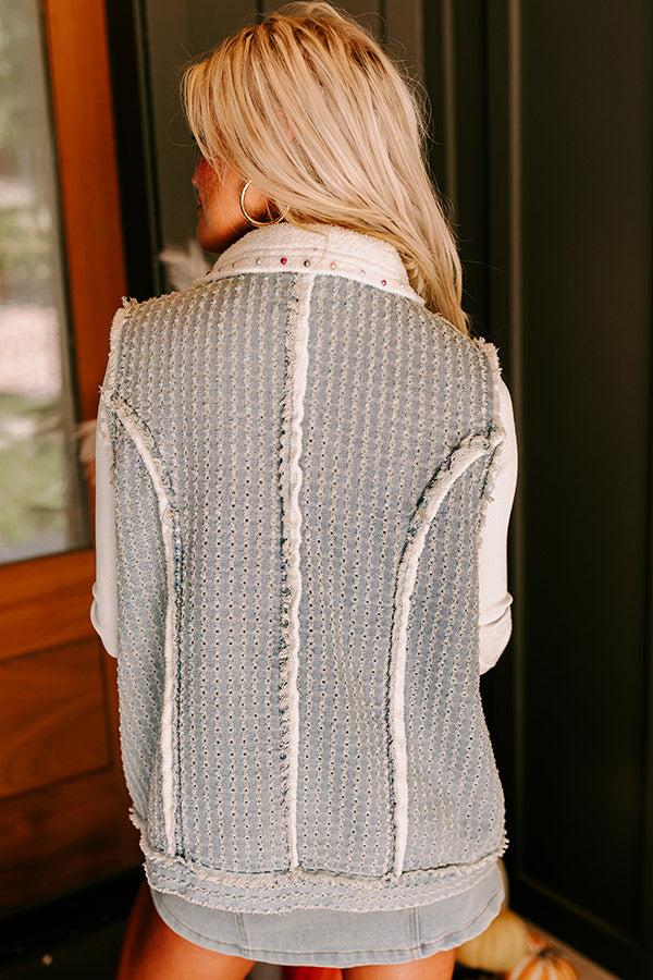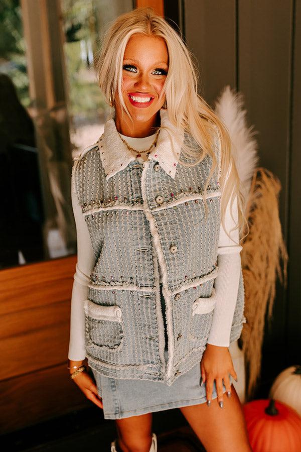 - Make your OOTD pop with this trendy vest! You are sure to stand out with its unique pearl embellish design that puts a modern twist on timeless style. - Perforated denim material with a built-in sherpa lining - Unfinished, frayed seam accents - Multi-colored faux pearl embellishment - A collared neckline - A button closure front - A sleeveless cut - Functional low pockets - A relaxed silhouette that ends in a straight hemline
