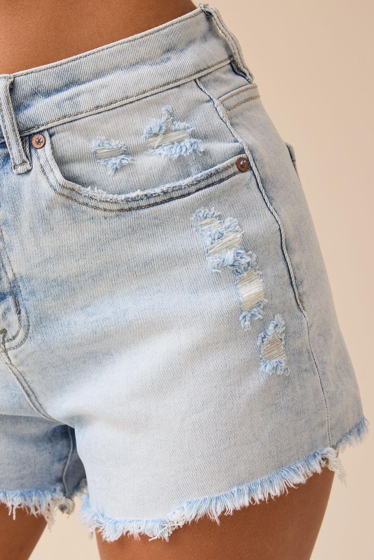 These mid-rise denim shorts feature a trendy distressed look and a fun frayed hem. Effortlessly cool and perfect for summer adventures.