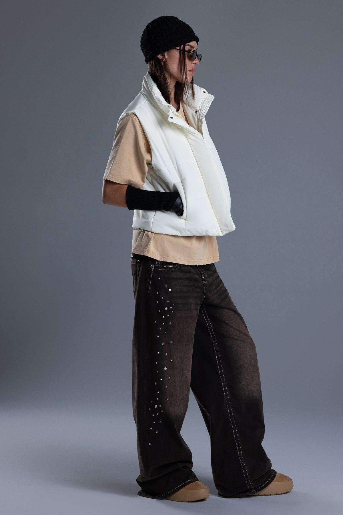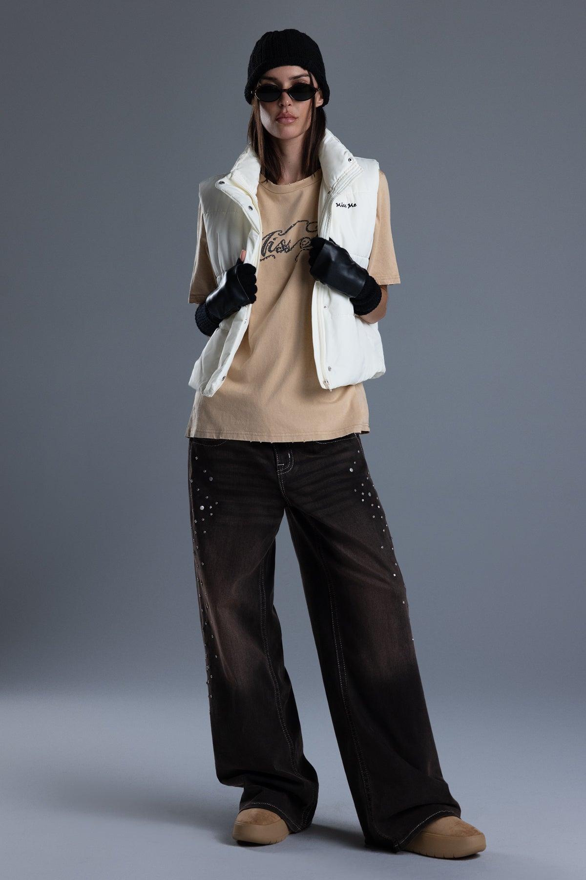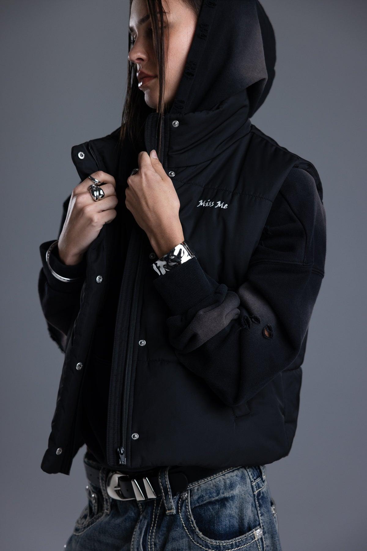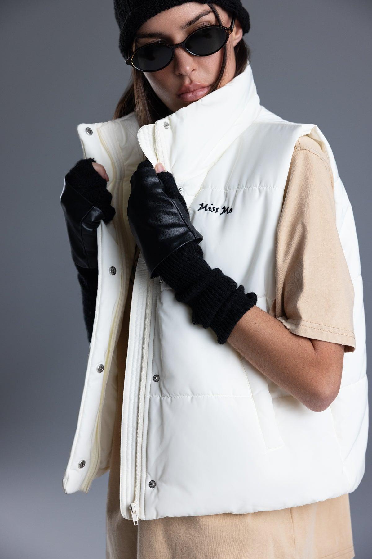 Boxy fit, cropped puffer vest- Smooth quilted construction- Soft woven interior lining- Embroidered Miss Me script- Slip pocket design- Snap placket with zip-front closure- Stand-collar necklineModel is wearing size: 25Model Measurements:Height: 5’8”Bust: 32BWaist: 25”Hips: 35”Fabric Content: Self: 100% Polyester / Lining: 100% PolyesterCare: Gentle machine wash inside-out with like colors in cold water. Tumble dry low.Style No. BMJ0075T-BLACK, BMJ0075T-OFF WHT