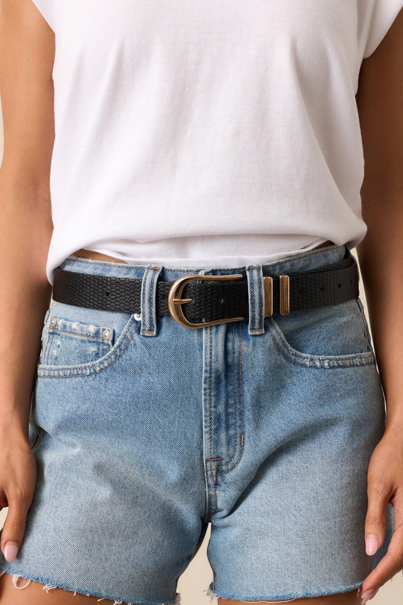 Take your style to the next level with our Desert Radiance Black Woven Textured Belt! Made with bold, woven patterns, this belt will add a touch of adventure to any outfit. Not only does it elevate your fashion sense, but it also provides a secure hold for your pants. Embrace the risk-taker in you and step out with confidence! This black woven belt features a gold hardware buckle, a black inside, a woven texture and two gold belt loops. 100% Polyurethane Belt Measures 43.5" Unbuckled Imported