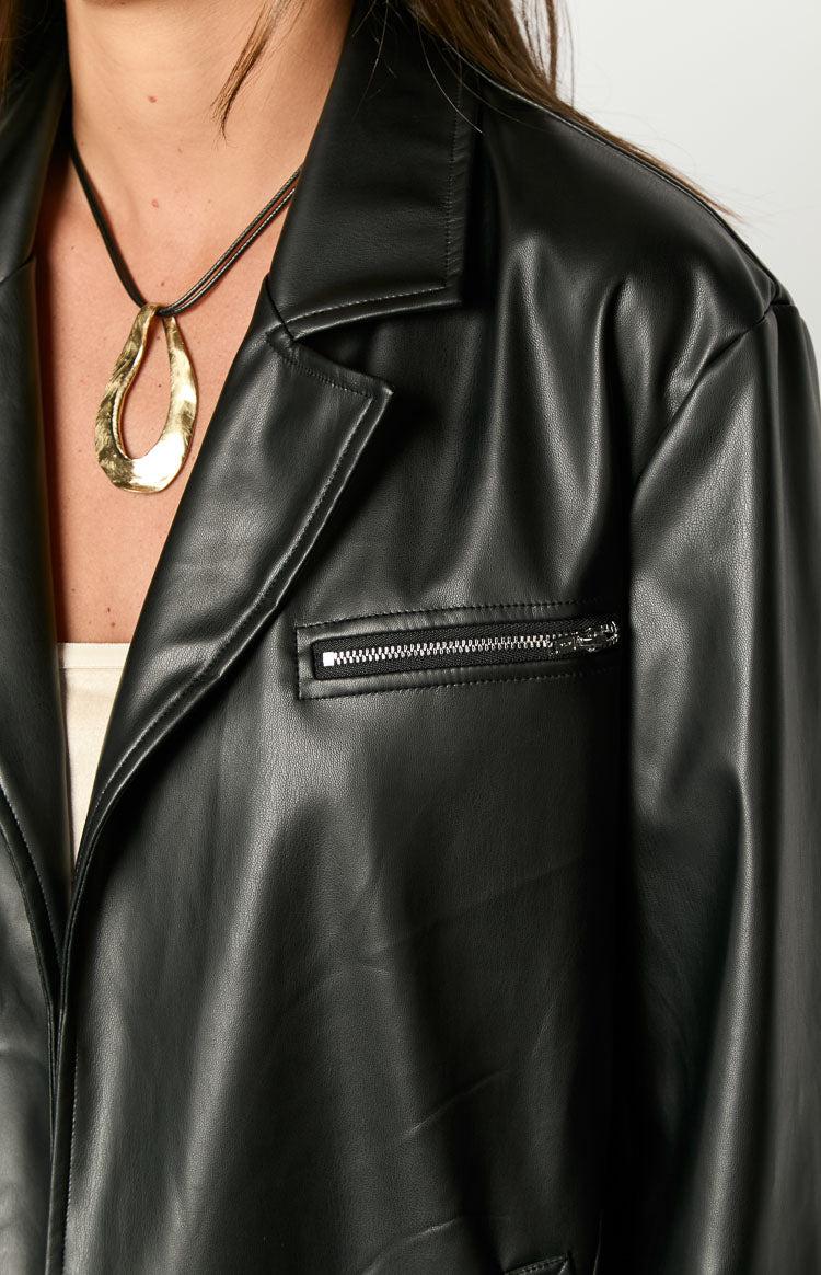 Black PU JacketHow to style:Radiate cool girl vibes in our Desi jacket. This faux leather jacket is an essential for any girls wardrobe! Perfect for date night or drinks with the girls. Pair with jeans and a tee for a more casual look or a skirt and heels to level up your style. Features: Two front pockets Collared neckline Silver zip detailing on sleeve and chest Blazer style jacket Fully lined Heavy weight Non stretch material
