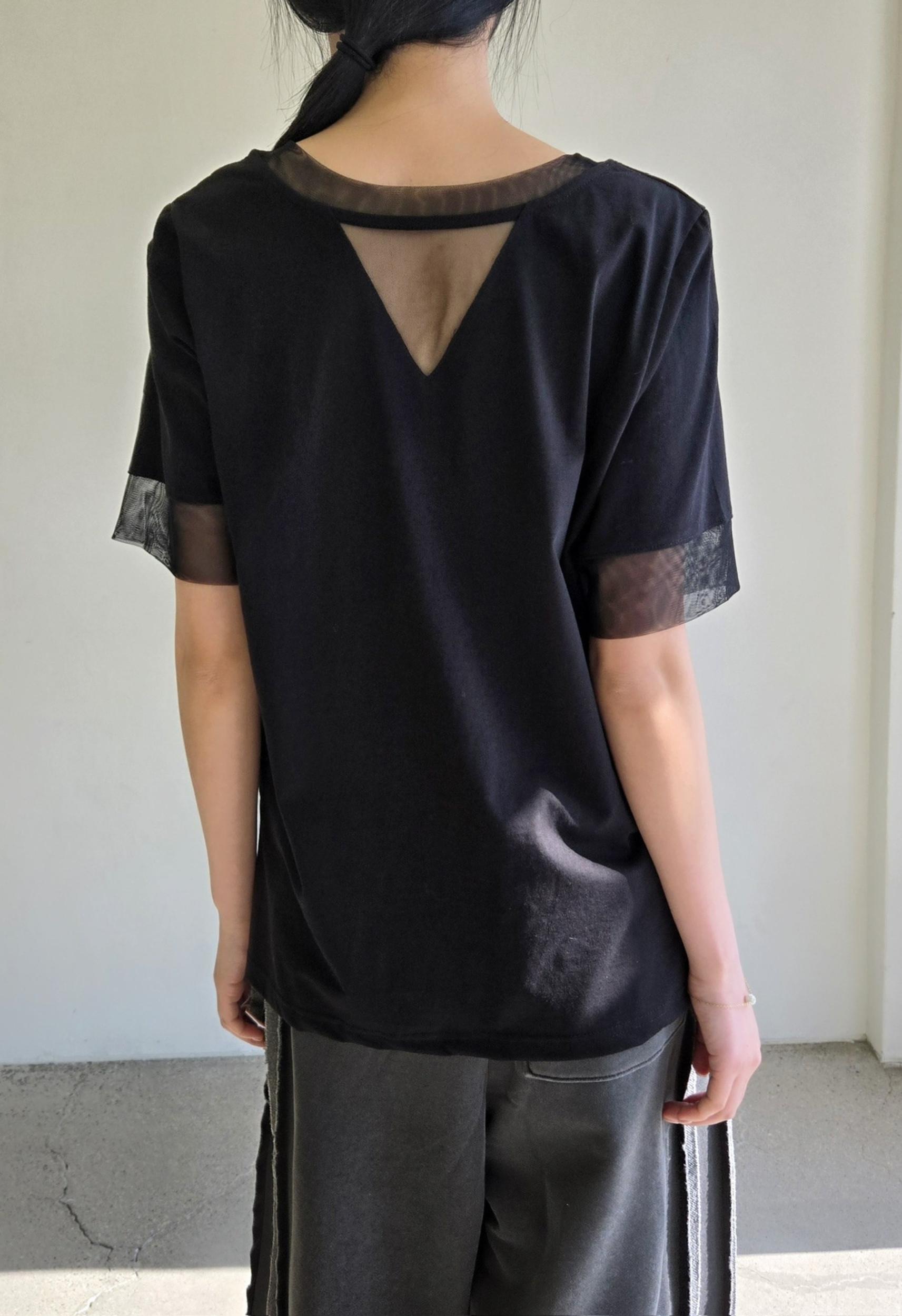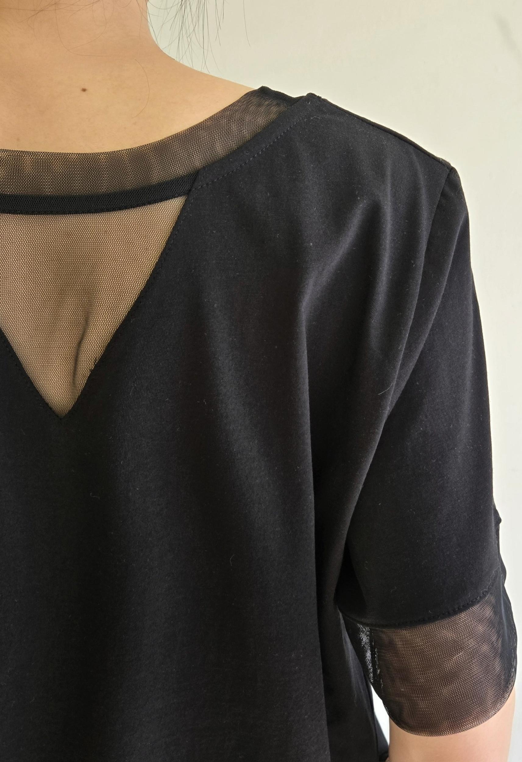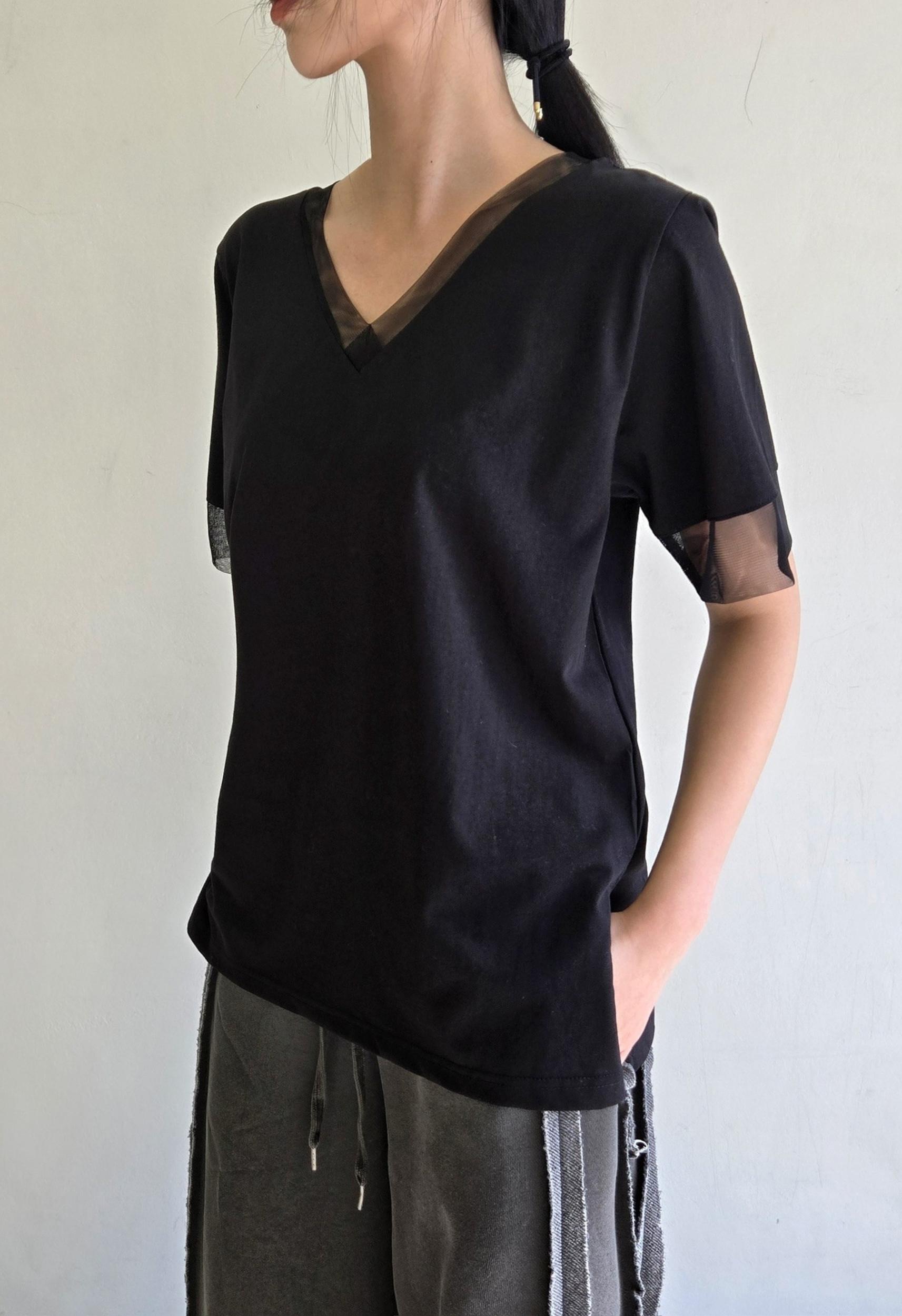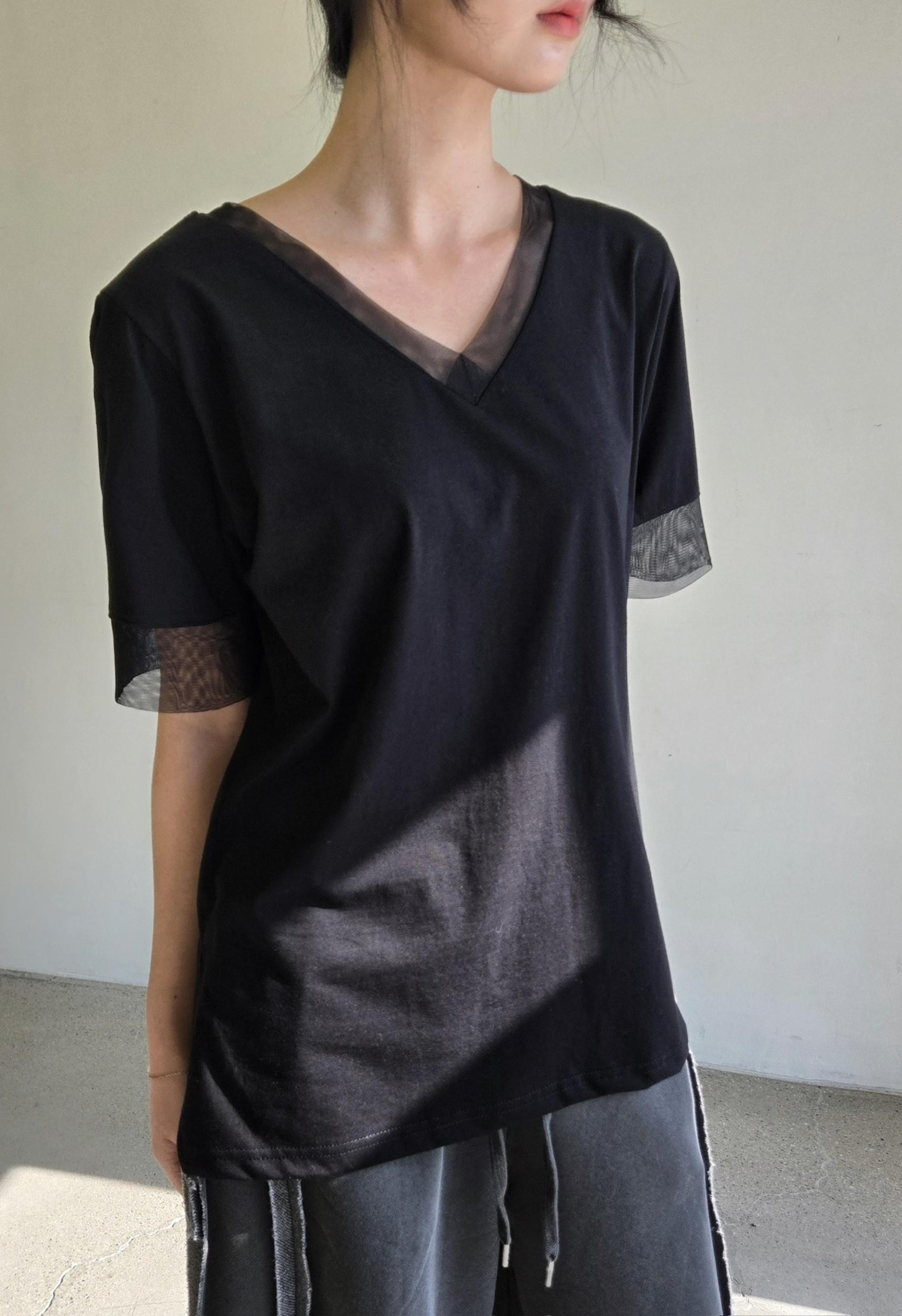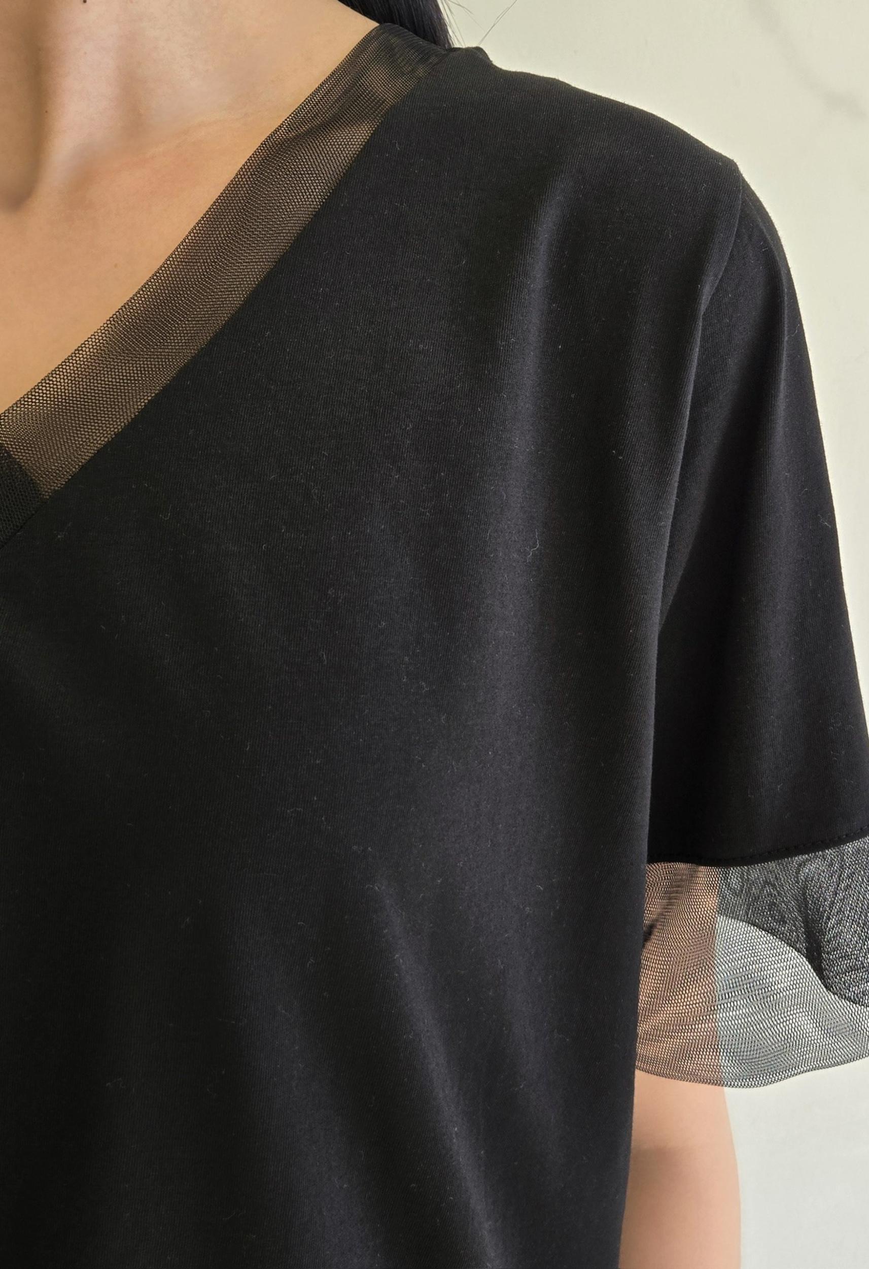 Size: O/S Color: Black V-Neck T-Shirt Short Sleeve Mesh Detail on Sleeves and Neck Oversized Fit 95% Cotton 5% Spandex Dry Clean Recommended
