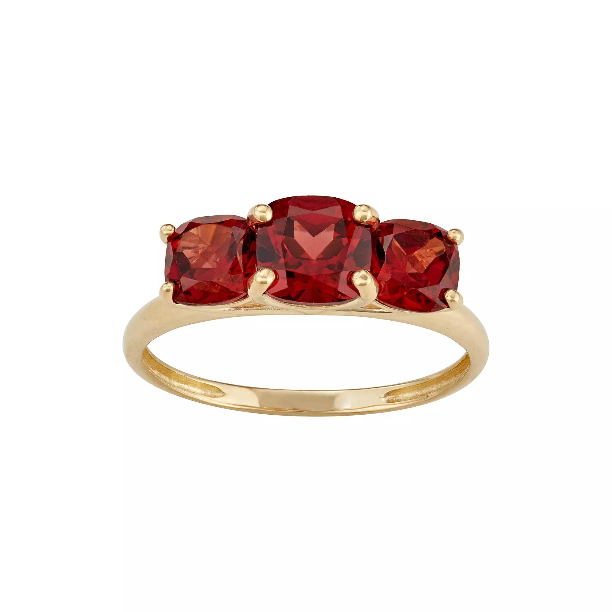 Decorated with a trio of cushion-cut gemstones, this 10k gold ring is an eye-catching accent to your favorite attire. Decorated with a trio of cushion-cut gemstones, this 10k gold ring is an eye-catching accent to your favorite attire. Width: 6 mm Metal: 10k gold Finish: polished Packaging: boxed CUBIC ZIRCONIA DETAILS Center stone size: 6 mm x 6 mm Shape: cushion cut Setting: prong Please note, a signature may be required upon delivery. Size: 8. Gender: female. Age Group: adult.