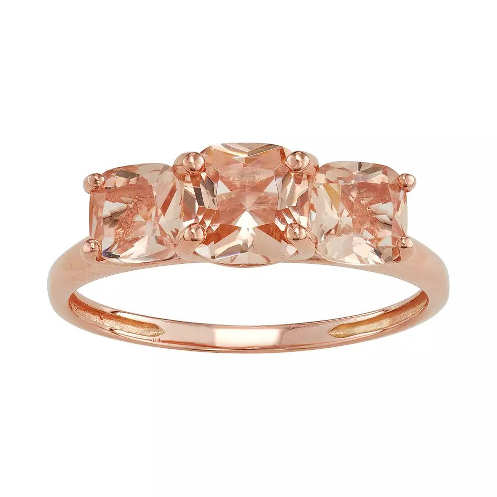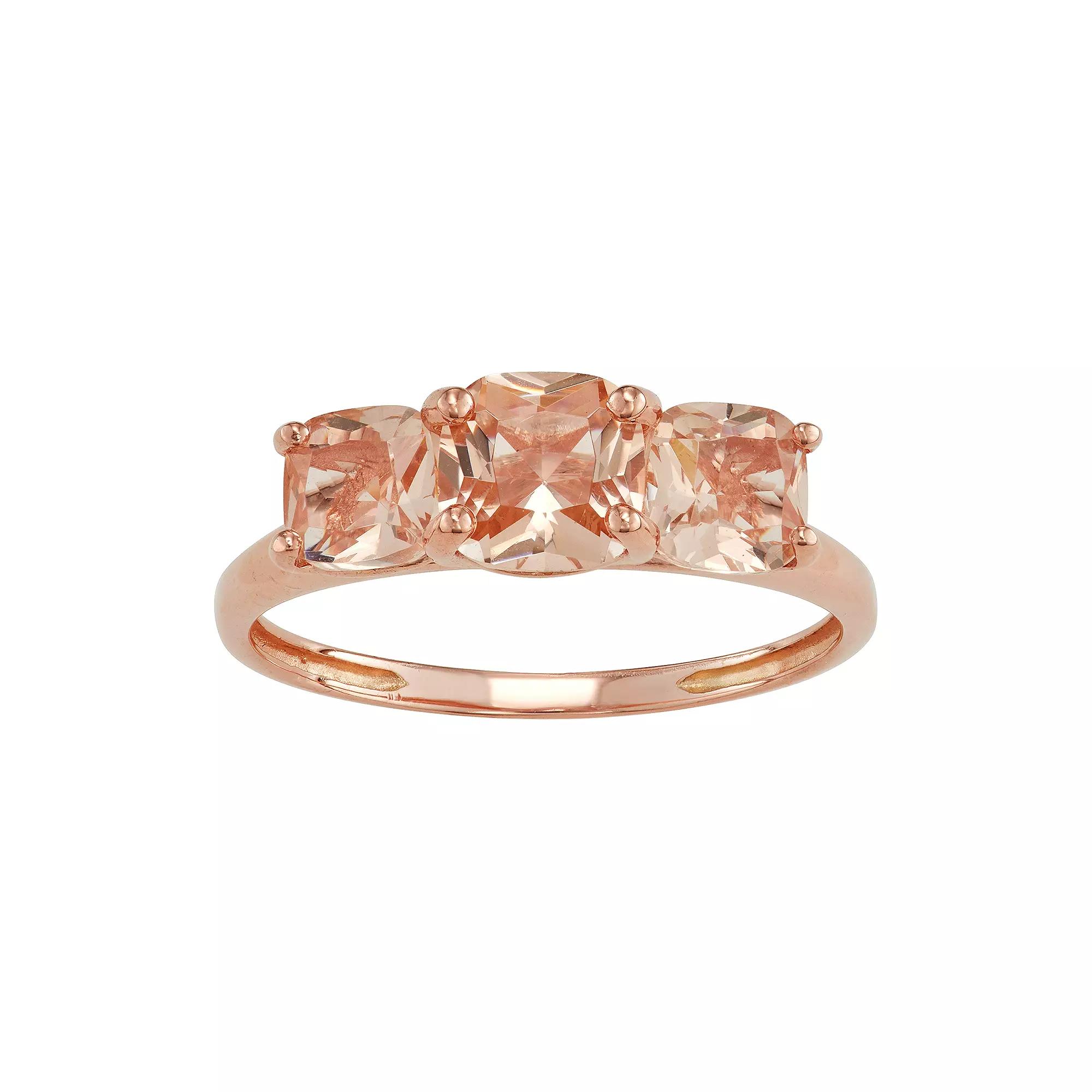 Add scintillating style to your ensemble with this simulated morganite 3-stone ring. Add scintillating style to your ensemble with this simulated morganite 3-stone ring. Width: 6 mm Metal: 10k rose gold Packaging: boxed STONE DETAILS Stone type: simulated morganite Total weight: 2 1/3 ct. Center stone size: 6 mm x 6 mm Shape: cushion cut Setting: prong Gemstones may have been treated to enhance their appearance. Special care may be required. Size: 7. Color: Pink. Gender: female. Age Group: adult.