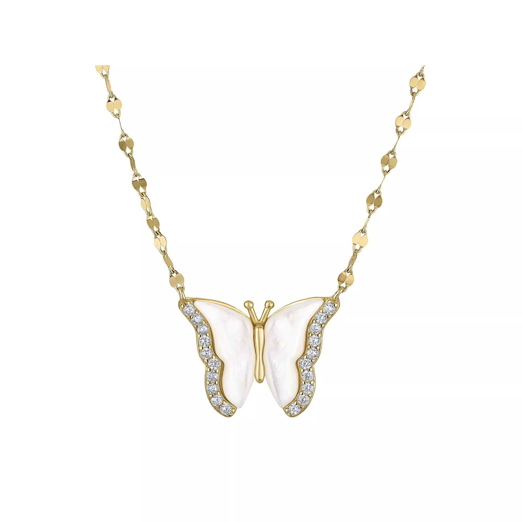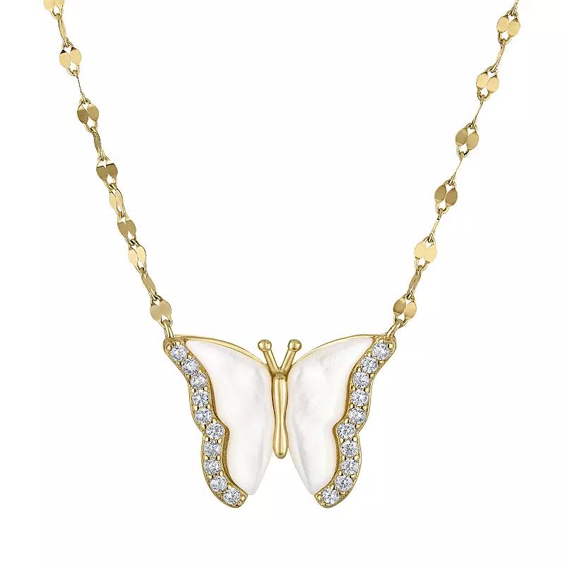 Add a whimsical touch to your ensemble with this dainty mother of pearl butterfly pendant necklace from Designs by Gioelli. Click on this JEWELRY & WATCHES GUIDE to learn about fit, styles, materials and more! Add a whimsical touch to your ensemble with this dainty mother of pearl butterfly pendant necklace from Designs by Gioelli. Click on this JEWELRY & WATCHES GUIDE to learn about fit, styles, materials and more! FEATURES Pendant size: 20.5 mm x 16.5 mm Chain length: 18 Chain type: Singapore Clasp: lobster-claw Nickel free Metal: sterling silver Plating: 14k gold Finish: polished Packaging: boxedSTONE DETAILS Stone type: mother of pearl Total weight: 4 ct. Center stone size: 14 mmx 5 mm Shape: free form Setting: glue/epoxy Gemstones may have been treated to enhance their appearance. Special care may be required. Please visit our Gemstone Treatment & Special Care Guide for more information. Color: Gold Tone. Gender: female. Age Group: adult.