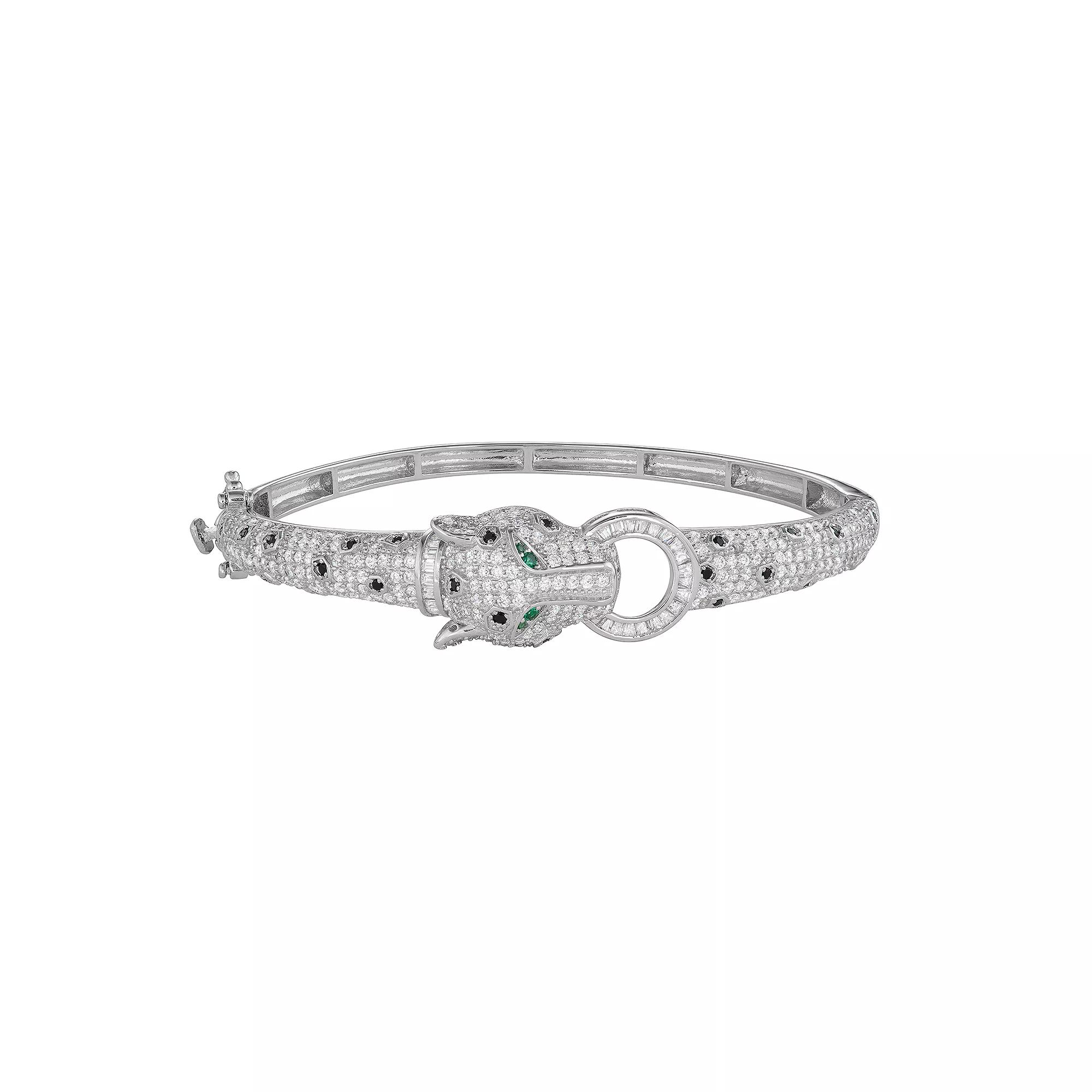 A panther motif adorned with an array of cubic zirconia stones makes this bangle bracelet a fascinating find. A panther motif adorned with an array of cubic zirconia stones makes this bangle bracelet a fascinating find. BRACELET DETAILS Length: 7.5 in. Metal: sterling silver Plating: rhodium Packaging: boxed CUBIC ZIRCONIA DETAILS Total weight: 7 ct. Shape: round Color: green, black, white Setting: pave, prong Gemstones may have been treated to enhance their appearance. Special care may be required. Size: One Size. Gender: female. Age Group: adult.