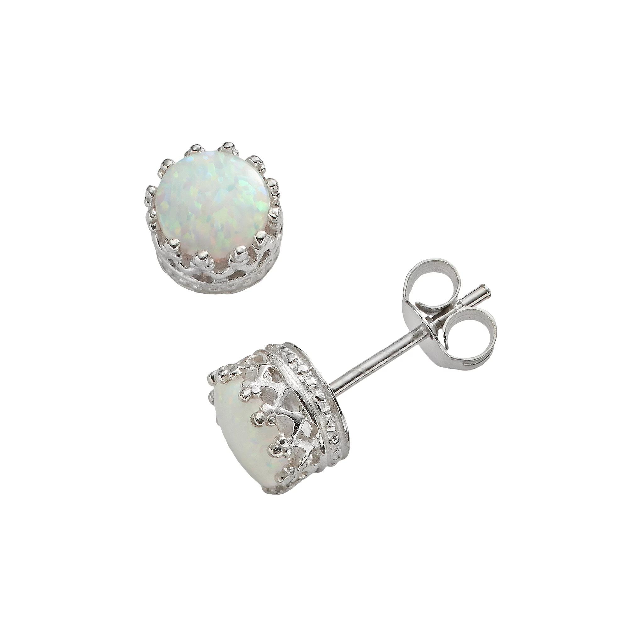 These sterling silver stud earrings feature beautiful lab-created opal stones. EARRING DETAILS Diameter: 6 mm Backings: post Metal: rhodium-plated sterling silver Features: open-worked settingSTONE DETAILS Stone type: lab-created opal Cut: round Setting: prong Size: One Size. Color: White. Gender: female. Age Group: adult.