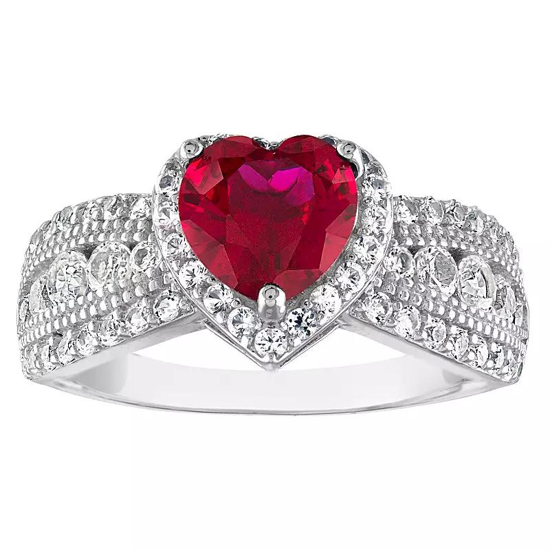 Accessorize in style with this Designs by Gioelli Sterling Silver Lab-Created Ruby Heart Ring. Click on this JEWELRY & WATCHES GUIDE to learn about fit, styles, materials and more! Accessorize in style with this Designs by Gioelli Sterling Silver Lab-Created Ruby Heart Ring. Click on this JEWELRY & WATCHES GUIDE to learn about fit, styles, materials and more! FEATURES Width: 9.5 mm Shank style: traditional Band fit: flat Nickel free Metal: sterling silver Plating: rhodium Finish: polished Packaging: boxedSTONE DETAILS Stone type: lab-created ruby Total weight: 2 1/2 ct. Shape: heart Setting: prong Gemstones may have been treated to enhance their appearance. Special care may be required. Please visit our Gemstone Treatment & Special Care Guide for more information. Size: 6. Color: White. Gender: female. Age Group: adult.