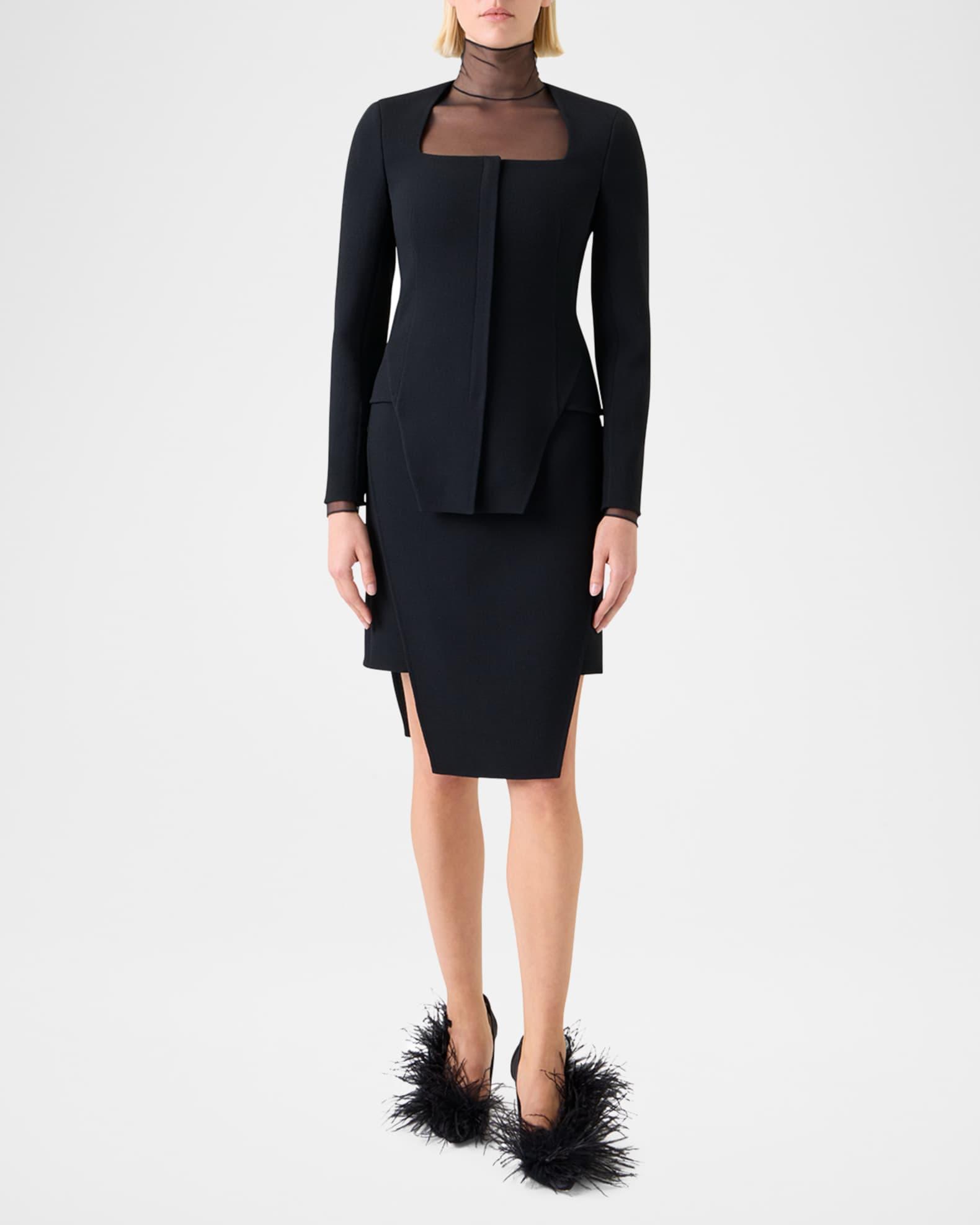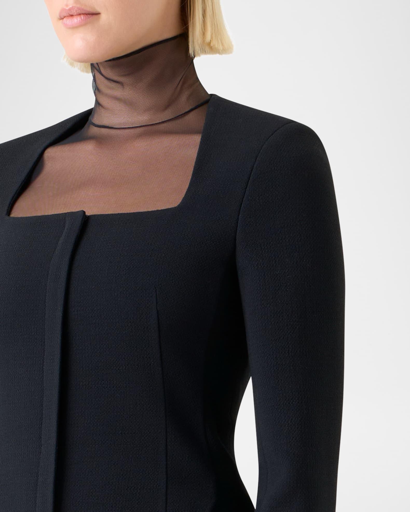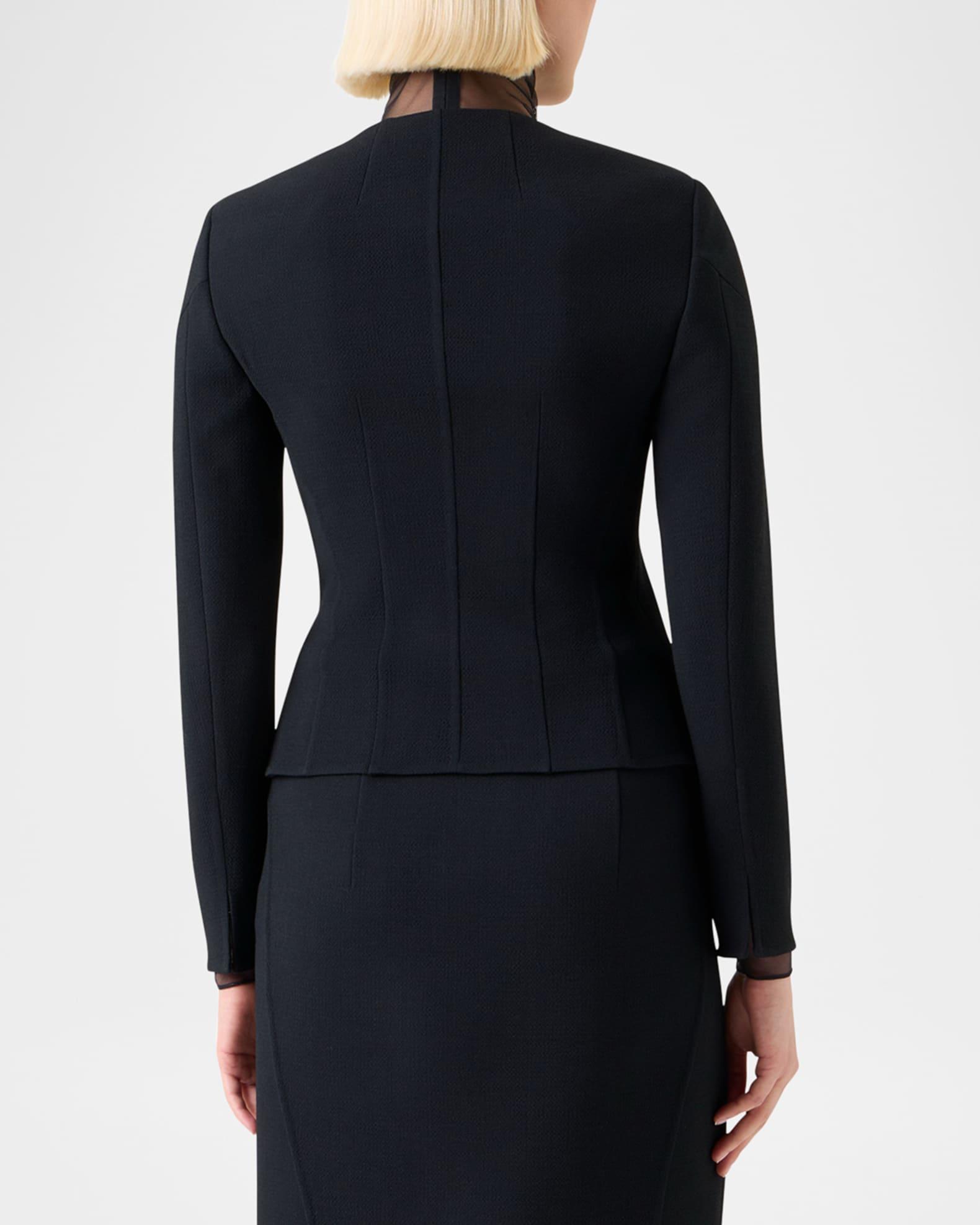Akris "Desiree" double-face wool trapezoid jacket Square neckline Long sleeves Fitted High-low hem Concealed front zip Wool/elastane Lining: Elastane/silk Dry clean Imported