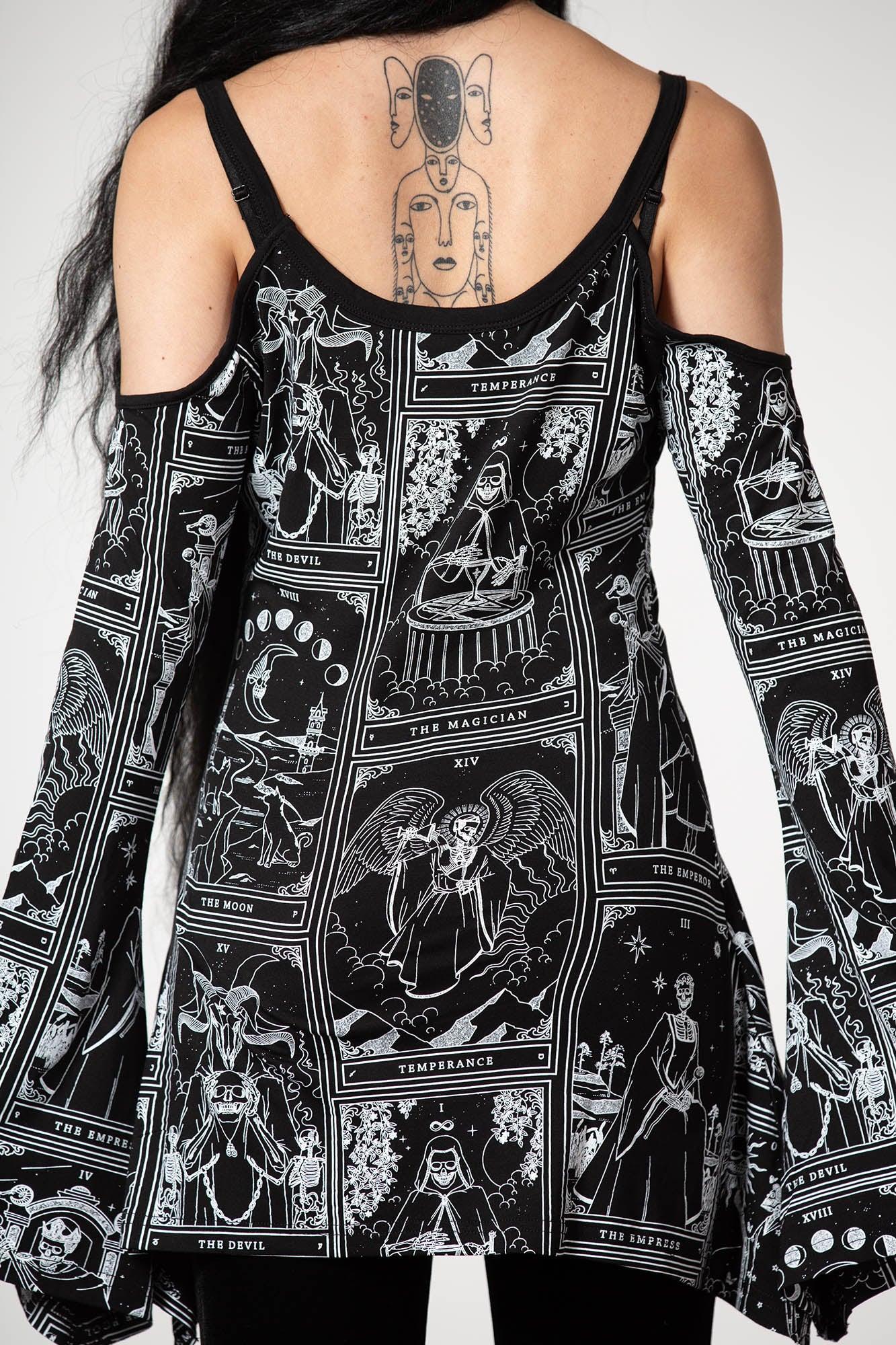 DESTINY.- Soft, stretch cotton fabric.- Statement, contrast custom print.- Cold shoulder.- Long, bell sleeves.- Long line.- Hanky hem.- Fitted.Model is 5ft 3 and wears a size XS.with KILLSTAR branding, 95% Viscose 5% Elastane.