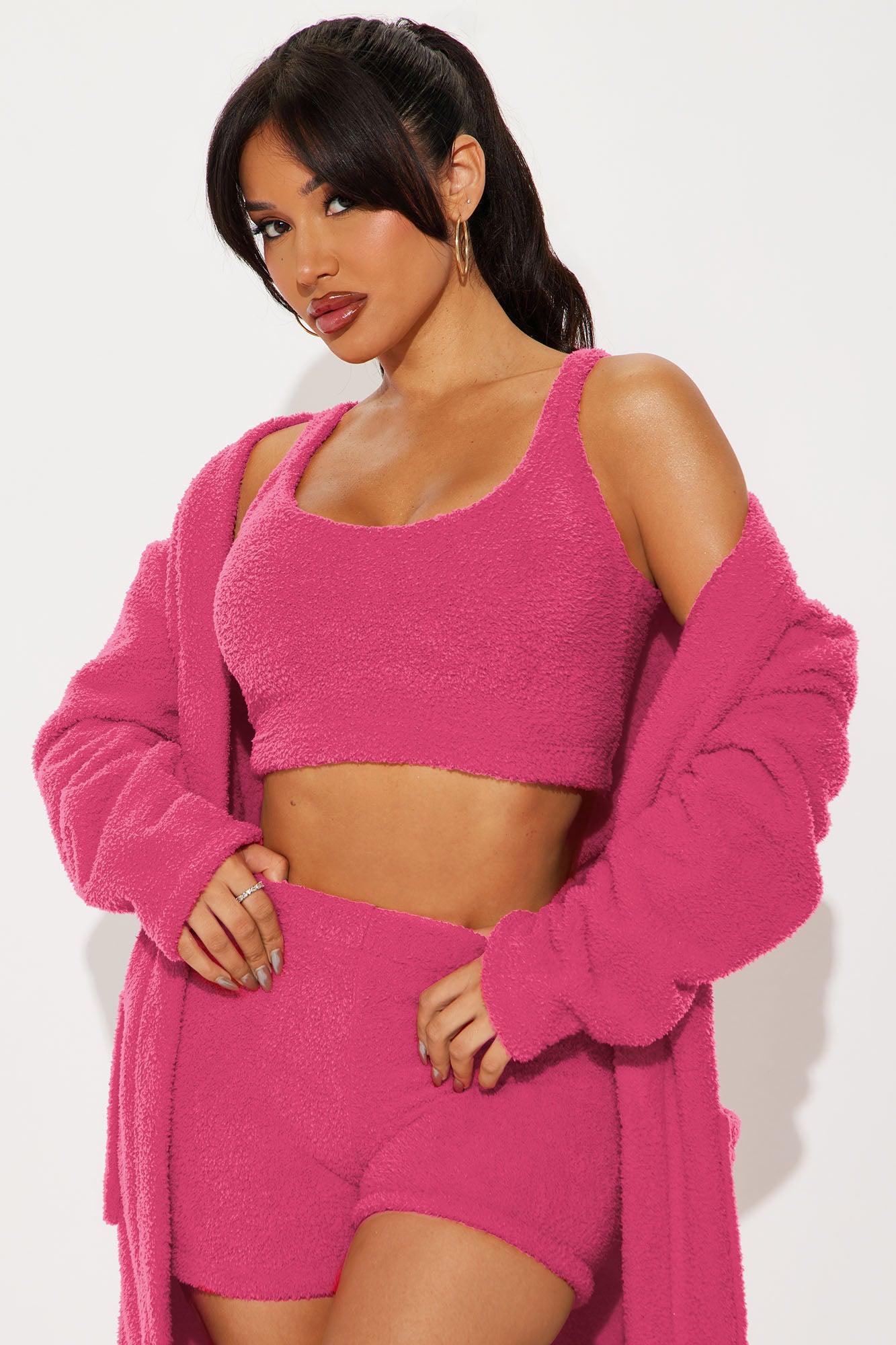 Available In Black And Hot Pink. 3 Piece Ensemble Short Cropped Tank Top Shorts Elastic Waistband Tie Waist Robe Long Sleeve Pockets Final Sale 96% Polyester 4% Spandex Imported