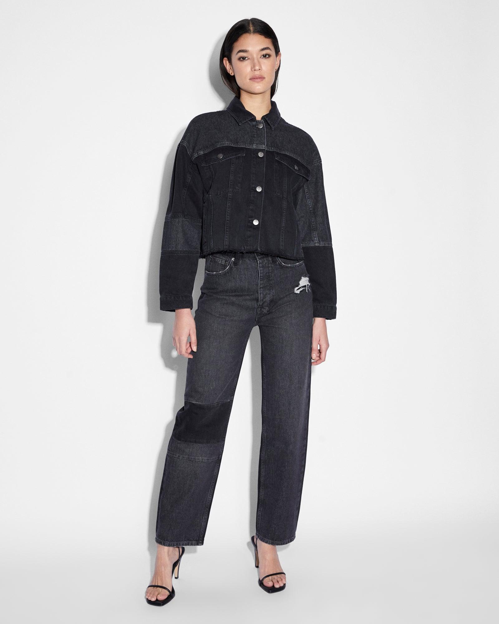 The Destiny Jacket Noir is a relaxed fit jacket made from premium European rigid denim in dusted black wash. This style features panelling details, tapered cuffed sleeves, front pockets, button closure, cropped length and raw-cut hem. Pair with the 'Brooklyn Jean Destiny Noir' for a denim on denim look.Cool machine wash with like colours, wash inside out, do not bleach, remove promptly after wash, do not tumble dry, cool iron on reverse, do not iron directly onto prints or metal hardware, colour may transfer onto other garments and upholstery.