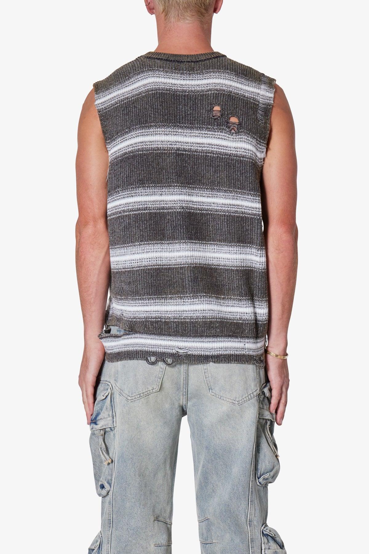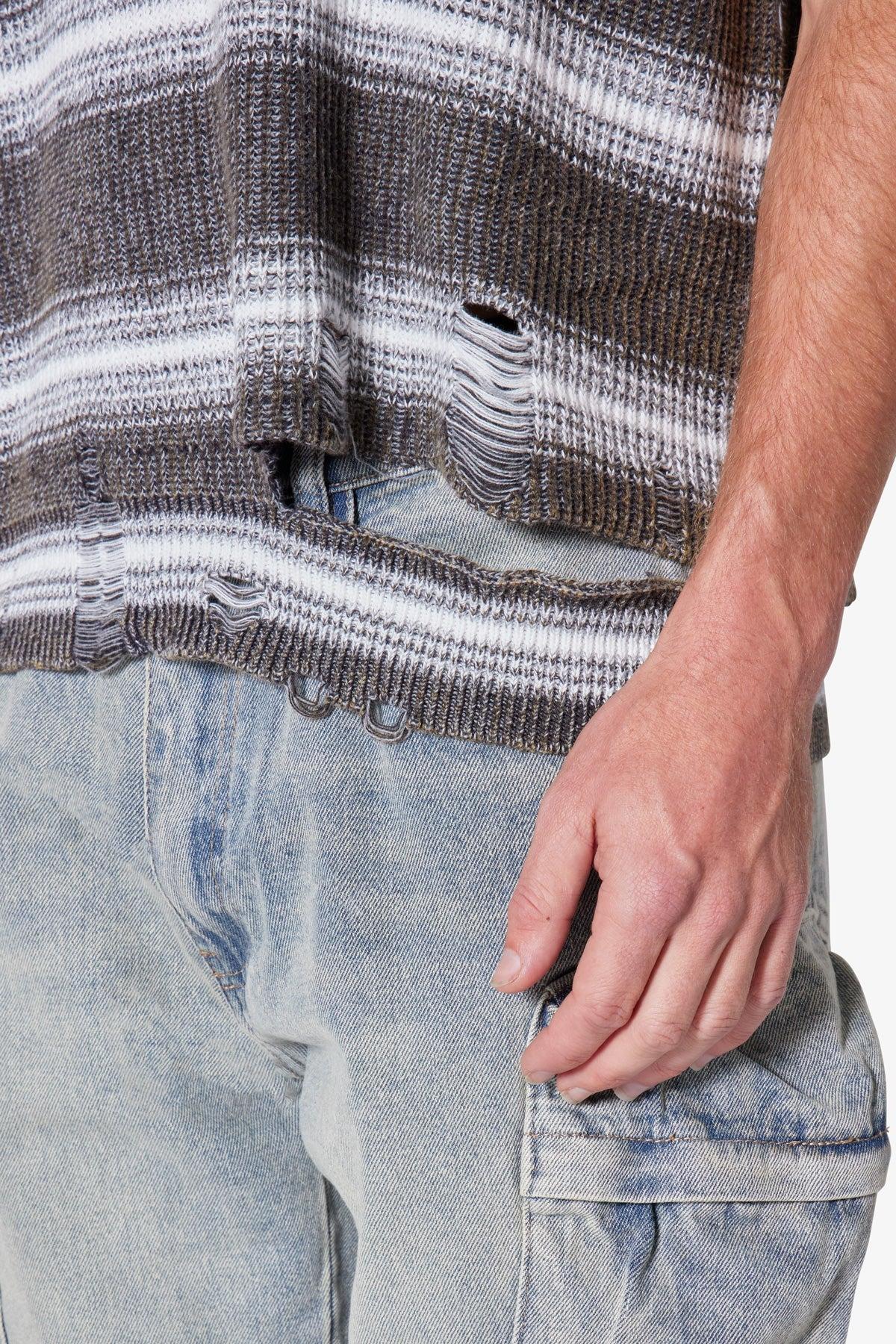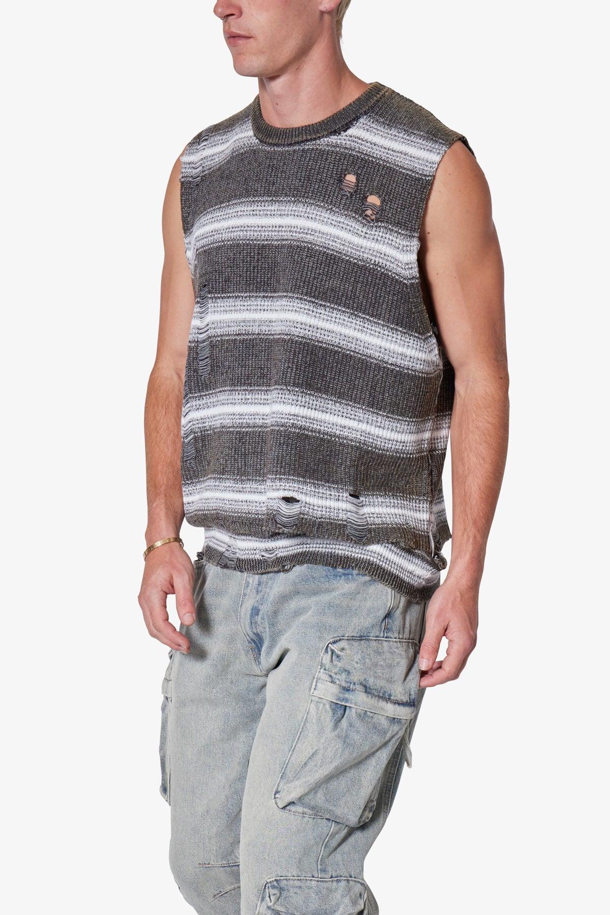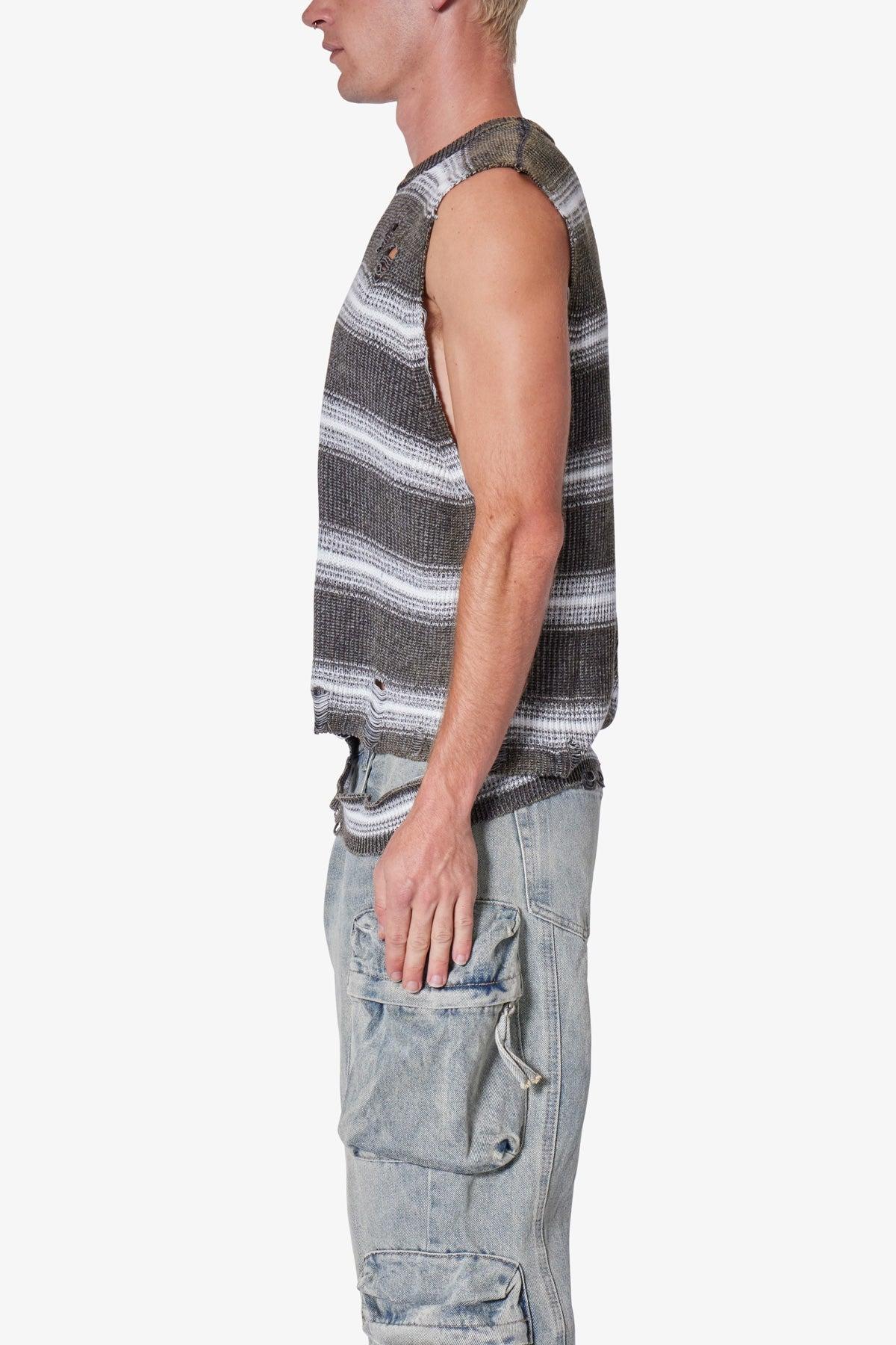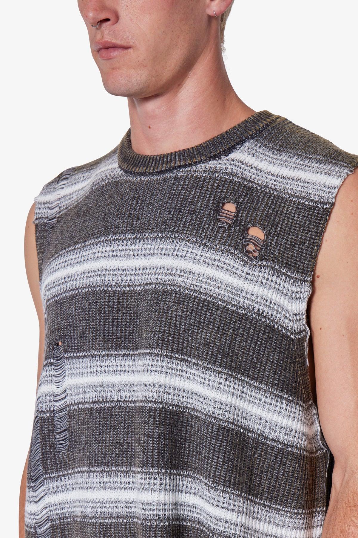 the Destroyed Pullover Shirt features a flat hem line, raw edges at the shoulder for a sleeveless body, distressing details throughout, and is finished in a heavy wash on a striped cotton ribbed fabric. details relaxed fit 100% cotton model is 6’1, 140 lbs and wears a size medium