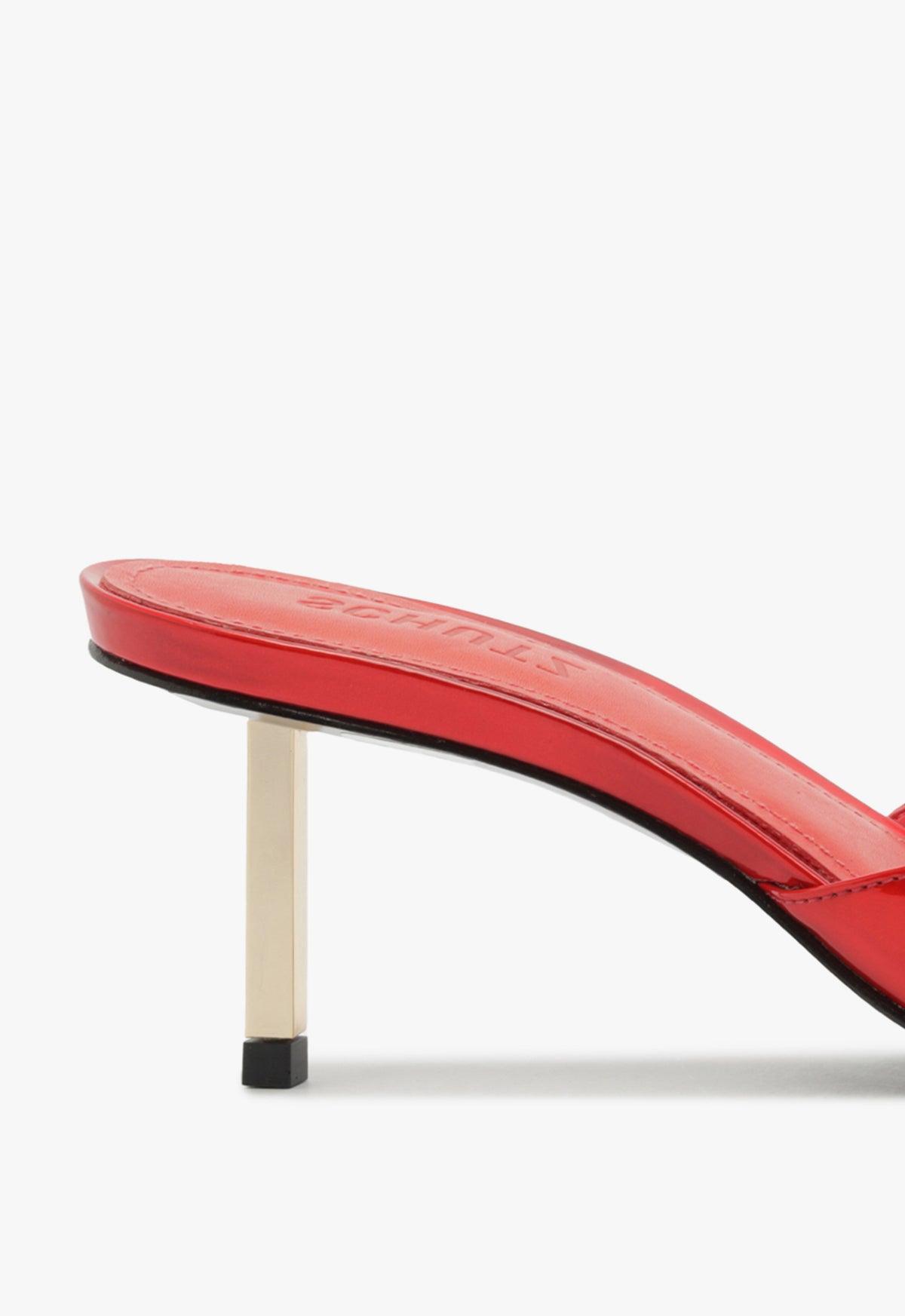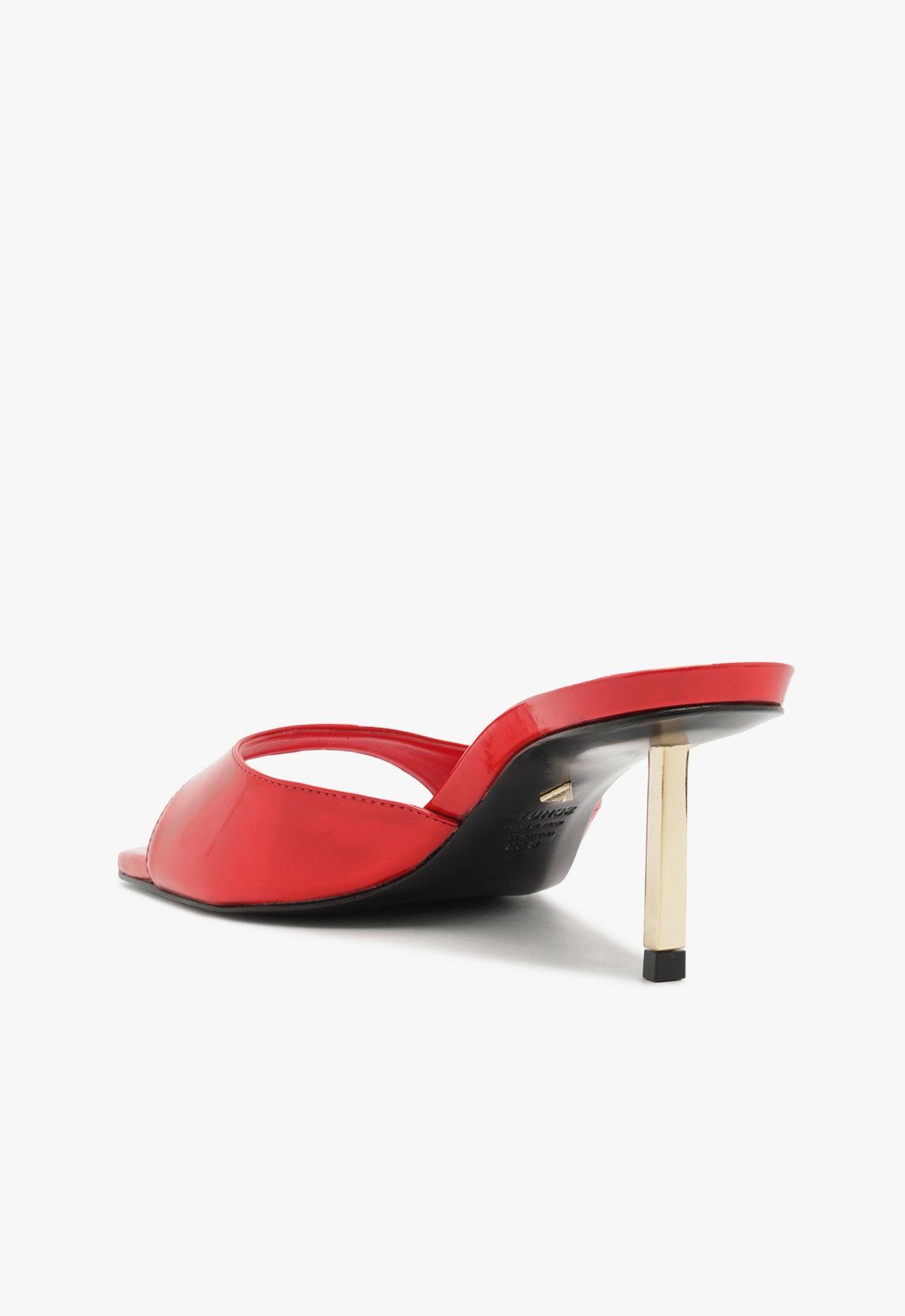Step into pure allure with this bold, sleek Dethalia sandal. The striking strap wraps your foot with style, while the daring open-toe design teases just the right amount of skin. Elevated by a gleaming gold-tone mid-heel, this sandal commands attention and radiates confidence with every step. Whether you're making an entrance at an event or owning the streets, these heels are the ultimate statement for the fearless fashionista. Materials: Leather Upper | Leather OutsoleHeel Type: Mid HeelHeel Style: StilettoToe Style: Square ToeClosure Type: Slip OnCounter Type: OpenedHeel Height: 2.7 In | 68 mmSKU: S2207700010008
