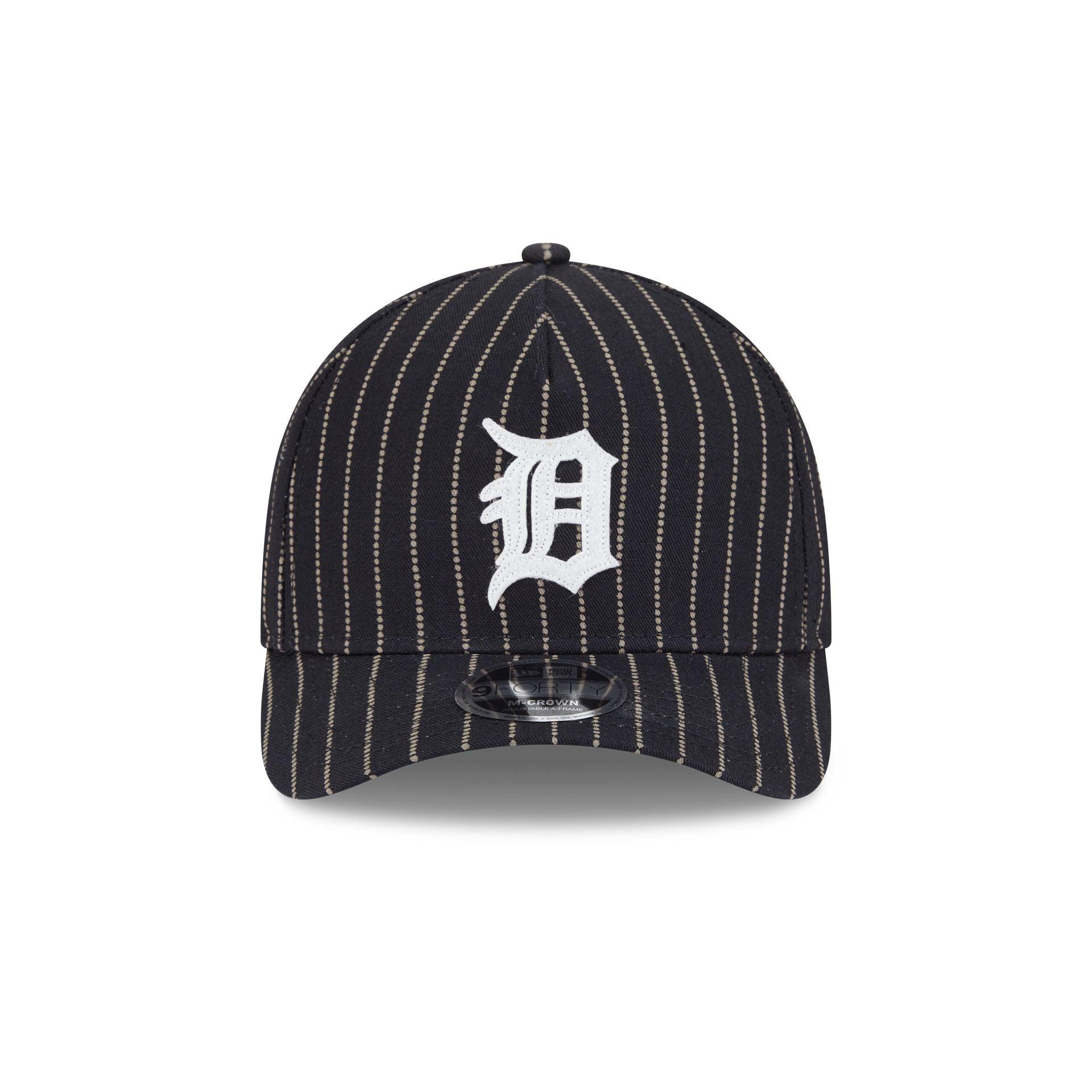 The Detroit Tigers Dotted Pinstripe 9FORTY M-Crown A-Frame Adjustable Cap features an embroidered Tigers Cooperstown logo at the front panels against a specialty Japanese milled selvedge denim from Three Looms Japan Fabrics throughout the cap. Additional details include a team wordmark above an adjustable belt closure at the rear and a gray undervisor.